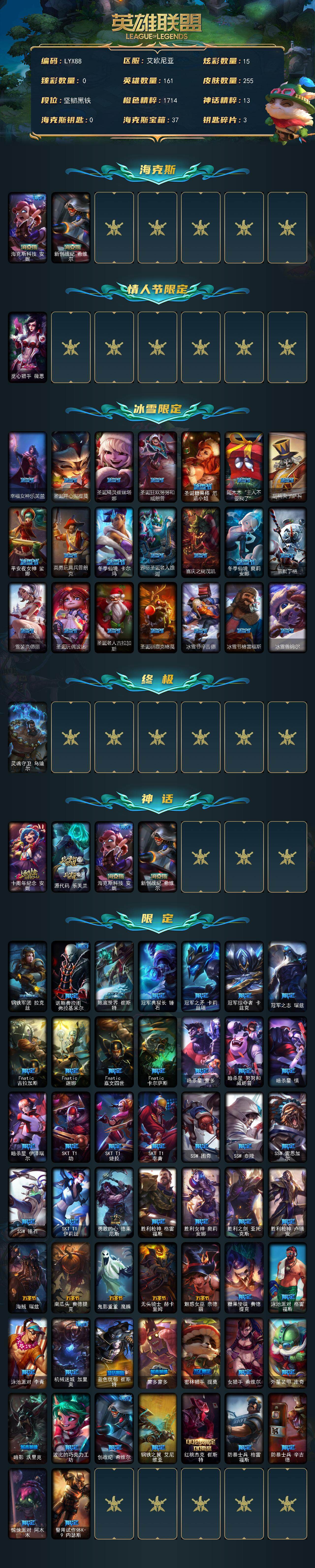 【特价出售/店主推荐】未定级段位-161英雄-255皮肤-15炫彩-1终极-4神话-73限定-17传说-73史诗 【海克斯皮肤】:海克斯科技安妮,新创战纪希维尔 【情人节限定】:觅心猎手薇恩 【冰雪限定】:幸福女神乐芙兰,圣诞开心鬼提莫,圣诞精灵崔丝塔娜,圣诞狂欢努努和威朗普,圣诞糖果棒厄运小姐,阿