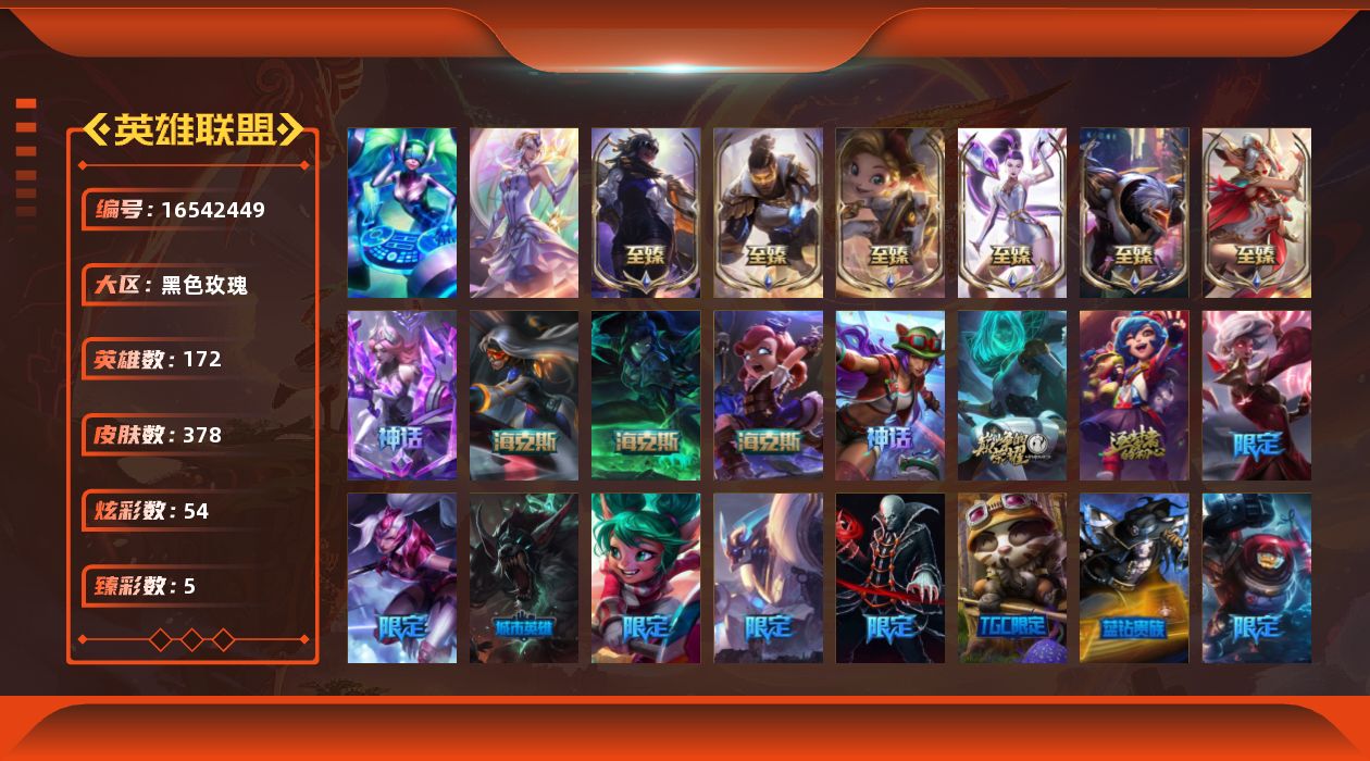 [16542449]【特价出售/店主推荐】 未定级段位-172英雄-378皮肤-54炫彩-2终极-13神话-56限定-38传说-83史诗 【热门头像】:爱情之歌头像,玉剑传说寒潭夭夭头像,玉剑传说苍鸾头像 【至臻皮肤】:至臻奥术师佐伊,至臻kdaallout卡莎,至臻真实伤害赛娜,至臻未来战士卢锡安,至臻源计划阴劫,至臻神凰行者烈羽焰凰霞 【臻彩皮肤】:天龙之子卡莎飞龙乘云,冠军之箭艾希凯旋圣装,泳池派对奥莉安娜优雅珠光鲸,魔女阿卡丽虚荣,净雪之月莫甘娜冬虹 【海克斯皮肤】:海克斯科技安妮,新创战纪希维尔,摄魂使者薇恩 【情人节限定】:甜心宝贝娑娜,觅心猎手薇恩,觅心之翼奎因 【冰雪限定】:幸福女神乐芙兰,圣诞开心鬼提莫,圣诞精灵崔丝塔娜,圣诞狂欢努努和威朗普,阿木木“主人不要我了”,平安夜女神娑娜,英勇玩具兵普朗克,邪恶圣诞老人维迦,喜庆之树茂凯,圣诞老人古拉加斯,圣诞驯鹿克格莫,冰雪节辛吉德 【终极皮肤】:大元素使拉克丝,dj娑娜 【神话皮肤】:十周年纪念安妮,源代码乐芙兰,十五周年纪念希维尔,水晶圣骑蕾欧娜,海克斯科技安妮,摄魂使者薇恩,新创战纪希维尔,至臻真实伤害赛娜,至臻奥术师佐伊,至臻kdaallout卡莎,至臻神凰行者烈羽焰凰霞,至臻未来战士卢锡安,至臻源计划阴劫 【限定皮肤】:诺斯费拉图弗拉基米尔,冠军之矛卡莉丝塔,fnatic库奇,暗杀星蒙多,暗杀星努努和威朗普,sktt1李青,sktt1薇恩,ssw辛吉德,ssw图奇,sktt1卡莉丝塔,sktt1娜美,勇敢的心德莱厄斯,电玩女神阿狸,星之守护者伊泽瑞尔,暗裔英雄盖伦,胜利之树茂凯,胜利女神奥莉安娜,胜利之剑亚托克斯,胜利呛神卢锡安,南瓜头费德提克,鬼影重重魔腾,魅惑女巫崔丝塔娜,泳池派对奥莉安娜,泳池派对厄运小姐,泳池派对格雷福斯,泳池派对雷克顿,泳池派对蕾欧娜,泳池派对塔莉垭,泳池派对佐伊,蓝色忧郁崔斯特,密林猎手提莫,破空呛骑孙悟空,暗影沃里克,波比的巧克力工坊,勇者阿狸,勇者奈德丽,钢铁之翼艾尼维亚,征服者卡尔玛,防暴机器人布里茨,防暴天使凯尔,海之歌奈德丽 【传说皮肤】:邪鸦魅影乐芙兰,血石领主弗拉基米尔,大天使长米迦勒凯尔,战场女武神凯尔,源计划林易,约德尔国队长提莫,合金巨兽努努和威朗普,女皇艾希,源计划联合艾希,恶魔之刃泰达米尔,至尊魔女莫甘娜,绅士科加斯,律政大亨蒙多,电玩女神娑娜,冰霜之刃艾瑞莉