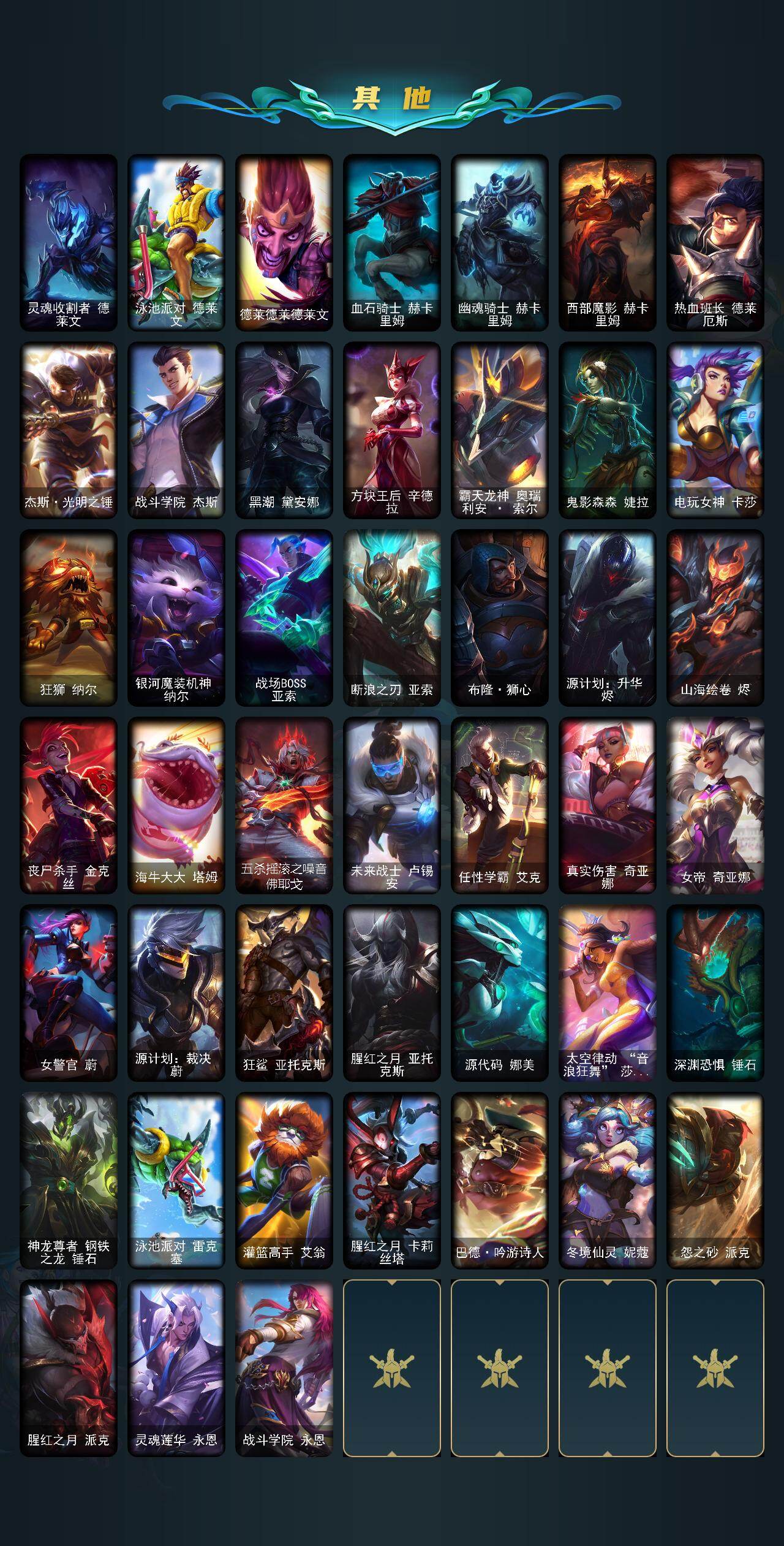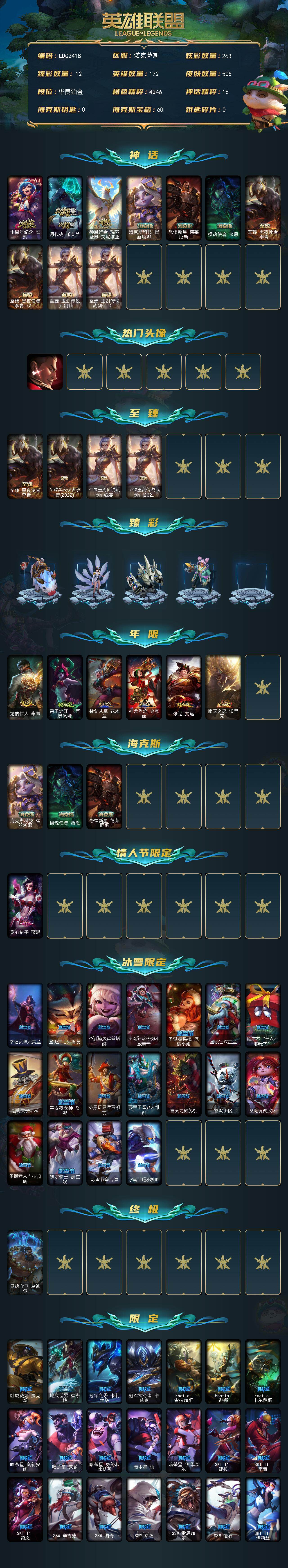 【ldc2418】172英雄/505皮肤/1终极/10神话/93限定/12臻彩/263炫彩/55传说/123史诗/铂金/十周年纪念安妮/源代码乐芙兰/神凰行者瑞羽圣凰艾尼维亚/海克斯科技崔丝塔娜/恐惧新星德莱厄斯/摄魂使者薇恩/至臻黑夜使者李青/至臻黑夜使者李青2022/至臻玉剑传说武剑仙/至臻玉剑传说武剑仙2022/觅心游侠卢锡安头像/至臻黑夜使者李青2022/至臻玉剑传说武剑仙锐雯/至臻玉剑传说武剑仙2022/无畏骑士瑟庄妮赤子初心/偶像歌手阿狸极地雪莲/霸天巨兽雪崩墨菲特/玉剑传说神机花火青竹/灵魂莲华亚索霜见之时/水晶玫瑰斯维因纯洁花蕾/红莲之刃锐雯/龙的传人李青/碧玉之牙卡西奥佩娅/替父从军花木兰/神龙烈焰金克丝/张辽文远/南天之怒沃里克/觅心猎手薇恩/幸福女神乐芙兰/圣诞开心鬼提莫/圣诞精灵崔丝塔娜/圣诞狂欢努努和威朗普/圣诞糖果棒厄运小姐/圣诞狂欢基兰/阿木木“主人不要我了”/胡桃夹子萨科/平安夜女神娑娜/英勇玩具兵普朗克/邪恶圣诞老人维迦/喜庆之树茂凯/雪默丁格/圣诞玩偶波比/圣诞老人古拉加斯/魄罗骑士瑟庄妮/冰雪节辛吉德/冰雪节玛尔扎哈/灵魂守卫乌迪尔/卧虎藏龙贾克斯/地底世界崔斯特/冠军之矛卡莉丝塔/冠军掠夺者卡兹克/fnatic古拉加斯/fnatic迦娜/fnatic卡尔萨斯/暗杀星奥莉安娜/暗杀星蒙多/暗杀星努努和威朗普/暗杀星慎/暗杀星伊泽瑞尔/sktt1婕拉/sktt1李青/sktt1薇恩/ssw辛吉德/ssw图奇/ssw泰隆/ssw雷恩加尔/ssw锤石/sktt1伊莉丝/ssg纳尔/f李青/edg格雷福斯/edg佛耶戈/edg佐伊/edg厄斐琉斯/edg悠米/安妮梦游仙境/电玩女神厄运小姐/暗裔英雄盖伦/胜利呛神格雷福斯/胜利之剑亚托克斯/胜利呛神卢锡安/胜利机器人布里茨/胜利女神瑟庄妮/胜利之王泰达米尔/胜利巨口克格莫/南瓜头费德提克/鬼影重重魔腾/鬼影森森茂凯/无头骑士赫卡里姆/死亡誓约劫/魅惑女巫莫甘娜/魅惑女巫奈德丽/泳池派对格雷福斯/泳池派对蕾欧娜/泳池派对李青/泳池派对普朗克/机械迷城加里奥/蓝色忧郁崔斯特/密林猎手提莫/女猎手希维尔/外星装甲库奇/暗影沃里克/野兽猎人泰达米尔/波比的巧克力工坊/勇者奈德丽/都铎王朝图奇/御星魔矢艾希/钢铁之翼艾尼维亚/红桃杰克崔斯特/制胜金靴李青/防暴机器人布里茨/防暴士兵辛吉德/防暴天使凯尔/警用试作体k9内瑟斯/铁哥们儿奥拉夫/地狱之门卫士加里奥/魔幻卡牌崔斯特/战地机甲厄加特/大天使长米迦勒凯尔/战场女武神凯尔/钢铁之翼凯尔/源计划林易/恶魔男爵瑞兹/提莫约德尔人的一大步/约德尔国队长提莫/欧米伽小队幽灵特工/烈焰雄心崔丝塔娜/女皇艾希/恶魔之刃泰达米尔/绅士科加斯/战地巨兽科加斯/律政大亨蒙多/电玩女神娑娜/冰霜之刃艾瑞莉娅/红色男爵库奇/最终boss维迦/女警狙击凯特琳/陆地王者4wd布里茨/女帝卡特琳娜/上古战魂魔腾/源计划泯灭雷克顿/地狱行者孙悟空/神拳李青/神龙尊者圣龙李青/源计划净化薇恩/第三类接触黑默丁格/炼狱魔犬内瑟斯/屠龙勇士潘森/战斗学院伊泽瑞尔/腥红之月鬼武姬阿卡丽/月蚀骑士蕾欧娜/黎明使者锐雯/星之守护者拉克丝/枯萎之壤泽拉斯/黯黑魔龙希瓦娜/焰尾妖狐阿狸/偶像歌手阿狸/苍穹之光韦鲁斯/女校长菲奥娜/金牌主播德莱文/灌篮高手德莱厄斯/神王德莱厄斯/蔷薇绅士杰斯/黑夜使者亚索/神龙尊者昼日真龙亚索/天煞劫/真实伤害艾克/源计划毁灭派克/黎明使者永恩/冰霜烈焰安妮/科学怪熊的新娘安妮/腥红之月崔斯特/屠龙勇士赵信/摄魂男爵弗拉基米尔/铁钩船长费德提克/圣光审判凯尔/天人合一易/铁血剑豪易/地狱火阿利斯塔/战争机器赛恩/战场公主希维尔/圣洁化身索拉卡/熊猫提莫/荒野豺狼沃里克/法国皇室厄运小姐/黑帮狂花厄运小姐/刀锋女王莫甘娜/黑色荆棘莫甘娜/炼金狂士辛吉德/死神卡尔萨斯/卡尔萨斯祸害之光/小小骑士阿木木/熔火之心拉莫斯/贵族血统萨科/飞越疯人院萨科/战争血统蒙多/夜行义贼艾瑞莉娅/海克斯科技迦娜/寒冰女皇迦娜/星之守护者迦娜/恐惧新星普朗克/血石诅咒塔里克/穿着正装的恶魔维迦/抵抗军天使凯特琳/铁血狙击手凯特琳/霸天巨兽墨菲特/无畏号墨菲特/海贼魅影卡特琳娜/前线指挥官卡特琳娜/符文战神雷克顿/枯萎之壤雷克顿/龙骑统帅嘉文四世/死亡绽放伊莉丝/灵骨工匠奥莉安娜/三昧真火孙悟空/v字仇杀者布兰德/冰晶之核布兰德/灵魂烈焰布兰德/防弹武僧李青/至高之拳李青/地下拳王李青/屠龙勇士薇恩/苍穹之光薇恩/生化博士黑默丁格/法老王朝内瑟斯/铁血猎手奈德丽/四神之力乌迪尔/军神战甲波比/血色之锤波比/飞车暴走族古拉加斯/钢铁意志潘森/大夏武士潘森/死亡领主莫德凯撒/实习护士阿卡丽/刺客信条凯南/铁甲雄心盖伦/孤高游侠盖伦/钢铁烈阳蕾欧娜/至高君王玛尔扎哈/腥红之月泰隆/血色精锐锐雯/兔女郎锐雯/帝王斑蝶克格莫/深海怪鱼克格莫/侏罗纪化石克格莫/战国大名慎/odst地狱伞兵拉克丝/星际迷航拉克丝/沙之守护泽拉斯/银河魔装机神希瓦娜/黑帮教父格雷福斯/海牛猎手菲兹/银河魔装机神菲兹/白色死神韦鲁斯/夜鸦菲奥娜/奥术大师吉格斯/驯龙女巫璐璐/星之守护者璐璐/沙之守护卡兹克/铁血帝皇德莱厄斯/生化骑士德莱厄斯/暗黑女武神黛安娜/无限烈焰黛安娜/腥红之月黛安娜/血羽凤凰奎因/仲裁圣女辛德拉/最后一只恐龙纳尔/萌侦探喵尔摩斯/邪恶魔人扎克/西部牛仔亚索/源计划风亚索/苍穹之光维克兹/弗雷