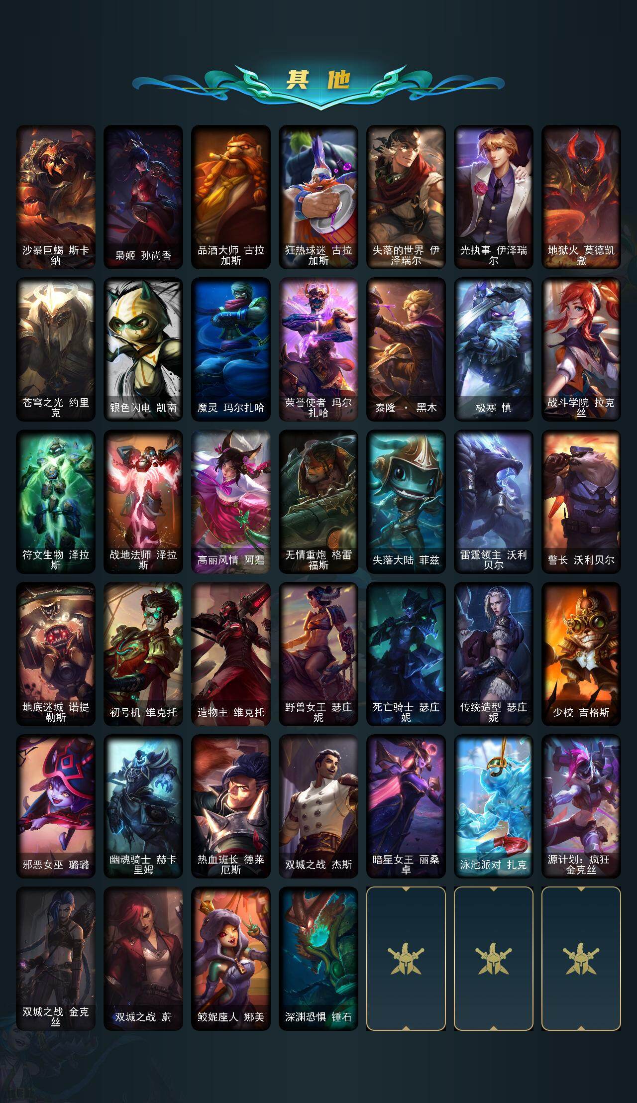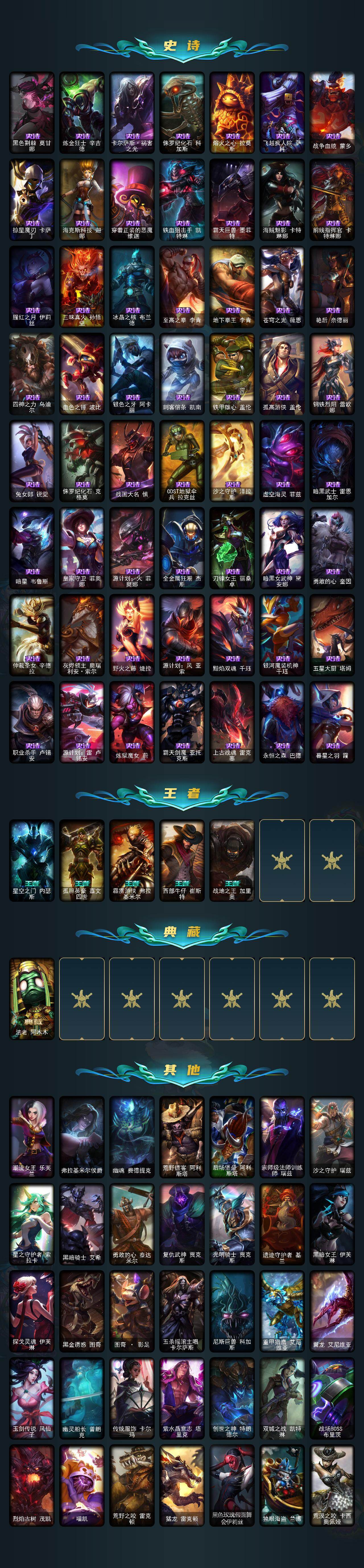 【ld5002】170英雄/200皮肤/1终极/8神话/19限定/51炫彩/22传说/70史诗/未定级/十周年纪念安妮/神凰行者瑞羽圣凰艾尼维亚/海克斯科技吉格斯/海克斯科技斯维因/至臻飞升战神潘森/至臻灵魂莲华提莫/至臻灵能特工伊泽瑞尔/至臻月蚀骑士赛娜/幸福女神乐芙兰/圣诞糖果棒厄运小姐/雪默丁格/未来战士伊泽瑞尔/卧虎藏龙贾克斯/冠军之刃锐雯/冠军典狱长锤石/冠军之矛卡莉丝塔/冠军之刃锐雯2016/冠军之隐劫/fnatic库奇/暗杀星蒙多/暗杀星努努和威朗普/安妮梦游仙境/胜利女神瑟庄妮/女猎手希维尔/暗影沃里克/都铎王朝图奇/防暴士兵辛吉德/防暴天使凯尔/大天使长米迦勒凯尔/源计划林易/恶魔男爵瑞兹/霸天零式赛恩/烈焰雄心崔丝塔娜/合金巨兽努努和威朗普/源计划联合艾希/电玩女神娑娜/冰霜之刃艾瑞莉娅/女主播迦娜/红色男爵库奇/女警狙击凯特琳/陆地王者4wd布里茨/上古战魂魔腾/丧尸布兰德/屠龙勇士潘森/死亡骑士盖伦/枯萎之壤泽拉斯/冰霜亚龙希瓦娜/焰尾妖狐阿狸/宇航员诺提勒斯/霸天异形卡兹克/安伯斯与提妮/特战先锋赵信/摄魂男爵弗拉基米尔/铁钩船长费德提克/重生之沙费德提克/圣光审判凯尔/天人合一易/侍魂易/钢铁之心希维尔/圣洁化身索拉卡/熊猫提莫/荒野豺狼沃里克/国王泰达米尔/刀锋女王莫甘娜/黑色荆棘莫甘娜/炼金狂士辛吉德/卡尔萨斯祸害之光/侏罗纪化石科加斯/熔火之心拉莫斯/飞越疯人院萨科/战争血统蒙多/掠星魔刃卡萨丁/海克斯科技迦娜/穿着正装的恶魔维迦/铁血狙击手凯特琳/霸天巨兽墨菲特/海贼魅影卡特琳娜/前线指挥官卡特琳娜/腥红之月伊莉丝/三昧真火孙悟空/冰晶之核布兰德/至高之拳李青/地下拳王李青/苍穹之光薇恩/艳后奈德丽/四神之力乌迪尔/血色之锤波比/银色之牙阿卡丽/刺客信条凯南/铁甲雄心盖伦/孤高游侠盖伦/钢铁烈阳蕾欧娜/兔女郎锐雯/侏罗纪化石克格莫/战国大名慎/odst地狱伞兵拉克丝/沙之守护泽拉斯/虚空海灵菲兹/暗黑武士雷恩加尔/暗星韦鲁斯/皇家守卫菲奥娜/源计划火菲奥娜/全金属狂潮杰斯/刀锋女王丽桑卓/暗黑女武神黛安娜/勇敢的心奎因/仲裁圣女辛德拉/灰烬领主奥瑞利安索尔/野火之藤婕拉/源计划风亚索/黯焰双魂千珏/银河魔装机神千珏/五星大厨塔姆/职业杀手卢锡安/源计划雷卢锡安/炼狱魔女蔚/霸天剑魔亚托克斯/上古战魂雷克塞/永恒之森巴德/暮星之羽霞/星空之门内瑟斯/孤胆英豪嘉文四世/霹雳游侠弗拉基米尔/西部牛仔崔斯特/战地之王加里奥/法老阿木木/潮流女王乐芙兰/弗拉基米尔侯爵/幽魂费德提克/荒野镖客阿利斯塔/后场堡垒阿利斯塔/宗师级法师训练师瑞兹/沙之守护瑞兹/星之守护者索拉卡/黑暗骑士艾希/勇敢的心泰达米尔/复仇武神贾克斯/光明骑士贾克斯/遗迹守护者基兰/黑暗女王伊芙琳/探戈灵魂伊芙琳/黑金诱惑图奇/图奇影足/五杀摇滚主唱卡尔萨斯/尼斯巨兽科加斯/重甲猎鹰艾尼维亚/翼龙艾尼维亚/玉剑传说风仙子/幽灵船长普朗克/传统服饰卡尔玛/紫水晶意志塔里克/创世之神特朗德尔/双城之战凯特琳/战场boss布里茨/烈焰古树茂凯/喵凯/荒野之咬雷克顿/猛龙雷克顿/黑色玫瑰假面舞会伊莉丝/独眼海盗兰博/荒漠之咬卡西奥佩娅/沙暴巨蝎斯卡纳/枭姬孙尚香/品酒大师古拉加斯/狂热球迷古拉加斯/失落的世界伊泽瑞尔/光执事伊泽瑞尔/地狱火莫德凯撒/苍穹之光约里克/银色闪电凯南/魔灵玛尔扎哈/荣誉使者玛尔扎哈/泰隆黑木/极寒慎/战斗学院拉克丝/符文生物泽拉斯/战地法师泽拉斯/高丽风情阿狸/无情重炮格雷福斯/失落大陆菲兹/雷霆领主沃利贝尔/警长沃利贝尔/地底迷城诺提勒斯/初号机维克托/造物主维克托/野兽女王瑟庄妮/死亡骑士瑟庄妮/传统造型瑟庄妮/少校吉格斯/邪恶女巫璐璐/幽魂骑士赫卡里姆/热血班长德莱厄斯/双城之战杰斯/暗星女王丽桑卓/泳池派对扎克/源计划疯狂金克丝/双城之战金克丝/双城之战蔚/鲛妮座人娜美/深渊恐惧锤石