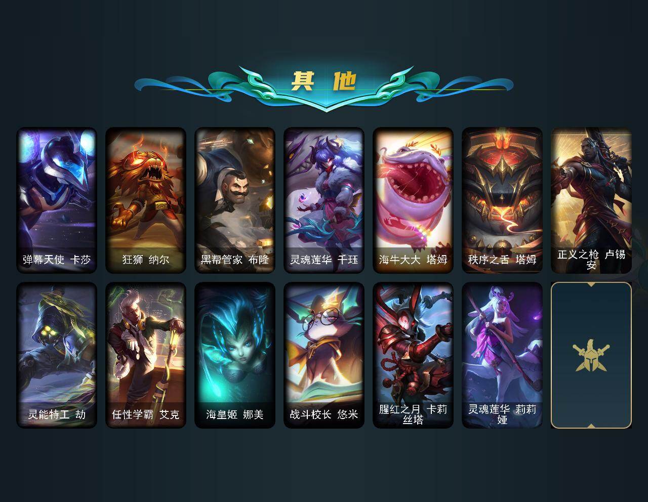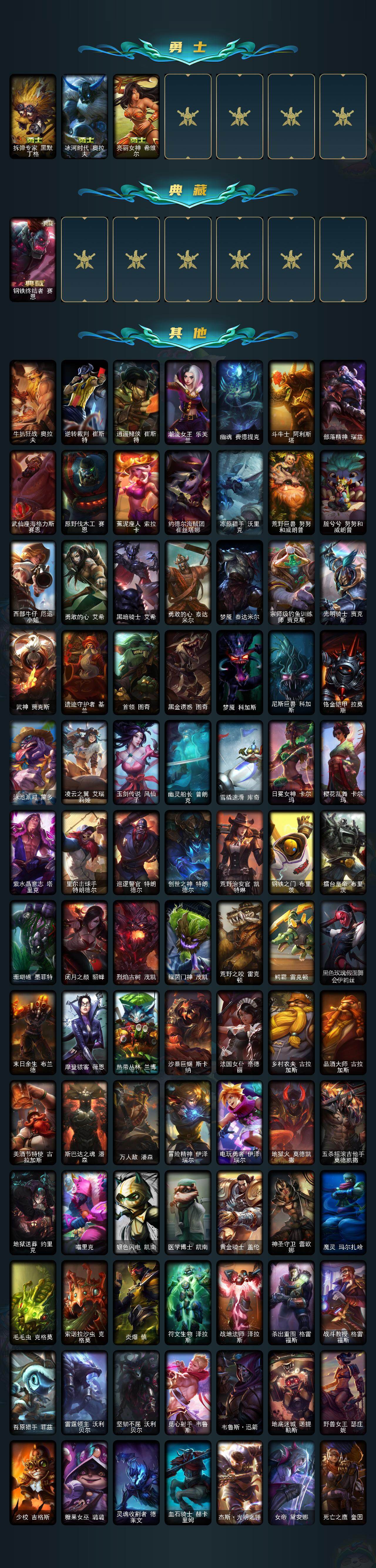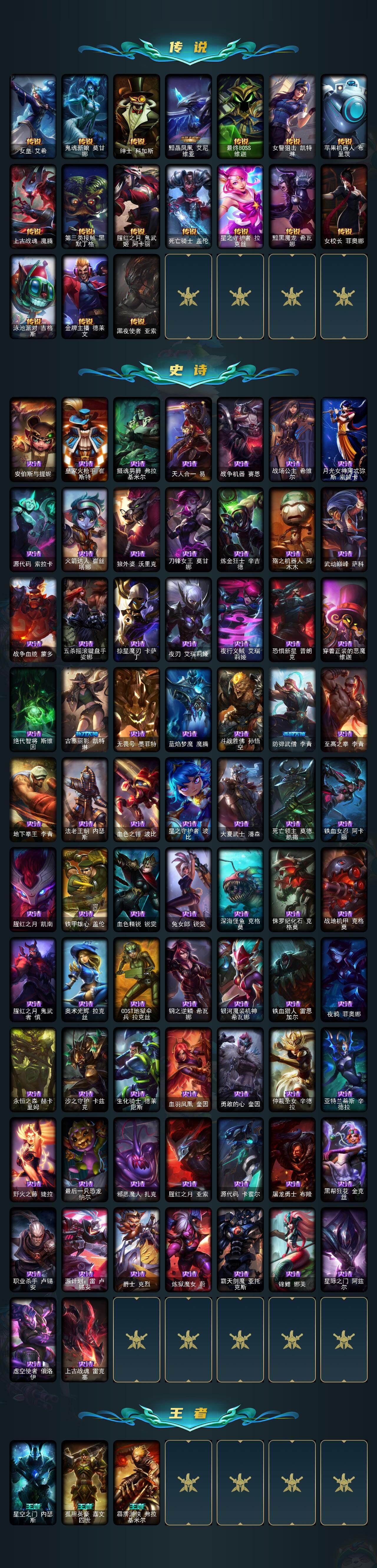 【ld5000】172英雄/262皮肤/5神话/50限定/4臻彩/53炫彩/24传说/72史诗/未定级/十周年纪念安妮/源代码乐芙兰/十五周年纪念希维尔/神凰行者瑞羽圣凰艾尼维亚/海克斯科技阿利斯塔/觅心之翼奎因头像/玉剑传说寒潭夭夭头像/无畏骑士瑟庄妮赤子初心/星之守护者金克丝黑洞/魔女阿卡丽虚荣/净雪之月莫甘娜冬虹/碧玉之牙卡西奥佩娅/神龙之翼库奇/玉净夜叉凯特琳/点心宝贝阿木木/甜心宝贝安妮/幸福女神乐芙兰/圣诞开心鬼提莫/圣诞精灵崔丝塔娜/圣诞狂欢努努和威朗普/圣诞糖果棒厄运小姐/阿木木“主人不要我了”/平安夜女神娑娜/英勇玩具兵普朗克/邪恶圣诞老人维迦/喜庆之树茂凯/雪默丁格/圣诞玩偶波比/雪球也能爆炸吉格斯/圣诞捣蛋鬼金克丝/冰雪兽纳尔/送披萨的小姐姐希维尔/冠军典狱长锤石/冠军之刃锐雯2016/fnatic古拉加斯/fnatic迦娜/fnatic卡尔萨斯/fnatic库奇/暗杀星慎/sktt1婕拉/ssw图奇/sktt1阿兹尔/电玩女神厄运小姐/胜利女神希维尔/胜利之剑亚托克斯/胜利女神娑娜/胜利剑圣易/胜利之运崔斯特/海贼瑞兹/泳池派对凯特琳/泳池派对李青/机械迷城加里奥/密林猎手提莫/外星装甲库奇/勇者阿狸/勇者奈德丽/防暴天使凯尔/警用试作体k9内瑟斯/鸡里奥/克格汪/铁哥们儿奥拉夫/魔幻卡牌崔斯特/邪鸦魅影乐芙兰/大天使长米迦勒凯尔/钢铁之翼凯尔/烈焰雄心崔丝塔娜/驯龙炮手崔丝塔娜/女皇艾希/鬼魂新娘莫甘娜/绅士科加斯/黯晶凤凰艾尼维亚/最终boss维迦/女警狙击凯特琳/苹果机器人布里茨/上古战魂魔腾/第三类接触黑默丁格/腥红之月鬼武姬阿卡丽/死亡骑士盖伦/星之守护者拉克丝/黯黑魔龙希瓦娜/女校长菲奥娜/泳池派对吉格斯/金牌主播德莱文/黑夜使者亚索/安伯斯与提妮/皇家火呛手崔斯特/摄魂男爵弗拉基米尔/天人合一易/战争机器赛恩/战场公主希维尔/月光女神阿忒弥斯索拉卡/源代码索拉卡/火箭达人崔丝塔娜/狼外婆沃里克/刀锋女王莫甘娜/炼金狂士辛吉德/殇之机器人阿木木/武动巅峰萨科/战争血统蒙多/五杀摇滚键盘手娑娜/掠星魔刃卡萨丁/夜刃艾瑞莉娅/夜行义贼艾瑞莉娅/恐惧新星普朗克/穿着正装的恶魔维迦/绝代智将斯维因/古墓丽影凯特琳/无畏号墨菲特/蓝焰梦魔魔腾/斗战胜佛孙悟空/防弹武僧李青/至高之拳李青/地下拳王李青/法老王朝内瑟斯/血色之锤波比/星之守护者波比/大夏武士潘森/死亡领主莫德凯撒/铁血女忍阿卡丽/腥红之月凯南/铁甲雄心盖伦/血色精锐锐雯/兔女郎锐雯/深海怪鱼克格莫/侏罗纪化石克格莫/战地机甲克格莫/腥红之月鬼武者慎/奥术光辉拉克丝/odst地狱伞兵拉克丝/钢之逆鳞希瓦娜/银河魔装机神希瓦娜/铁血猎人雷恩加尔/夜鸦菲奥娜/永恒之森赫卡里姆/沙之守护卡兹克/生化骑士德莱厄斯/血羽凤凰奎因/勇敢的心奎因/仲裁圣女辛德拉/亚特兰蒂斯辛德拉/野火之藤婕拉/最后一只恐龙纳尔/邪恶魔人扎克/腥红之月亚索/源代码卡蜜尔/屠龙勇士布隆/黑帮狂花金克丝/职业杀手卢锡安/源计划雷卢锡安/爵士克烈/炼狱魔女蔚/霸天剑魔亚托克斯/锦鲤娜美/星际之门阿兹尔/虚空使者俄洛伊/上古战魂雷克塞/星空之门内瑟斯/孤胆英豪嘉文四世/霹雳游侠弗拉基米尔/拆弹专家黑默丁格/冰河时代奥拉夫/亮丽女神希维尔/钢铁终结者赛恩/牛扒狂战奥拉夫/逆转裁判崔斯特/赌侠崔斯特/潮流女王乐芙兰/幽魂费德提克/斗牛士阿利斯塔/部落精神瑞兹/武仙座海格力斯赛恩/原野伐木工赛恩/蕉泥座人索拉卡/约德尔海贼团崔丝塔娜/冻原猎手沃里克/荒野巨兽努努和威朗普/脏兮兮努努和威朗普/西部牛仔厄运小姐/勇敢的心艾希/黑暗骑士艾希/勇敢的心泰达米尔/梦魇泰达米尔/宗师级钓鱼训练师贾克斯/光明骑士贾克斯/武神贾克斯/遗迹守护者基兰/首领图奇/黑金诱惑图奇/梦魇科加斯/尼斯巨兽科加斯/铬金铠甲拉莫斯/泳池派对蒙多/凌云之翼艾瑞莉娅/玉剑传说风仙子/幽灵船长普朗克/雪橇速滑库奇/日冕女神卡尔玛/樱花乱舞卡尔玛/紫水晶意志塔里克/里尔击球手特朗德尔/巡逻警官特朗德尔/创世之神特朗德尔/荒野治安官凯特琳/钢铁之门布里茨/擂台皇帝布里茨/珊瑚礁墨菲特/闭月之颜貂蝉/烈焰古树茂凯/绿茵门神茂凯/荒野之咬雷克顿/鳄霸雷克顿/黑色玫瑰假面舞会伊莉丝/末日余生布兰德/摩登骇客薇恩/热带丛林兰博/沙暴巨蝎斯卡纳/法国女仆奈德丽/乡村农夫古拉加斯/品酒大师古拉加斯/美酒节特使古拉加斯/斯巴达之魂潘森/万人敌潘森/冒险精神伊泽瑞尔/电玩勇者伊泽瑞尔/地狱火莫德凯撒/五杀摇滚吉他手莫德凯撒/地狱送葬约里克/喵里克/银色闪电凯南/医学博士凯南/黄金骑士盖伦/神圣守卫蕾欧娜/魔灵玛尔扎哈/毛毛虫克格莫/索诺拉沙虫克格莫/炎爆慎/符文生物泽拉斯/战地法师泽拉斯/杀出重围格雷福斯/战斗教授格雷福斯/苔原猎手菲兹/雷霆领主沃利贝尔/坚韧不屈沃利贝尔/觅心射手韦鲁斯/韦鲁斯迅箭/地底迷城诺提勒斯/野兽女王瑟庄妮/少校吉格斯/糖果女巫璐璐/灵魂收割者德莱文/血石骑士赫卡里姆/杰斯光明之锤/女帝黛安娜/死亡之鹰奎因/弹幕天使卡莎/狂狮纳尔/黑帮管家布隆/灵魂莲华千珏/海牛大大塔姆/秩序之舌塔姆/正义之呛卢锡安/灵能特工劫/任性学霸艾克/海皇姬娜美/战斗校长悠米/腥红之月卡莉丝塔/灵魂莲华莉莉娅