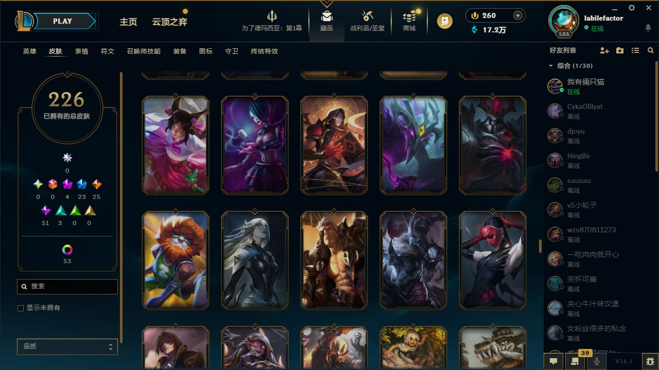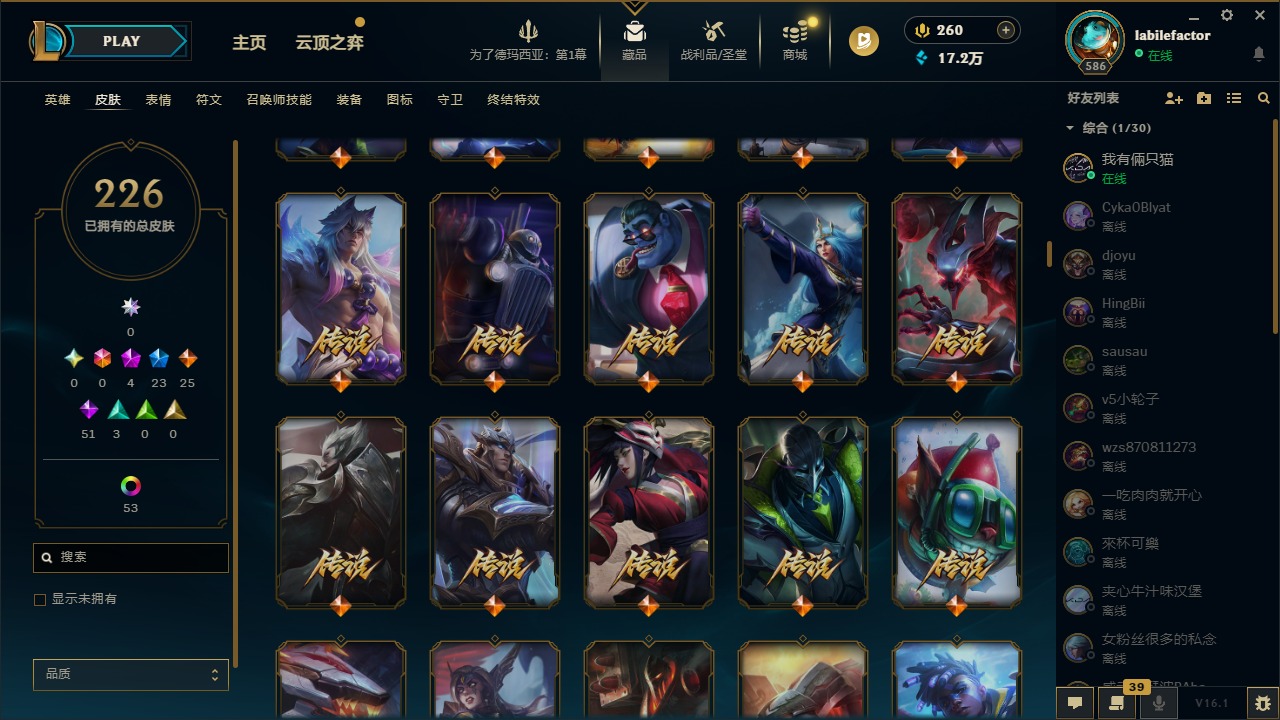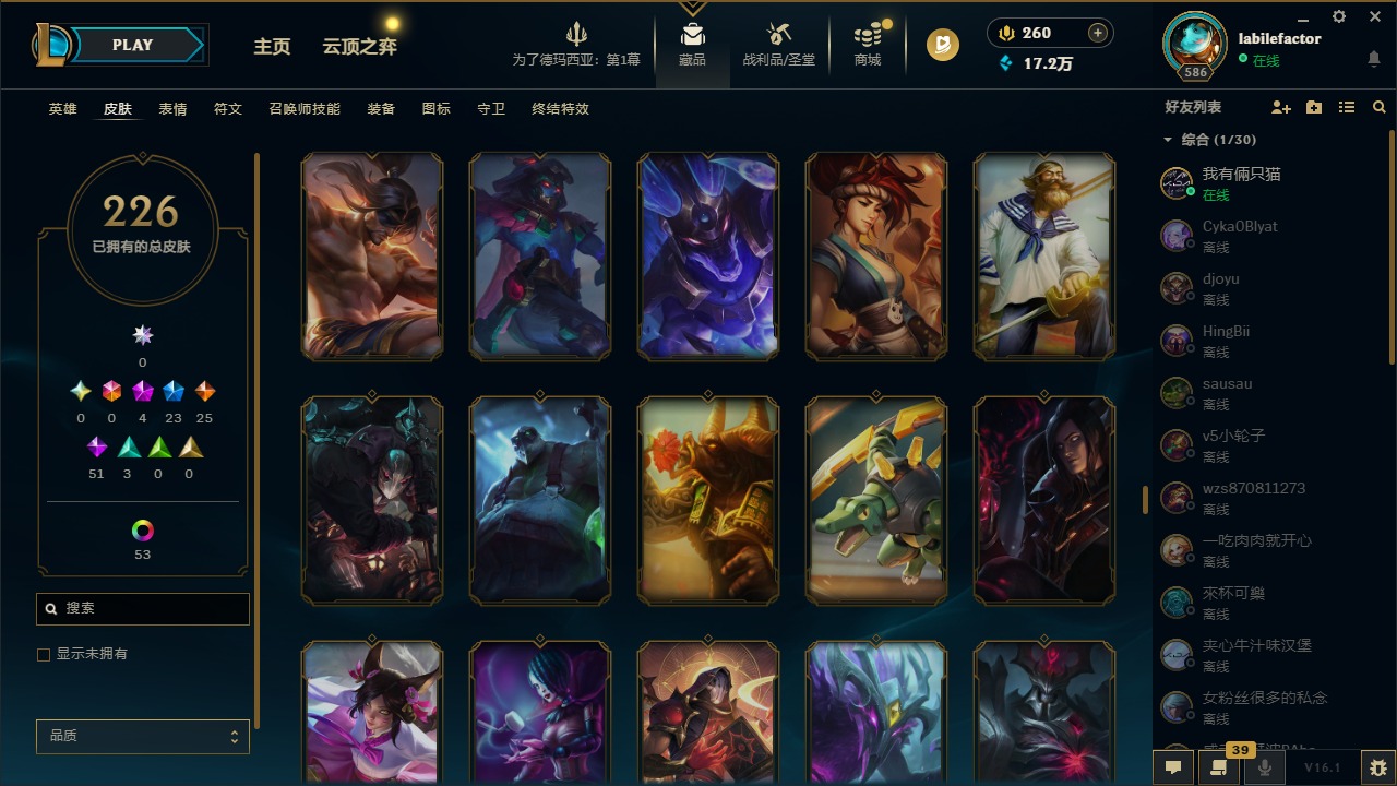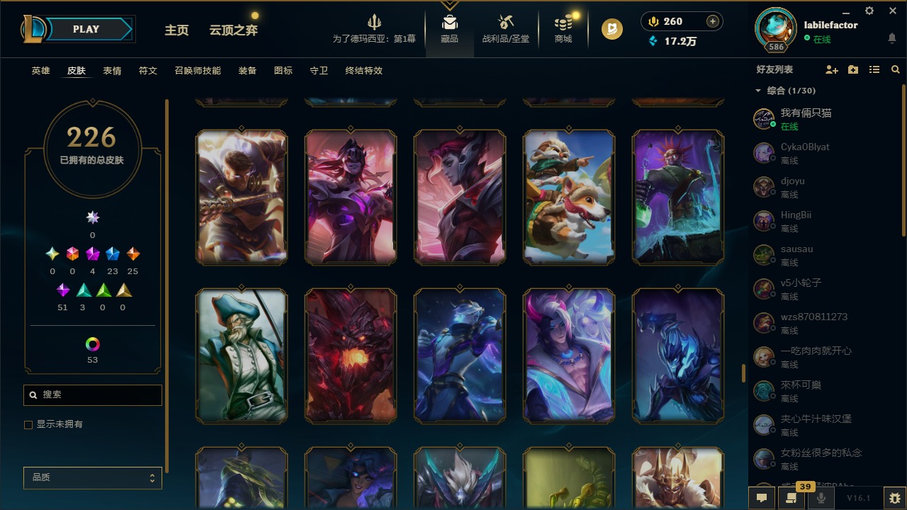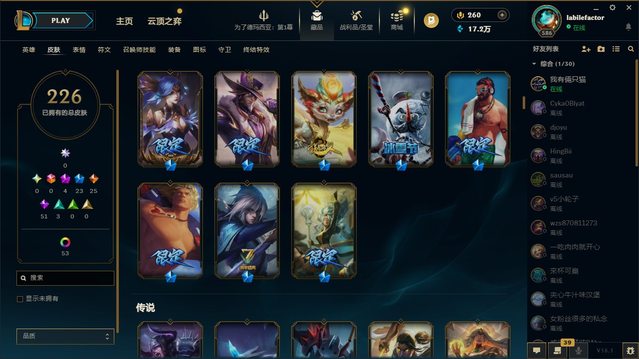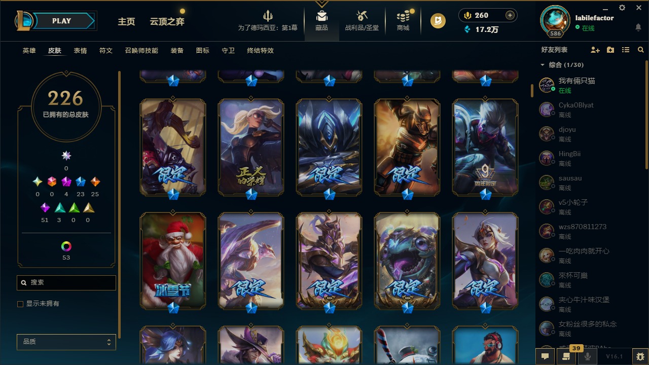 [16548463]4神话 23限定 25传说 51史诗 226皮肤 69炫彩 171英雄 可二次 可修改实名 【海克斯】海克斯 雷克顿 【赛季限定皮】胜利凤凰 艾尼维亚胜利女神-菲奥娜胜利之运 崔斯特胜利剑圣 易胜利女神 娑娜胜利巨口 克格莫 【冠军限定系列】s1fnc 迦娜s2 暗杀星 蒙多s2 暗杀星 慎 【冰雪节限定】圣诞老人 古拉加斯雪默丁格 【泳池派对】泳池派对 吉格斯泳池派对 格雷福斯泳池派对 塔里克 【年限】点心宝贝 阿木木天龙之子 斯莫德 【周年】7周年 泰隆9周年 剑圣10周年 安妮10周年 凤凰 【其他限定/神话皮】十五周年纪念 希维尔暗裔英雄 盖伦防暴天使 凯尔暗影 沃里克都铎王朝 图奇冠军掠夺者 卡兹克警用试作体k-9 内瑟斯