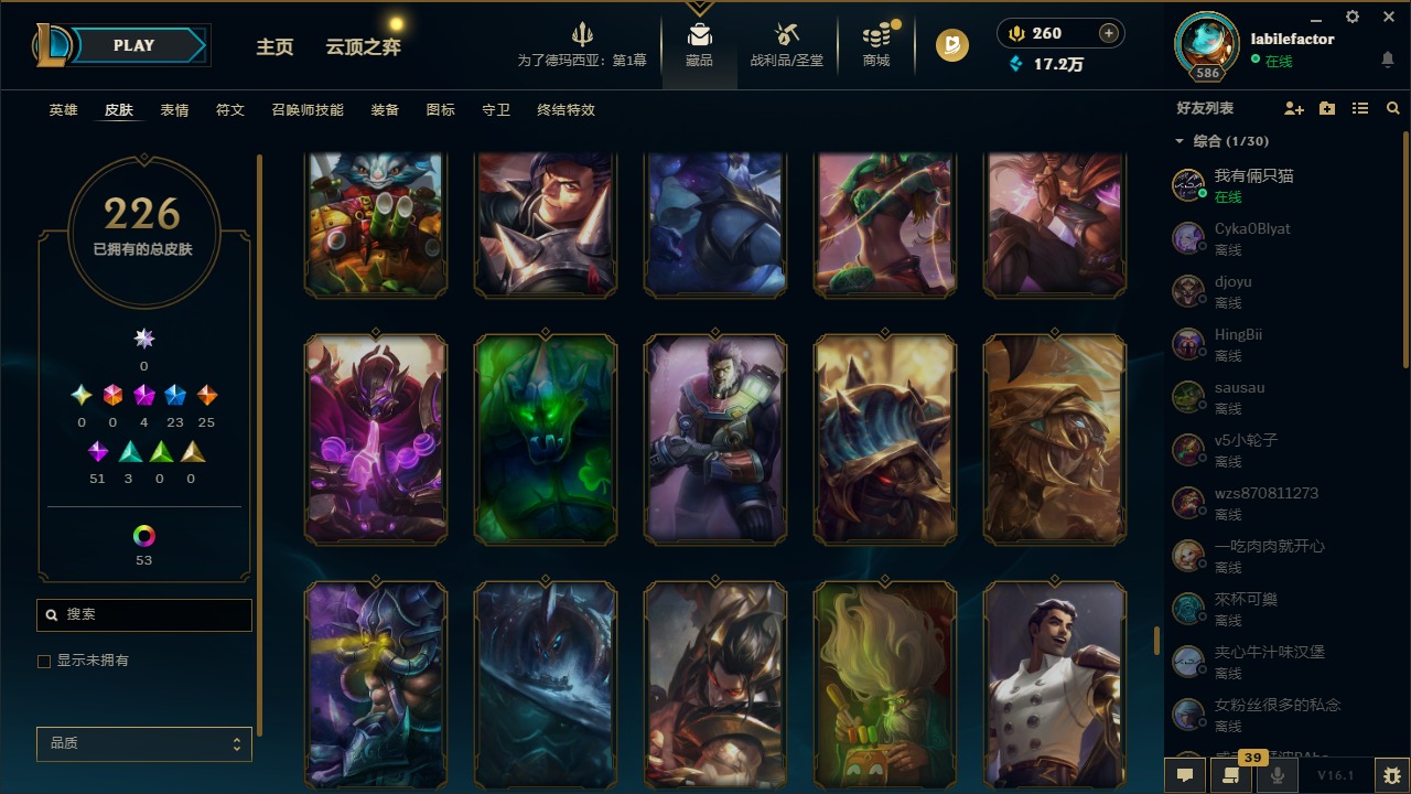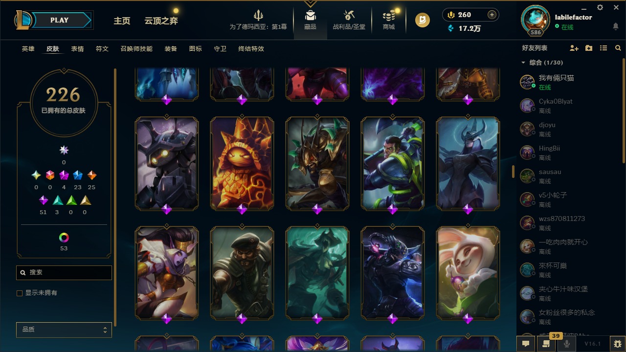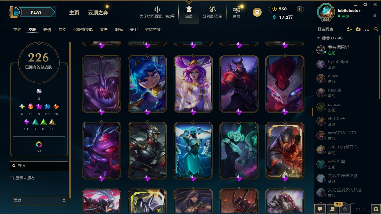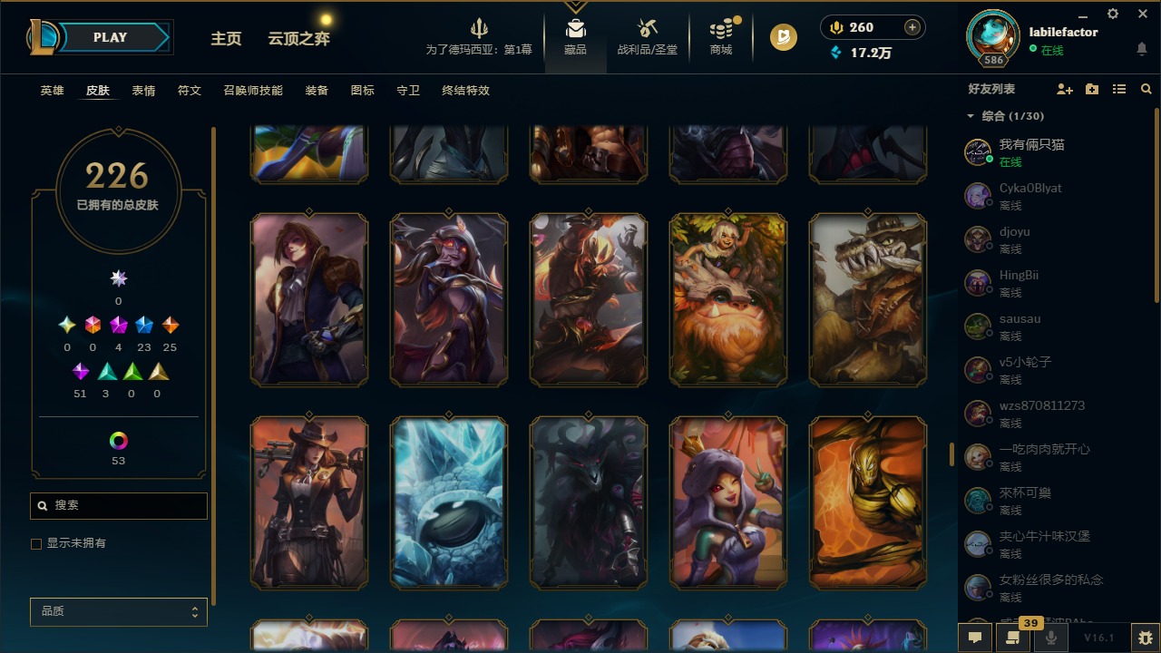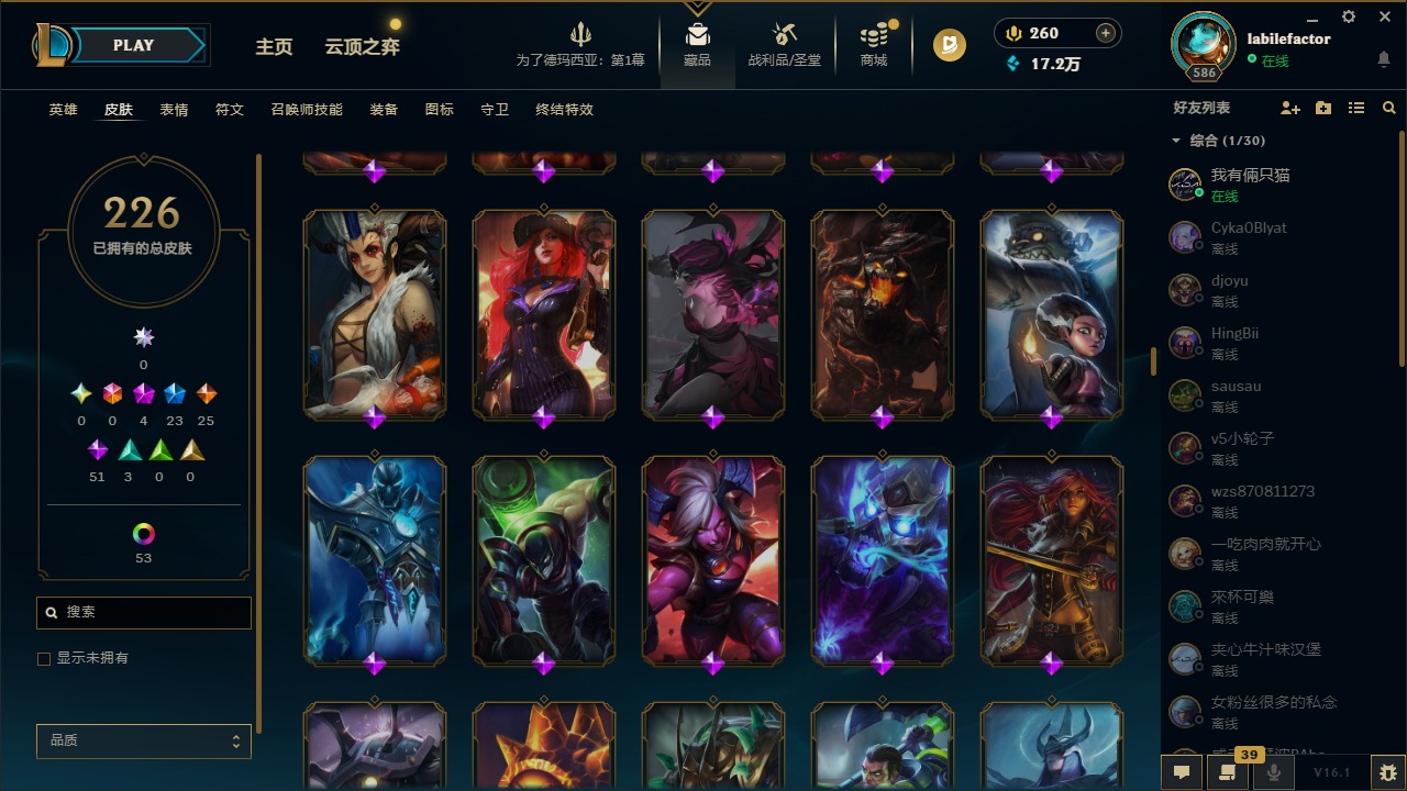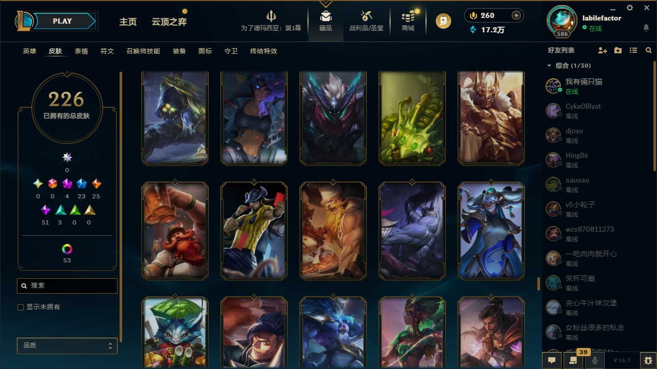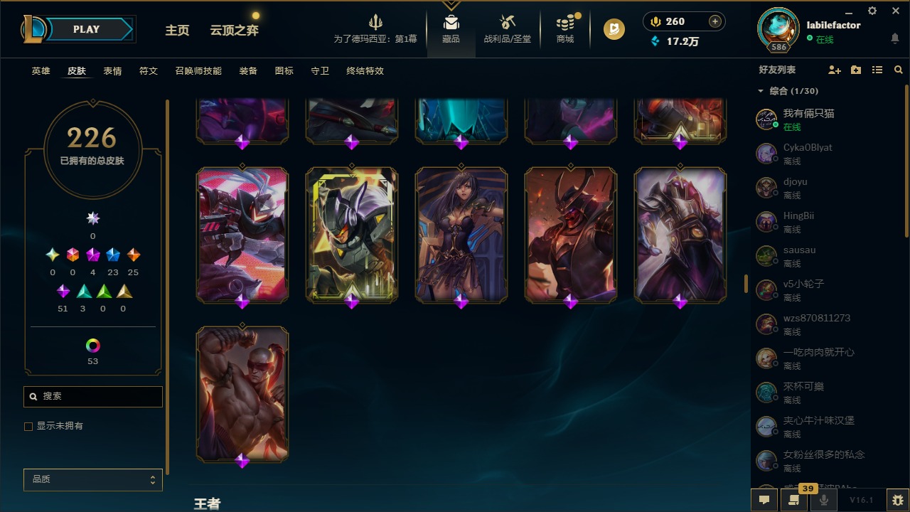 [16548463]4神话 23限定 25传说 51史诗 226皮肤 69炫彩 171英雄 可二次 可修改实名 【海克斯】海克斯 雷克顿 【赛季限定皮】胜利凤凰 艾尼维亚胜利女神-菲奥娜胜利之运 崔斯特胜利剑圣 易胜利女神 娑娜胜利巨口 克格莫 【冠军限定系列】s1fnc 迦娜s2 暗杀星 蒙多s2 暗杀星 慎 【冰雪节限定】圣诞老人 古拉加斯雪默丁格 【泳池派对】泳池派对 吉格斯泳池派对 格雷福斯泳池派对 塔里克 【年限】点心宝贝 阿木木天龙之子 斯莫德 【周年】7周年 泰隆9周年 剑圣10周年 安妮10周年 凤凰 【其他限定/神话皮】十五周年纪念 希维尔暗裔英雄 盖伦防暴天使 凯尔暗影 沃里克都铎王朝 图奇冠军掠夺者 卡兹克警用试作体k-9 内瑟斯