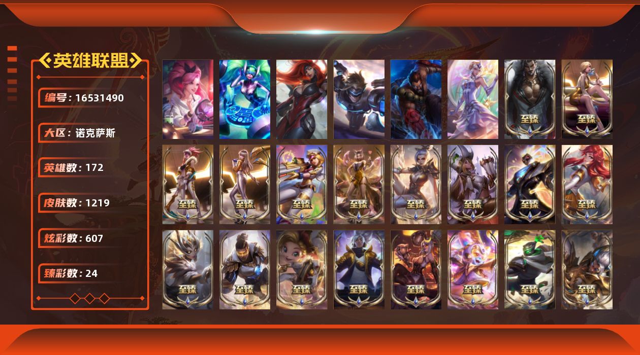 [16531490]【特价出售/店主推荐】未定级段位-172英雄-1219皮肤-607炫彩-8终极-55神话-218限定-115传说-215史诗 【珍稀头像】:雪花头像,星守阿狸头像,至爱的鹿头像 【热门头像】:爱意绵绵头像,爱情之歌头像,觅心之翼奎因头像,觅心游侠卢锡安头像 【至臻皮肤】:至臻北极星使者沃里克,至臻魅惑女巫厄运小姐,至臻魅惑女巫厄运小姐2022,至臻征服者贾克斯,至臻kda伊芙琳,至臻kda伊芙琳2022,至臻狼神英灵斯维因,至臻电玩女神凯特琳,至臻电玩女神凯特琳2022,至臻烈焰美人薇恩,至臻烈焰美人薇恩2022,至臻飞升战神潘森,至臻灵能特工伊泽瑞尔,至臻kda阿卡丽,至臻kda阿卡丽2022,至臻西部魔影猎天使恶魔泰隆,至臻玉剑传说武剑仙锐雯,至臻战斗学院拉克丝,至臻战斗学院拉克丝2022,至臻青花瓷拉克丝,至臻kda阿狸,至臻kda阿狸2022,至臻福牛守护者菲奥娜,至臻太空律动节奏幻师璐璐,至臻黑夜使者凯隐,至臻奥术师佐伊,至臻魔女婕拉,至臻kda卡莎,至臻kda卡莎2022,至臻真实伤害亚索,至臻未来战士卢锡安,至臻源计划阴劫,至臻星之守护者艾克,至臻drx亚托克斯,至臻未来战士锤石,至臻未来战士锤石2022,至臻源计划逆流塞拉斯,至臻神龙尊者炎龙瑟提 【臻彩皮肤】:剪纸仙灵嘉文四世日进斗金,定海神珍孙悟空四海扬威,天龙之子卡莎飞龙乘云,墨之影武者亚索金墨耀影,墨之影武者易金墨耀影,神龙尊者圣龙李青龙腾云起,霸天异形卡兹克掠空魅影,弹幕天使卡莎炽天使勇敢,源计划联合艾希红莲之弓,幻灵战斗兔锐雯梦幻强袭,霸天异形卡兹克刹那银光,最终boss维迦里大魔王,可爱可爱粉红红布里茨,海之歌艾希冰爽浪花,海之歌永恩月夜潮汐,魔女阿卡丽虚荣,魔女阿狸饕餮,净雪之月莫甘娜冬虹,幻灵战斗兔阿萝拉梦幻强袭,红莲之刃锐雯,北极星钢影卡蜜尔智慧纽带,心之钢伊泽瑞尔天纵才华,灌篮高手德莱厄斯金色神话 【年限皮肤】:龙的传人李青,银龙裁决泰隆,古琴余韵娑娜,你看见过我的熊猫吗安妮,碧玉之牙卡西奥佩娅,神龙之翼库奇,替父从军花木兰,广寒仙子嫦娥,神龙烈焰金克丝,美猴王孙悟空,紫金罗刹莫甘娜,玉净夜叉凯特琳,张辽文远,司马懿仲达,虎痴之拳蔚,南天之怒沃里克,北辰之威内瑟斯,春晖神女拉克丝,金猪烈焰瑟庄妮,烈焰美人薇恩,纳财大帝塔姆,王国机神青龙德莱文