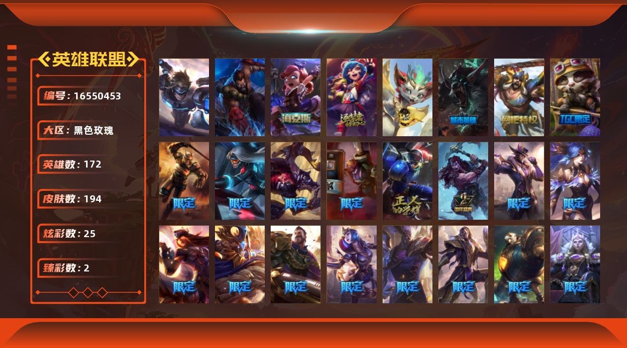 [16550453]未定级段位-172英雄-194皮肤-25炫彩-2终极-2神话-46限定-20传说-53史诗 【神话皮肤】:十周年纪念安妮,海克斯科技安妮 【臻彩皮肤】:霸天异形卡兹克掠空魅影,魔女阿卡丽虚荣 【年限皮肤】:天龙之子斯莫德 【海克斯皮肤】:海克斯科技安妮 【冰雪限定】:阿木木“主人不要我了”,胡桃夹子萨科,邪恶圣诞老人维迦,冬季仙境奥莉安娜,圣诞老人古拉加斯,圣诞驯鹿克格莫,魄罗骑士瑟庄妮,冰雪节辛吉德 【终极皮肤】:灵魂守卫乌迪尔,未来战士伊泽瑞尔 【限定皮肤】:fnatic迦娜,暗杀星努努和威朗普,sktt1劫,sktt1李青,sktt1薇恩,ssw辛吉德,ssw泰隆,ssw雷恩加尔,sktt1阿兹尔,勇敢的心德莱厄斯,暗裔英雄盖伦,胜利女神希维尔,胜利之树茂凯,胜利呛神格雷福斯,胜利女神奥莉安娜,胜利之剑亚托克斯,胜利呛神卢锡安,胜利机器人布里茨,胜利女神瑟庄妮,胜利女神娑娜,胜利之运崔斯特,胜利女神菲奥娜,南瓜头费德提克,鬼影重重魔腾,无头骑士赫卡里姆,泳池派对蕾欧娜,泳池派对李青,密林猎手提莫,暗影沃里克,野兽猎人泰达米尔,创战纪希维尔,勇者阿狸,都铎王朝图奇,防暴士兵辛吉德,防暴天使凯尔,警用试作体k9内瑟斯 【传说皮肤】:铁哥们儿奥拉夫,大天使长米迦勒凯尔,提莫约德尔人的一大步,女皇艾希,源计划联合艾希,绅士科加斯,双重冰晶艾尼维亚,黯晶凤凰艾尼维亚,冰霜之刃艾瑞莉娅,女主播迦娜,红色男爵库奇,炼狱魔犬内瑟斯,腥红之月鬼武姬阿卡丽,钢铁军团盖伦,黯黑魔龙希瓦娜,苍穹之光韦鲁斯,金牌主播德莱文,霸天异形卡兹克,灌篮高手德莱厄斯,蔷薇绅士杰斯 【史诗皮肤】:冰霜烈焰安妮,铁钩船长费德提克,圣光审判凯尔,地狱火阿利斯塔,战争机器赛恩,钢铁之心希维尔,月光女神阿忒弥斯索拉卡,圣洁化身索拉卡,火牙狼人沃里克,黑帮狂花厄运小姐,女船长厄运小姐,死神卡尔萨斯,贵族血统萨科,飞越疯人院萨科,战争血统蒙多,特种部队普朗克,恐惧新星普朗克,穿着正装的恶魔维迦,北领前线斯维因,抵抗军天使凯特琳,古墓丽影凯特琳,铁血狙击手凯特琳,前线指挥官卡特琳娜,龙骑统帅嘉文四世,灵魂烈焰布兰德,苍穹之光薇恩,法老王朝内瑟斯,死亡领主莫德凯撒,铁甲雄心盖伦,刺客信条锐雯,兔女郎锐雯,腥红之月鬼武者慎,钢之逆鳞希瓦娜,黑帮教父格雷福斯,海牛猎手菲兹,虚空海灵菲兹,源计划火菲奥娜,奥术大师吉格