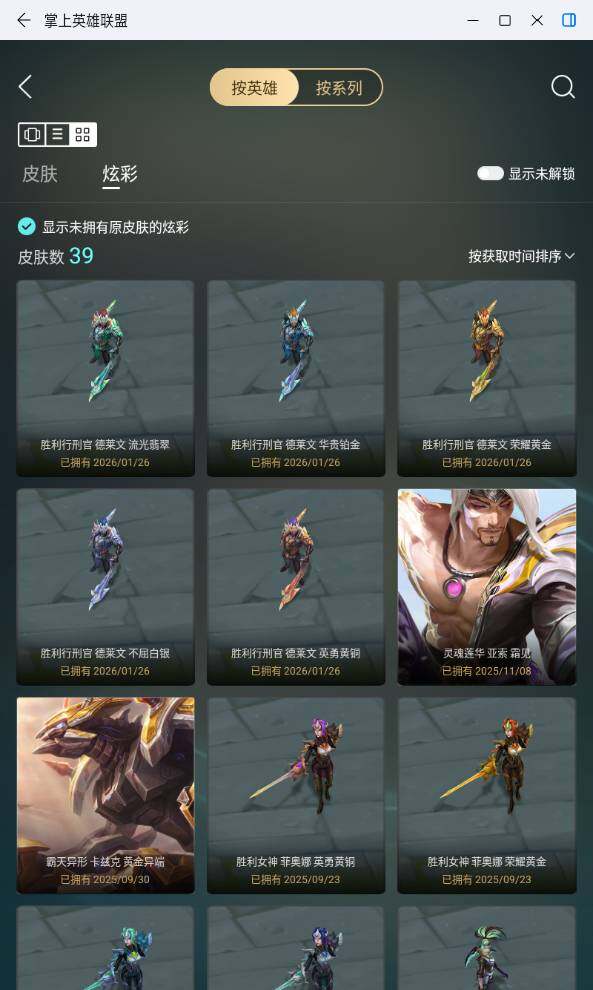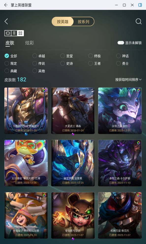 铂金段位-172英雄-182皮肤-39炫彩-0终极-1神话-25限定-15传说-31史诗 【神话皮肤】:十五周年纪念希维尔 【臻彩皮肤】:冠军掠夺者卡兹克凯旋圣装,冠军之隐劫凯旋圣装,星之守护者奥莉安娜未来之光,灵魂莲华亚索霜见之时,魔女阿卡丽虚荣,霸天异形卡兹克黄金异端 【年限皮肤】:碧玉之牙卡西