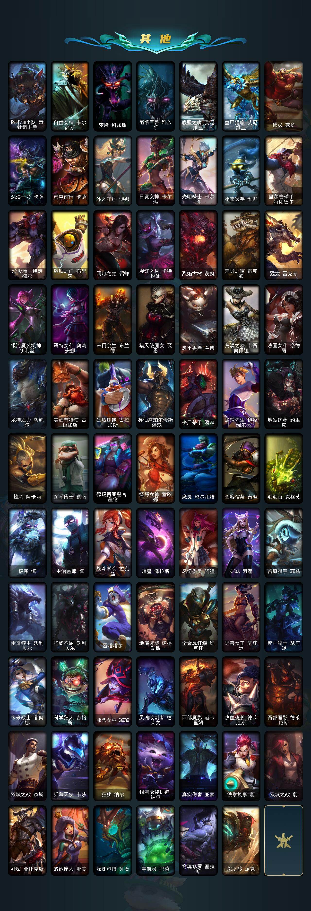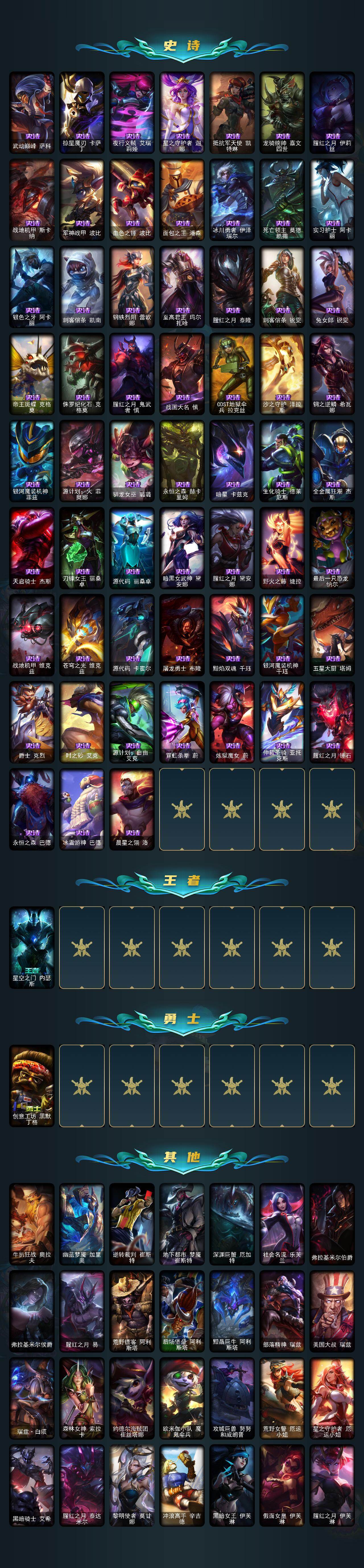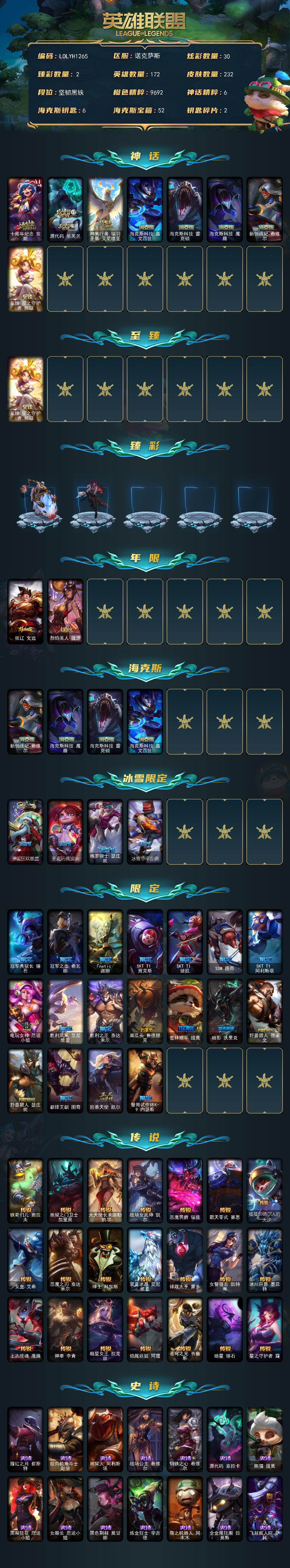 【lolyh1265】172英雄/232皮肤/8神话/24限定/2臻彩/30炫彩/21传说/73史诗/未定级/十周年纪念安妮/源代码乐芙兰/神凰行者瑞羽圣凰艾尼维亚/海克斯科技嘉文四世/海克斯科技雷克顿/海克斯科技魔腾/新创战纪希维尔/至臻星之守护者妮蔻/无畏骑士瑟庄妮赤子初心/西部魔影卢锡安贝利尔之怠/张辽文远/烈焰美人薇恩/圣诞狂欢基兰/圣诞玩偶波比/魄罗骑士瑟庄妮/冰雪节辛吉德/冠军典狱长锤石/冠军之血希瓦娜/fnatic迦娜/sktt1贾克斯/sktt1婕拉/ssw图奇/sktt1阿利斯塔/电玩女神厄运小姐/胜利凤凰艾尼维亚/胜利之王泰达米尔/南瓜头费德提克/密林猎手提莫/暗影沃里克/野兽猎人德莱文/野兽猎人瑟庄妮/都铎王朝图奇/防暴天使凯尔/警用试作体k9内瑟斯/铁哥们儿奥拉夫/地狱之门卫士加里奥/大天使长米迦勒凯尔/战场女武神凯尔/恶魔男爵瑞兹/霸天零式赛恩/提莫约德尔人的一大步/女皇艾希/恶魔之刃泰达米尔/绅士科加斯/双重冰晶艾尼维亚/律政大亨蒙多/女警狙击凯特琳/冰川巨兽墨菲特/上古战魂魔腾/神拳李青/暗星女王拉克丝/焰尾妖狐阿狸/苍穹之光韦鲁斯/暗星锤石/星之守护者霞/腥红之月崔斯特/绞肉机角斗士赵信/地狱火阿利斯塔/战场公主希维尔/钢铁之心希维尔/源代码索拉卡/熊猫提莫/黑帮狂花厄运小姐/女船长厄运小姐/黑色荆棘莫甘娜/炼金狂士辛吉德/殇之机器人阿木木/全金属狂潮拉莫斯/飞越疯人院萨科/武动巅峰萨科/掠星魔刃卡萨丁/夜行义贼艾瑞莉娅/星之守护者迦娜/抵抗军天使凯特琳/龙骑统帅嘉文四世/腥红之月伊莉丝/战地机甲斯卡纳/军神战甲波比/血色之锤波比/面包之王潘森/冰川勇者伊泽瑞尔/死亡领主莫德凯撒/实习护士阿卡丽/银色之牙阿卡丽/刺客信条凯南/钢铁烈阳蕾欧娜/至高君王玛尔扎哈/腥红之月泰隆/刺客信条锐雯/兔女郎锐雯/帝王斑蝶克格莫/侏罗纪化石克格莫/腥红之月鬼武者慎/战国大名慎/odst地狱伞兵拉克丝/沙之守护泽拉斯/钢之逆鳞希瓦娜/银河魔装机神菲兹/源计划火菲奥娜/驯龙女巫璐璐/永恒之森赫卡里姆/暗星卡兹克/生化骑士德莱厄斯/全金属狂潮杰斯/天启骑士杰斯/刀锋女王丽桑卓/源代码丽桑卓/暗黑女武神黛安娜/腥红之月黛安娜/野火之藤婕拉/最后一只恐龙纳尔/战地机甲维克兹/苍穹之光维克兹/源代码卡蜜尔/屠龙勇士布隆/黯焰双魂千珏/银河魔装机神千珏/五星大厨塔姆/爵士克烈/时之砂艾克/源计划自由艾克/霓虹杀拳蔚/炼狱魔女蔚/仲裁圣骑亚托克斯/腥红之月锤石/永恒之森巴德/冰雪游神巴德/晨星之翎洛/星空之门内瑟斯/创意工坊黑默丁格/牛扒狂战奥拉夫/幽蓝梦魇加里奥/逆转裁判崔斯特/地下都市梦魇崔斯特/深渊巨蟹厄加特/社会名流乐芙兰/弗拉基米尔伯爵/弗拉基米尔侯爵/腥红之月易/荒野镖客阿利斯塔/后场堡垒阿利斯塔/黯晶巨牛阿利斯塔/部落精神瑞兹/美国大叔瑞兹/瑞兹白须/森林女神索拉卡/约德尔海贼团崔丝塔娜/欧米伽小队魔鬼伞兵/攻城巨兽努努和威朗普/荒野女警厄运小姐/星之守护者厄运小姐/黑暗骑士艾希/腥红之月泰达米尔/黎明使者莫甘娜/冲浪高手辛吉德/黑暗女王伊芙琳/假面女皇伊芙琳/腥红之月伊芙琳/欧米伽小队毒针狙击手/自由女神卡尔萨斯/梦魇科加斯/尼斯巨兽科加斯/联盟之喙艾尼维亚/重甲猎鹰艾尼维亚/硬汉蒙多/深海一号卡萨丁/虚空前世卡萨丁/沙之守护迦娜/日冕女神卡尔玛/光明骑士卡尔玛/冰壶选手维迦/里尔击球手特朗德尔/垃圾场特朗德尔/钢铁之门布里茨/闭月之颜貂蝉/腥红之月卡特琳娜/烈焰古树茂凯/荒野之咬雷克顿/猛龙雷克顿/银河魔装机神伊莉丝/哥特女仆奥莉安娜/末日余生布兰德/猎天使魔女薇恩/废土男爵兰博/荒漠之咬卡西奥佩娅/法国女仆奈德丽/龙神之力乌迪尔/美酒节特使古拉加斯/狂热球迷古拉加斯/英仙座珀尔修斯潘森/丧尸杀手潘森/足球先生伊泽瑞尔/地狱送葬约里克/蜂刺阿卡丽/医学博士凯南/德玛西亚警官盖伦/烧烤女神蕾欧娜/魔灵玛尔扎哈/刺客信条泰隆/毛毛虫克格莫/极寒慎/主治医师慎/战斗学院拉克丝/暗星泽拉斯/风纪委员阿狸/kda阿狸/苔原猎手菲兹/雷霆领主沃利贝尔/坚韧不屈沃利贝尔/雷喵喵尔/地底迷城诺提勒斯/全金属狂潮维克托/野兽女王瑟庄妮/死亡骑士瑟庄妮/未来战士菲奥娜/科学狂人吉格斯/邪恶女巫璐璐/灵魂收割者德莱文/西部魔影赫卡里姆/热血班长德莱厄斯/西部魔影德莱厄斯/双城之战杰斯/弹幕天使卡莎/狂狮纳尔/银河魔装机神纳尔/真实伤害亚索/铁拳执事蔚/双城之战蔚/狂鲨亚托克斯/鲛妮座人娜美/深渊恐惧锤石/宇航员巴德/窃魂修罗塞拉斯/怨之砂派克
