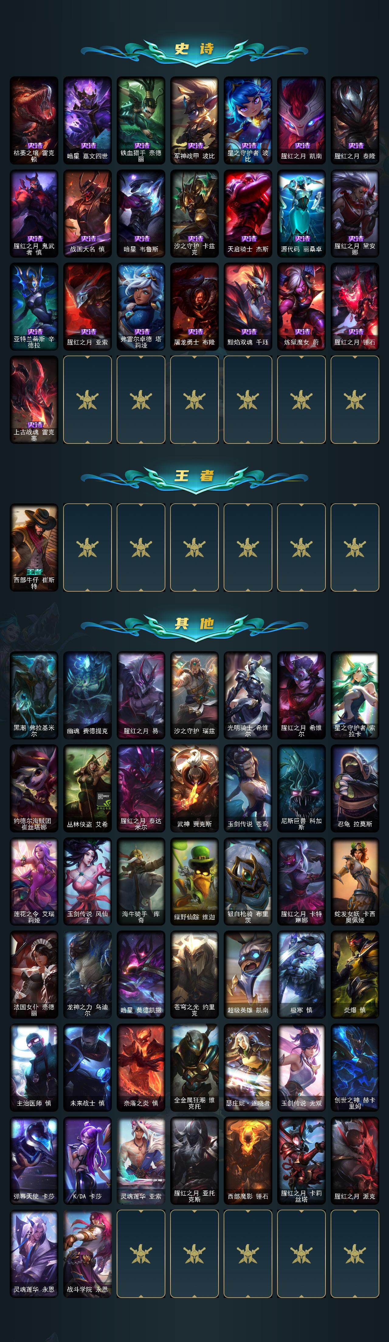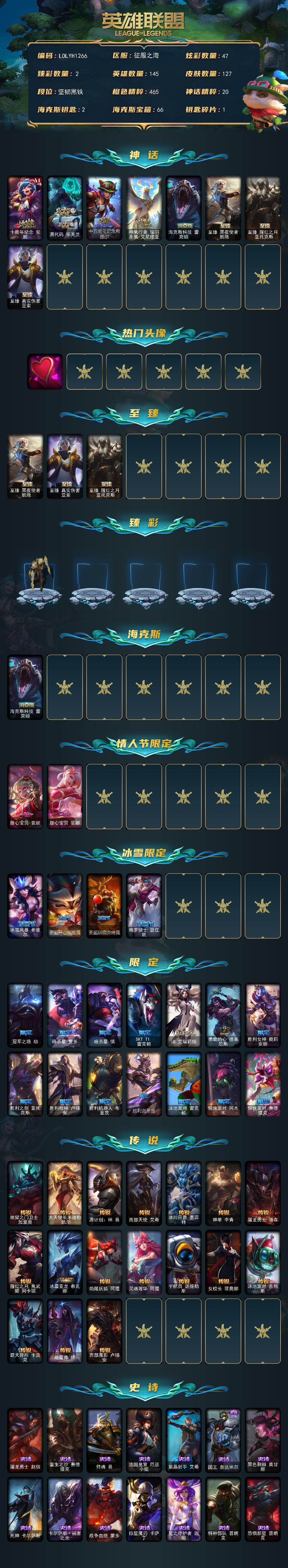【lolyh1266】145英雄/127皮肤/8神话/20限定/2臻彩/47炫彩/17传说/36史诗/未定级/十周年纪念安妮/源代码乐芙兰/十五周年纪念希维尔/神凰行者瑞羽圣凰艾尼维亚/海克斯科技雷克顿/至臻真实伤害亚索/至臻黑夜使者凯隐/至臻腥红之月亚托克斯/爱意绵绵头像/冠军之隐劫凯旋圣装/灵魂莲华亚索霜见之时/甜心宝贝安妮/甜心宝贝娑娜/冰雪风暴希维尔/圣诞开心鬼提莫/圣诞驯鹿克格莫/魄罗骑士瑟庄妮/冠军之隐劫/暗杀星蒙多/暗杀星慎/sktt1雷克顿/ig艾瑞莉娅/勇敢的心德莱厄斯/胜利女神奥莉安娜/胜利之剑亚托克斯/胜利呛神卢锡安/胜利机器人布里茨/胜利剑圣易/泳池派对雷克顿/惊悚派对阿木木/惊悚派对费德提克/地狱之门卫士加里奥/大天使长米迦勒凯尔/源计划林易/西部天使艾希/冰川巨兽墨菲特/神拳李青/屠龙勇士潘森/腥红之月鬼武姬阿卡丽/冰霜亚龙希瓦娜/焰尾妖狐阿狸/灵魂莲华阿狸/宇航员诺提勒斯/女校长菲奥娜/泳池派对吉格斯/霸天异形卡兹克/暗星尊烬/西部魔影卢锡安/屠龙勇士赵信/重生之沙费德提克/侍魂易/法国皇室厄运小姐/紫晶射手艾希/国王泰达米尔/黑色荆棘莫甘娜/死神卡尔萨斯/卡尔萨斯祸害之光/战争血统蒙多/掠星魔刃卡萨丁/星之守护者迦娜/特种部队普朗克/恐惧新星普朗克/枯萎之壤雷克顿/暗星嘉文四世/铁血猎手奈德丽/军神战甲波比/星之守护者波比/腥红之月凯南/腥红之月泰隆/腥红之月鬼武者慎/战国大名慎/暗星韦鲁斯/沙之守护卡兹克/天启骑士杰斯/源代码丽桑卓/腥红之月黛安娜/亚特兰蒂斯辛德拉/腥红之月亚索/弗雷尔卓德塔莉垭/屠龙勇士布隆/黯焰双魂千珏/炼狱魔女蔚/腥红之月锤石/上古战魂雷克塞/西部牛仔崔斯特/黑潮弗拉基米尔/幽魂费德提克/腥红之月易/沙之守护瑞兹/光明骑士希维尔/腥红之月希维尔/星之守护者索拉卡/约德尔海贼团崔丝塔娜/丛林侠盗艾希/腥红之月泰达米尔/武神贾克斯/玉剑传说苍鸾/尼斯巨兽科加斯/忍龟拉莫斯/莲花之令艾瑞莉娅/玉剑传说风仙子/海牛骑手库奇/绿野仙踪维迦/银白呛骑布里茨/腥红之月卡特琳娜/蛇发女妖卡西奥佩娅/法国女仆奈德丽/龙神之力乌迪尔/暗星莫德凯撒/苍穹之光约里克/超级英雄凯南/极寒慎/炎爆慎/主治医师慎/未来战士慎/奈落之炎慎/全金属狂潮维克托/瑟庄妮逐晓者/玉剑传说无双/创世之神赫卡里姆/弹幕天使卡莎/kda卡莎/灵魂莲华亚索/腥红之月亚托克斯/西部魔影锤石/腥红之月卡莉丝塔/腥红之月派克/灵魂莲华永恩/战斗学院永恩