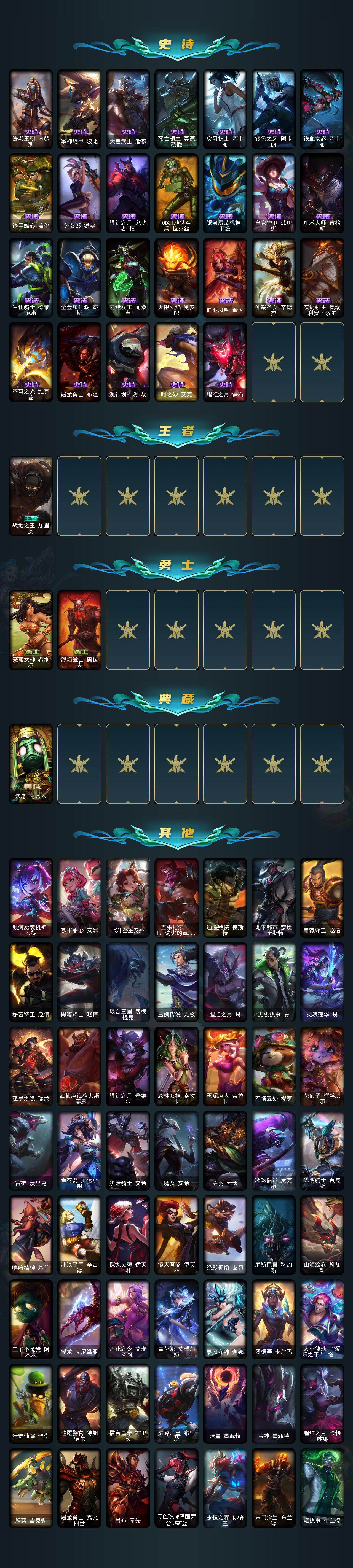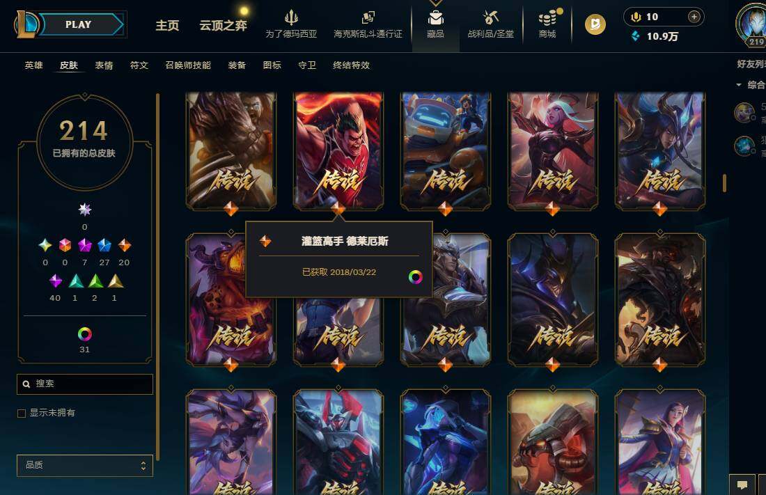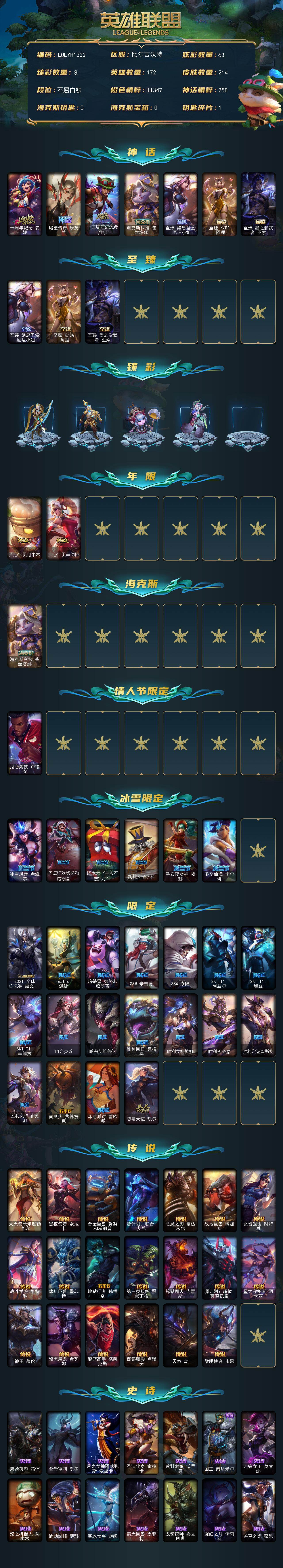 【lolyh1222】172英雄/214皮肤/7神话/27限定/8臻彩/63炫彩/20传说/40史诗/白银/10周年安妮/殿堂传奇乐芙兰/十五周年纪念希维尔/海克斯科技崔丝塔娜/至臻绝息圣堂厄运小姐/至臻k/da 阿狸/至臻墨之影武者亚索/冠军之箭艾希凯旋圣装/冠军之志瑞兹凯旋圣装/咖啡甜心璐璐焦糖布丁/海之歌艾希冰爽浪花/殿堂传奇乐芙兰登神/魔女阿卡丽虚荣/净雪之月莫甘娜冬虹/西部魔影执行人