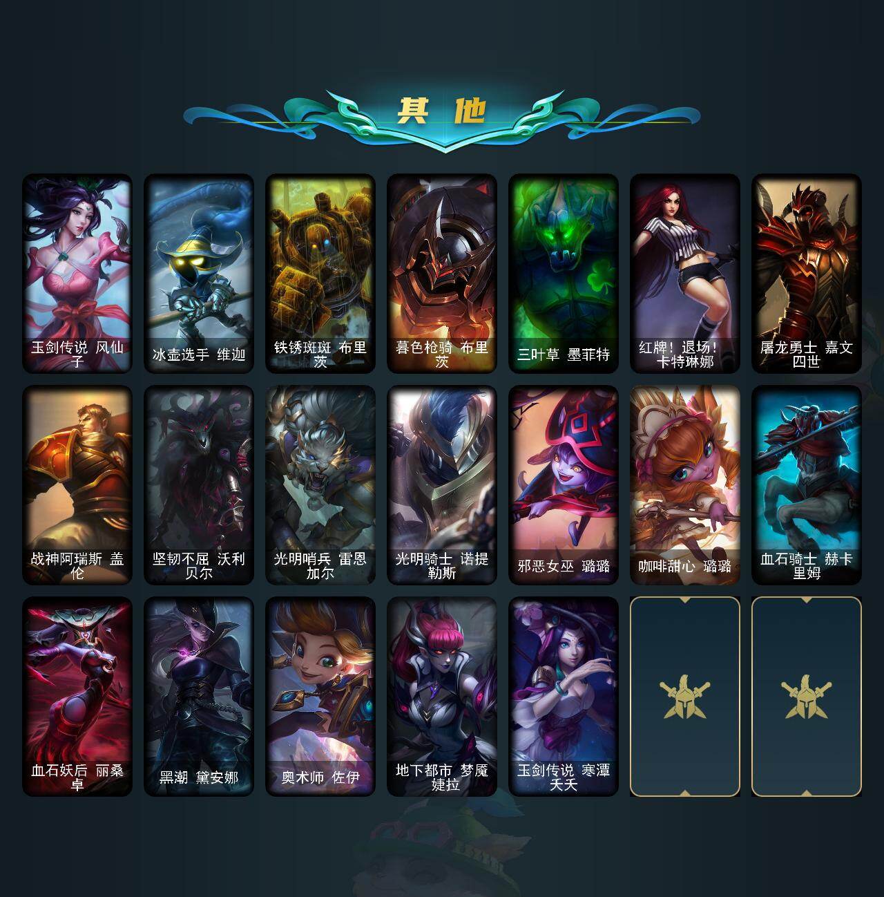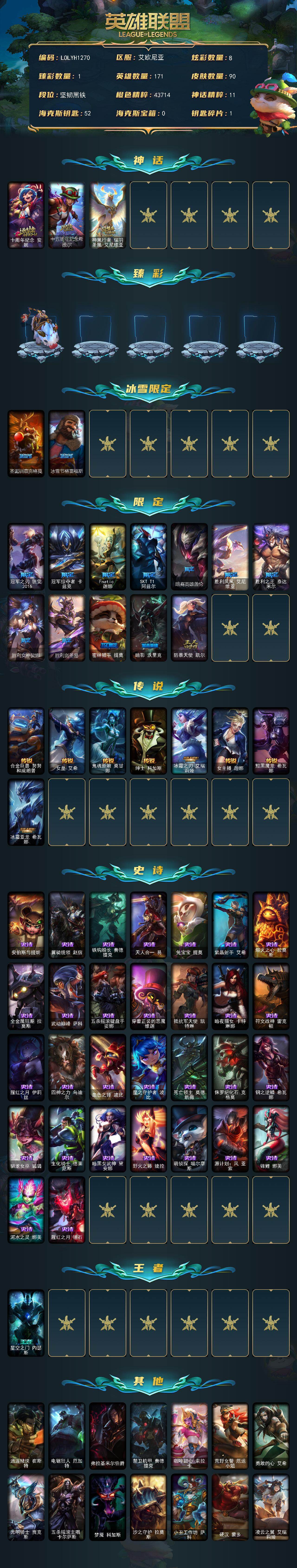 【lolyh1270】171英雄/90皮肤/3神话/15限定/1臻彩/8炫彩/8传说/30史诗/未定级/十周年纪念安妮/十五周年纪念希维尔/神凰行者瑞羽圣凰艾尼维亚/无畏骑士瑟庄妮赤子初心/圣诞驯鹿克格莫/冰雪节格雷福斯/冠军之刃锐雯2016/冠军掠夺者卡兹克/fnatic迦娜/sktt1阿兹尔/暗裔英雄盖伦/胜利凤凰艾尼维亚/胜利之王泰达米尔/胜利女神娑娜/胜利剑圣易/密林猎手提莫/暗影沃里克/防暴天使凯尔/合金巨兽努努和威朗普/女皇艾希/鬼魂新娘莫甘娜/绅士科加斯/冰霜之刃艾瑞莉娅/女主播迦娜/黯黑魔龙希瓦娜/冰霜亚龙希瓦娜/安伯斯与提妮/翼骑统领赵信/铁钩船长费德提克/天人合一易/兔宝宝提莫/紫晶射手艾希/熔火之心拉莫斯/全金属狂潮拉莫斯/武动巅峰萨科/五杀摇滚键盘手娑娜/穿着正装的恶魔维迦/抵抗军天使凯特琳/暗夜猫女卡特琳娜/符文战神雷克顿/腥红之月伊莉丝/四神之力乌迪尔/血色之锤波比/星之守护者波比/死亡领主莫德凯撒/侏罗纪化石克格莫/钢之逆鳞希瓦娜/驯龙女巫璐璐/生化骑士德莱厄斯/暗黑女武神黛安娜/野火之藤婕拉/萌侦探喵尔摩斯/源计划风亚索/锦鲤娜美/河水之灵娜美/腥红之月锤石/星空之门内瑟斯/赌侠崔斯特/电锯狂人厄加特/弗拉基米尔伯爵/禁卫机甲费德提克/咖啡甜心索拉卡/荒野女警厄运小姐/勇敢的心艾希/光明骑士贾克斯/五杀摇滚主唱卡尔萨斯/梦魇科加斯/沙之守护拉莫斯/小丑工作坊萨科/硬汉蒙多/凌云之翼艾瑞莉娅/玉剑传说风仙子/冰壶选手维迦/铁锈斑斑布里茨/暮色呛骑布里茨/三叶草墨菲特/红牌退场卡特琳娜/屠龙勇士嘉文四世/战神阿瑞斯盖伦/坚韧不屈沃利贝尔/光明哨兵雷恩加尔/光明骑士诺提勒斯/邪恶女巫璐璐/咖啡甜心璐璐/血石骑士赫卡里姆/血石妖后丽桑卓/黑潮黛安娜/奥术师佐伊/地下都市梦魇婕拉/玉剑传说寒潭夭夭
