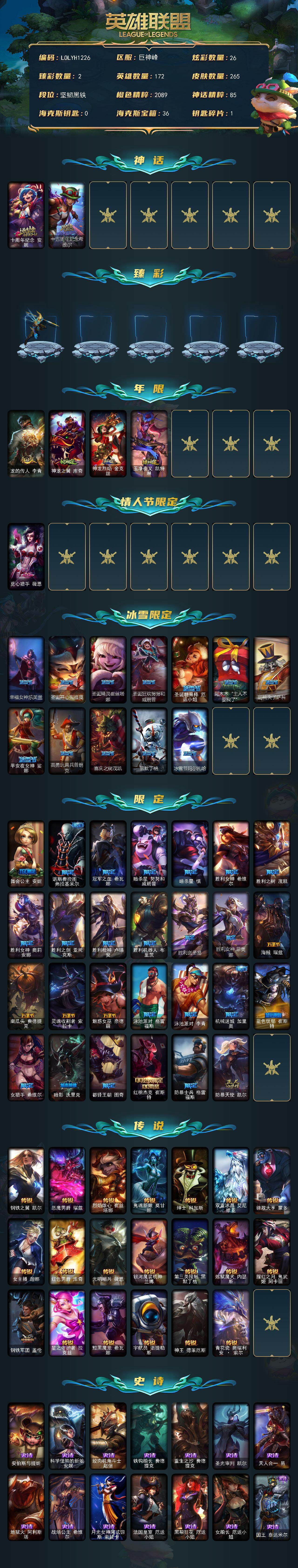 【lolyh1226】172英雄/265皮肤/2神话/45限定/2臻彩/26炫彩/20传说/67史诗/未定级/10周年安妮/十五周年纪念希维尔/冠军之矛卡莉丝塔凯旋圣装/红莲之刃锐雯/龙年盲僧/蛇年库奇/羊年金克丝/猴年凯特琳/觅心猎手薇恩/幸福女神乐芙兰/圣诞开心鬼提莫/圣诞精灵崔丝塔娜/圣诞狂欢努努/圣诞糖果棒女呛/“主人不要我了”阿木木/胡桃夹子小丑/平安夜女神琴女/英勇玩具兵普朗克/冰