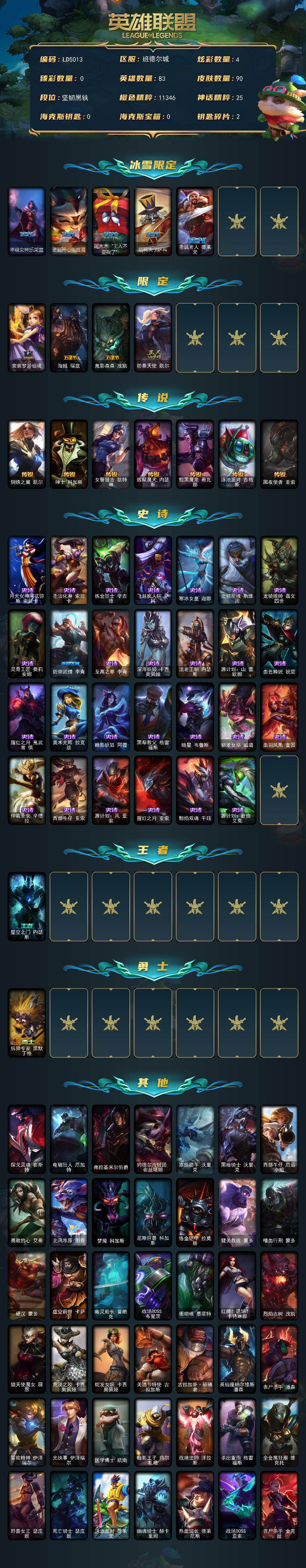 【ld5013】83英雄/90皮肤/9限定/4炫彩/7传说/27史诗/未定级账号等级:58/幸福女神乐芙兰/圣诞开心鬼提莫/阿木木“主人不要我了”/胡桃夹子萨科/圣诞老人德莱文/安妮梦游仙境/海贼瑞兹/鬼影森森茂凯/防暴天使凯尔/钢铁之翼凯尔/绅士科加斯/女警狙击凯特琳/炼狱魔犬内瑟斯/黯黑魔龙希瓦娜/泳池派对吉格斯/黑夜使者亚索/月光女神阿忒弥斯索拉卡/圣洁化身索拉卡/炼金狂士辛吉德/飞越疯人院萨科/寒冰女皇迦娜/北领前线斯维因/龙骑统帅嘉文四世/灵骨工匠奥莉安娜/防弹武僧李青/至高之拳李青/深海妖姬卡西奥佩娅/法老王朝内瑟斯/源计划山蕾欧娜/血色精锐锐雯/腥红之月鬼武者慎/奥术光辉拉克丝/暗影妖狐阿狸/黑帮教父格雷福斯/暗星韦鲁斯/驯龙女巫璐璐/血羽凤凰奎因/仲裁圣女辛德拉/西部牛仔亚索/源计划风亚索/腥红之月亚索/黯焰双魂千珏/源计划自由艾克/星空之门内瑟斯/拆弹专家黑默丁格/探戈灵魂崔斯特/电锯狂人厄加特/弗拉基米尔伯爵/约德尔海贼团崔丝塔娜/冻原猎手沃里克/黑暗骑士沃里克/西部牛仔厄运小姐/勇敢的心艾希/北风冻原图奇/梦魇科加斯/尼斯巨兽科加斯/铬金铠甲拉莫斯/健美教练蒙多/嗜血行刑蒙多/硬汉蒙多/虚空前世卡萨丁/幽灵船长普朗克/战场boss布里茨/珊瑚礁墨菲特/红牌退场卡特琳娜/烈焰古树茂凯/猎天使魔女薇恩/荒漠之咬卡西奥佩娅/蛇发女妖卡西奥佩娅/美酒节特使古拉加斯/古拉加斯碎桶者/英仙座珀尔修斯潘森/丧尸杀手潘森/冒险精神伊泽瑞尔/光执事伊泽瑞尔/医学博士凯南/暗影王子玛尔扎哈/战地法师泽拉斯/杀出重围格雷福斯/全金属狂潮维克托/野兽女王瑟庄妮/死亡骑士瑟庄妮/泳池派对德莱文/幽魂骑士赫卡里姆/热血班长德莱厄斯/战场boss亚索/丧尸杀手金克丝/海牛大大塔姆/夺命前锋卢锡安