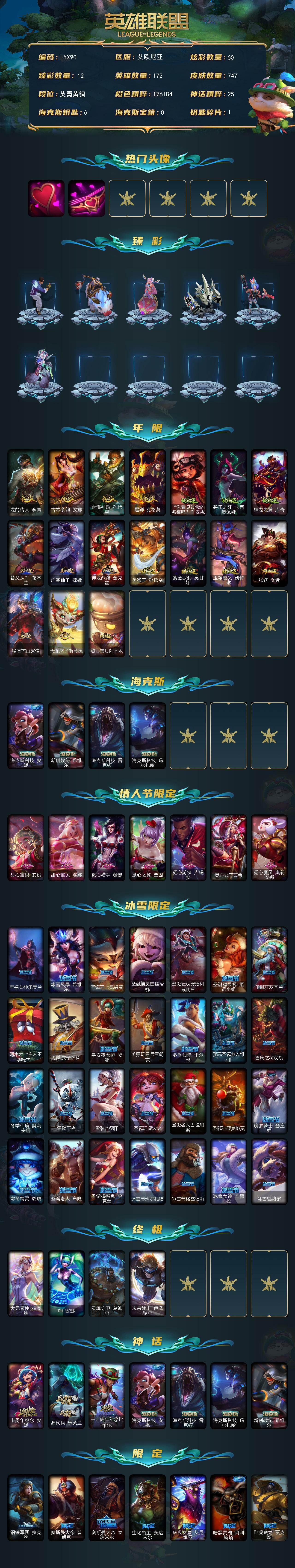 [16557574]【特价出售/店主推荐】青铜段位-172英雄-747皮肤-60炫彩-4终极-7神话-150限定-56传说-187史诗 【热门头像】:爱意绵绵头像,爱情之歌头像 【臻彩皮肤】:龙的传人李青跃龙在渊,天龙之子卡莎飞龙乘云,无畏骑士瑟庄妮赤子初心,墨之影武者亚索金墨耀影,斗魂觉醒拉克丝无限斗志,星之守护者萨勒芬妮未来之光,霸天巨兽雪崩墨菲特,幻灵战斗队长厄运小姐勇气赞歌,魔女阿卡丽虚荣,净雪之月莫甘娜冬虹,水晶玫瑰斯维因纯洁花蕾,心之钢伊泽瑞尔天纵才华 【年限皮肤】:龙的传人李青,古琴余韵娑娜,定海神珍孙悟空,醒狮克格莫,你看见过我的熊猫吗安妮,碧玉之牙卡西奥佩娅,神龙之翼库奇,替父从军花木兰,广寒仙子嫦娥,神龙烈焰金克丝,美猴王孙悟空,紫金罗刹莫甘娜,玉净夜叉凯特琳,张辽文远,猛虎下山赵信,天龙之子斯莫德,点心宝贝阿木木 【海克斯皮肤】:海克斯科技安妮,新创战纪希维尔,海克斯科技雷克顿,海克斯科技玛尔扎哈 【情人节限定】:甜心宝贝安妮,甜心宝贝娑娜,觅心猎手薇恩,觅心之翼奎因,觅心游侠卢锡安,觅心女王艾希,觅心魔灵奥莉安娜 【冰雪限定】:幸福女神乐芙兰,冰雪风暴希维尔,圣诞开心鬼提莫,圣诞精灵崔丝塔娜,圣诞狂欢努努和威朗普,圣诞糖果棒厄运小姐,圣诞狂欢基兰,阿木木“主人不要我了”,胡桃夹子萨科,平安夜女神娑娜,英勇玩具兵普朗克,冬季仙境卡尔玛,邪恶圣诞老人维迦,喜庆之树茂凯,冬季仙境奥莉安娜,雪默丁格,雪装奈德丽,圣诞玩偶波比,圣诞老人古拉加斯,圣诞驯鹿克格莫,魄罗骑士瑟庄妮,寒冬精灵璐璐,圣诞老人布隆,圣诞捣蛋鬼金克丝,冰雪节玛尔扎哈,冰雪节格雷福斯,冰雪女神辛德拉,冰雪兽纳尔 【终极皮肤】:大元素使拉克丝,dj娑娜,灵魂守卫乌迪尔,未来战士伊泽瑞尔 【神话皮肤】:十周年纪念安妮,源代码乐芙兰,十五周年纪念希维尔,海克斯科技安妮,海克斯科技雷克顿,海克斯科技玛尔扎哈,新创战纪希维尔 【限定皮肤】:钢铁军团拉克丝,奥斯曼大帝普朗克,奥斯曼大帝泰达米尔,生化领主泰达米尔,庆典女皇艾尼维亚,暗黑灵魂阿利斯塔,卧虎藏龙贾克斯,舞会公主安妮,诺斯费拉图弗拉基米尔,养蜂人辛吉德,冠军之刃锐雯,冠军典狱长锤石,冠军之矛卡莉丝塔,冠军之刃锐雯2016,冠军之隐劫,fnatic古拉加斯,fnatic迦娜,暗杀星奥莉安娜,暗杀星蒙多,暗杀星努努和威朗普,暗杀星慎,暗杀星伊泽瑞尔,sktt
