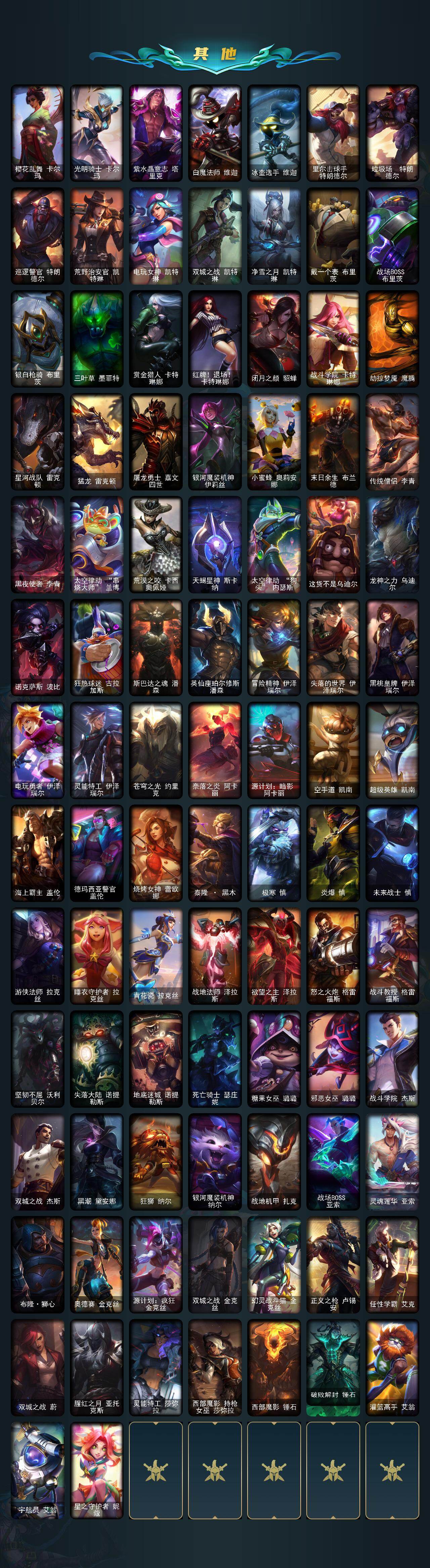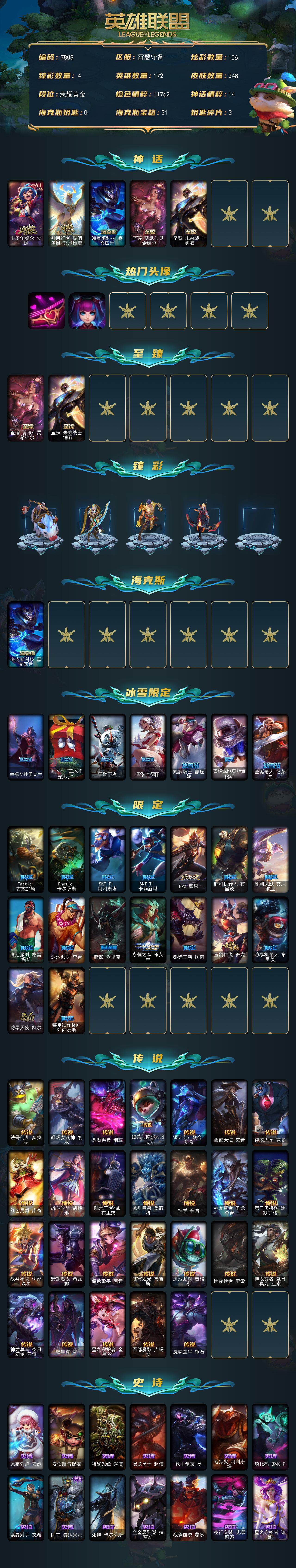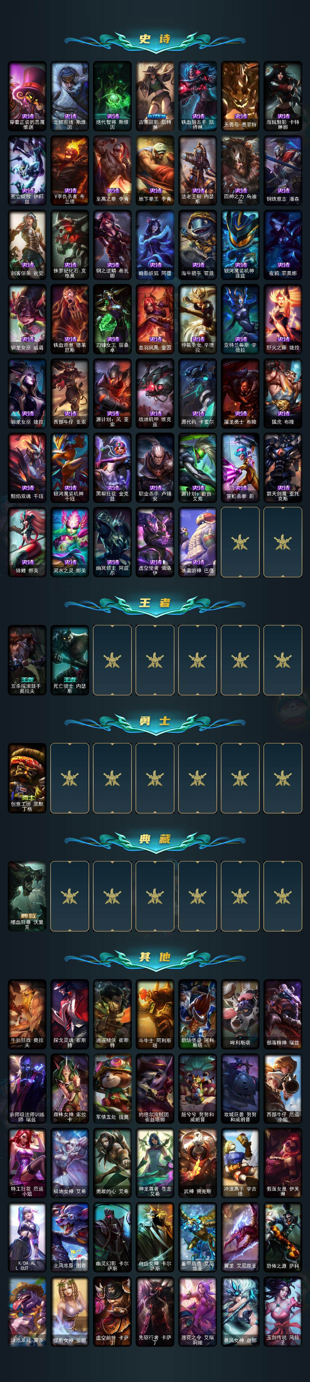 黄金段位-172英雄-248皮肤-156炫彩-0终极-5神话-24限定-26传说-61史诗 【神话皮肤】:十周年纪念安妮,神凰行者瑞羽圣凰艾尼维亚,海克斯科技嘉文四世,至臻剪纸仙灵希维尔,至臻未来战士锤石 【热门头像】:爱情之歌头像,银河魔装机神安妮头像 【至臻皮肤】:至臻剪纸仙灵希维尔,至臻未来战士锤石 【臻彩皮肤】:无畏骑士瑟庄妮赤子初心,冠军之箭艾希凯旋圣装,神龙尊者圣龙李青龙腾云起,源计划联合艾希红莲之弓 【海克斯皮肤】:海克斯科技嘉文四世 【冰雪限定】:幸福女神乐芙兰,阿木木“主人不要我了”,雪默丁格,雪装奈德丽,魄罗骑士瑟庄妮,雪球也能爆炸吉格斯,圣诞老人德莱文 【限定皮肤】:fnatic古拉加斯,fnatic卡尔萨斯,sktt1阿利斯塔,sktt1卡莉丝塔,f薇恩,胜利机器人布里茨,胜利凤凰艾尼维亚,泳池派对格雷福斯,泳池派对李青,暗影沃里克,永恒之森乐芙兰,都铎王朝图奇,玉剑传说舞龙卫,防暴机器人布里茨,防暴天使凯尔,警用试作体k9内瑟斯 【传说皮肤】:铁哥们儿奥拉夫,战场女武神凯尔,恶魔男爵瑞兹,提莫约德尔人的一大步,源计划联合艾希,西部天使艾希,律政大亨蒙多,红色男爵库奇,战斗学院凯特琳,陆地王者4wd布里茨,冰川巨兽墨菲特,神拳李青,神龙尊者圣龙李青,第三类接触黑默丁格,战斗学院伊泽瑞尔,黯黑魔龙希瓦娜,偶像歌手阿狸,苍穹之光韦鲁斯,泳池派对吉格斯,黑夜使者亚索,神龙尊者昼日真龙亚索,神龙尊者夜月幻龙亚索,暗星尊烬,星之守护者金克丝,西部魔影卢锡安,灵魂莲华锤石 【史诗皮肤】:冰霜烈焰安妮,安伯斯与提妮,特战先锋赵信,屠龙勇士赵信,铁血剑豪易,地狱火阿利斯塔,源代码索拉卡,紫晶射手艾希,国王泰达米尔,死神卡尔萨斯,全金属狂潮拉莫斯,战争血统蒙多,夜行义贼艾瑞莉娅,星之守护者迦娜,穿着正装的恶魔维迦,北领前线斯维因,绝代智将斯维因,古墓丽影凯特琳,铁血狙击手凯特琳,无畏号墨菲特,海贼魅影卡特琳娜,死亡绽放伊莉丝,v字仇杀者布兰德,至高之拳李青,地下拳王李青,法老王朝内瑟斯,四神之力乌迪尔,钢铁意志潘森,刺客信条锐雯,侏罗纪化石克格莫,钢之逆鳞希瓦娜,暗影妖狐阿狸,海牛猎手菲兹,银河魔装机神菲兹,夜鸦菲奥娜,驯龙女巫璐璐,铁血帝皇德莱厄斯,刀锋女王丽桑卓,血羽凤凰奎因,仲裁圣女辛德拉,亚特兰蒂斯辛德拉,野火之藤婕拉,驯龙女巫婕拉,西部牛仔亚索,源计划风亚索,战地机甲维克兹,源代码卡蜜尔,屠龙勇士布隆,猛虎布隆,黯焰双魂千珏,银河魔装机神千珏,黑帮狂花金克丝,职业杀手卢锡安,源计划自由艾克,霓虹杀拳蔚,霸天剑魔亚托克斯,锦鲤娜美,河水之灵娜美,幽冥领主阿兹尔,虚空使者俄洛伊,冰雪游神巴德 【王者皮肤】:五杀摇滚鼓手奥拉夫,死亡骑士内瑟斯 【勇士皮肤】:创意工坊黑默丁格 【典藏皮肤】:嗜血狂暴沃里克 【其他皮肤1】:牛扒狂战奥拉夫,探戈灵魂崔斯特,赌侠崔斯特,斗牛士阿利斯塔,后场堡垒阿利斯塔,哞利斯塔,部落精神瑞兹,宗师级法师训练师瑞兹,森林女神索拉卡,军情五处提莫,约德尔海贼团崔丝塔娜,脏兮兮努努和威朗普,攻城巨兽努努和威朗普,西部牛仔厄运小姐,特工狂花厄运小姐,极地女神艾希,勇敢的心艾希,神龙尊者苍龙艾希,武神贾克斯,冲浪高手辛吉德,假面女皇伊芙琳,kdaallout伊芙琳,北风冻原图奇,幽灵幻影卡尔萨斯,自由女神卡尔萨斯,重甲猎鹰艾尼维亚,翼龙艾尼维亚,恐怖之源萨科,泳池派对蒙多,缪斯女神娑娜,虚空前世卡萨丁,先驱行者卡萨丁,莲花之令艾瑞莉娅,暴风女神迦娜,玉剑传说风仙子,樱花乱舞卡尔玛,光明骑士卡尔玛,紫水晶意志塔里克,白魔法师维迦,冰壶选手维迦,里尔击球手特朗德尔,垃圾场特朗德尔,巡逻警官特朗德尔,荒野治安官凯特琳,电玩女神凯特琳,双城之战凯特琳,净雪之月凯特琳,戴一个表布里茨,战场boss布里茨,银白呛骑布里茨,三叶草墨菲特,赏金猎人卡特琳娜,红牌退场卡特琳娜,闭月之颜貂蝉,战斗学院卡特琳娜,劫掠梦魇魔腾,星河战队雷克顿,猛龙雷克顿,屠龙勇士嘉文四世,银河魔装机神伊莉丝,小蜜蜂奥莉安娜,末日余生布兰德,传统僧侣李青,黑夜使者李青,太空律动串烧大师兰博,荒漠之咬卡西奥佩娅,天蝎星神斯卡纳,太空律动狗头内瑟斯,这货不是乌迪尔,龙神之力乌迪尔,诺克萨斯波比,狂热球迷古拉加斯,斯巴达之魂潘森,英仙座珀尔修斯潘森,冒险精神伊泽瑞尔,失落的世界伊泽瑞尔,黑桃皇牌伊泽瑞尔,电玩勇者伊泽瑞尔,灵能特工伊泽瑞尔,苍穹之光约里克,奈落之炎阿卡丽,源计划暗影阿卡丽,空手道凯南,超级英雄凯南,海上霸主盖伦,德玛西亚警官盖伦,烧烤女神蕾欧娜,泰隆黑木,极寒慎,炎爆慎,未来战士慎,游侠法师拉克丝,睡衣守护者拉克丝,青花瓷拉克丝,战地法师泽拉斯,欲望之主泽拉斯,怒之火炮格雷福斯,战斗教授格雷福斯,坚韧不屈沃利贝尔,失落大陆诺提勒斯,地底迷城诺提勒斯,死亡骑士瑟庄妮,糖果女巫璐璐,邪恶女巫璐璐,战斗学院杰斯,双城之战杰斯,黑潮黛安娜,狂狮纳尔,银河魔装机神纳尔,战地机甲扎克,战场boss亚索,灵魂莲华亚索,布隆狮心,奥德赛金克丝,源计划疯狂金克丝,双城之战金克丝,幻灵战斗猫金克丝,正义之呛卢锡安,任性学霸艾克,双城之战蔚,腥红之月亚托克斯,灵能特工莎弥拉,西部魔影持呛女巫莎弥拉,西部魔影锤石,破败解封锤石,灌篮高手艾翁,宇航员艾翁,星之守护者妮蔻