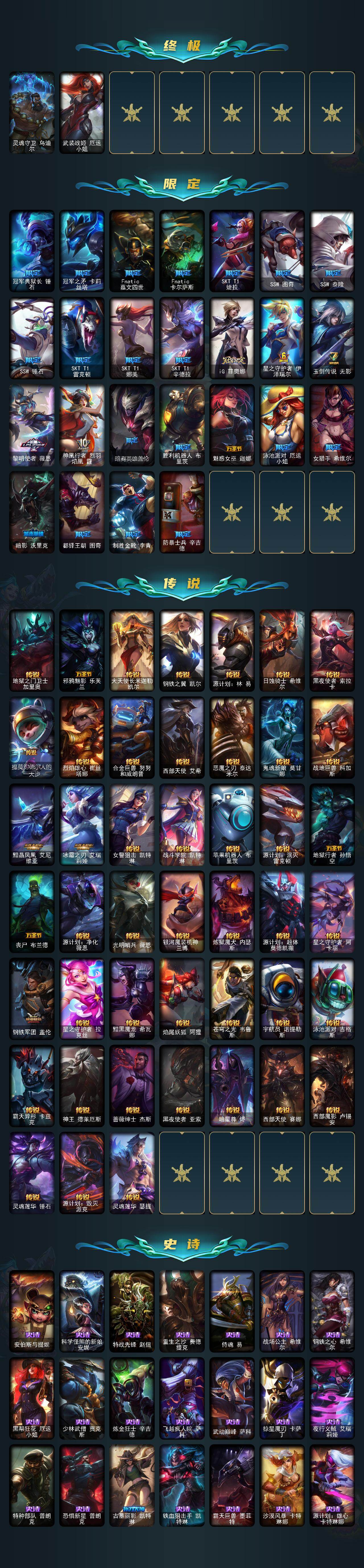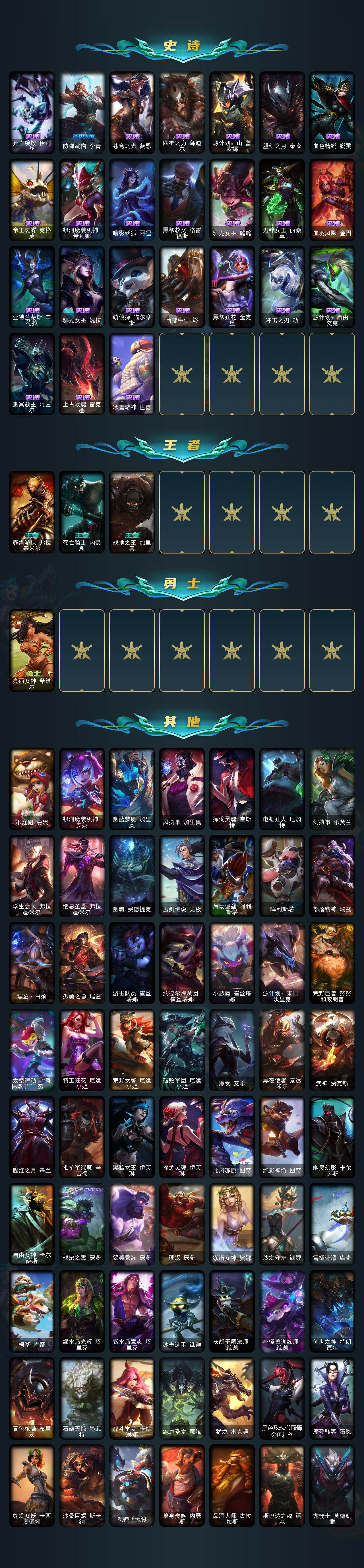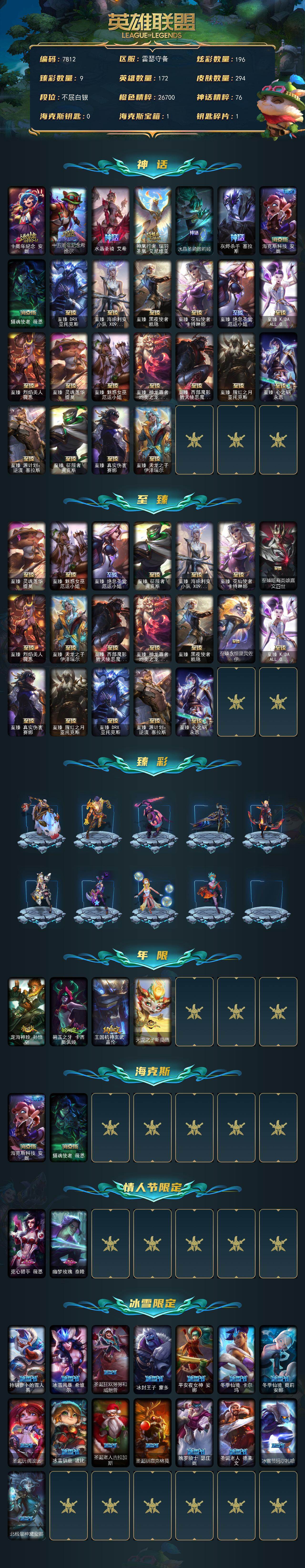 白银段位-172英雄-294皮肤-196炫彩-2终极-27神话-47限定-45传说-45史诗 【神话皮肤】:十周年纪念安妮,十五周年纪念希维尔,水晶圣骑艾希,神凰行者瑞羽圣凰艾尼维亚,水晶圣骑塔莉娅,灰烬杀手塞拉斯,海克斯科技安妮,摄魂使者薇恩,至臻征服者贾克斯,至臻真实伤害赛娜,至臻天龙之子伊泽瑞尔,至臻drx亚托克斯,至臻海珀利安小队x09星环灵风迦娜,至臻黑夜使者凯隐,至臻花仙使者卡特琳娜,至臻绝息圣堂厄运小姐,至臻kdaallout卡莎,至臻烈焰美人薇恩,至臻灵魂莲华提莫,至臻魅惑女巫厄运小姐,至臻神龙尊者均衡之龙沃利贝尔,至臻西部魔影猎天使恶魔泰隆,至臻腥红之月亚托克斯,至臻心之钢永恩,至臻源计划逆流塞拉斯 【至臻皮肤】:至臻灵魂莲华提莫,至臻魅惑女巫厄运小姐,至臻绝息圣堂厄运小姐,至臻征服者贾克斯,至臻海珀利安小队x09星环灵风迦娜,至臻花仙使者卡特琳娜,至臻暗裔英雄嘉文四世,至臻烈焰美人薇恩,至臻天龙之子伊泽瑞尔,至臻西部魔影猎天使恶魔泰隆,至臻神龙尊者均衡之龙沃利贝尔,至臻黑夜使者凯隐,至臻永恒星灵佐伊,至臻kdaallout卡莎,至臻真实伤害赛娜,至臻腥红之月亚托克斯,至臻drx亚托克斯,至臻源计划逆流塞拉斯,至臻心之钢永恩 【臻彩皮肤】:无畏骑士瑟庄妮赤子初心,神龙尊者圣龙李青龙腾云起,源计划毁灭派克幻灭,西部天使赛娜神选天使长,源计划联合艾希红莲之弓,咖啡甜心金克丝核桃巴菲,星之守护者金克丝黑洞,泳池派对辛德拉荔枝枝连击,灵魂莲华锐雯流火 【年限皮肤】:定海神珍孙悟空,碧玉之牙卡西奥佩娅,王国机神玄武盖伦,天龙之子斯莫德 【海克斯皮肤】:海克斯科技安妮,摄魂使者薇恩 【情人节限定】:觅心猎手薇恩,幽梦玫瑰泰隆 【冰雪限定】:持胡萝卜的雪人易,冰雪风暴希维尔,圣诞狂欢努努和威朗普,冰封王子蒙多,平安夜女神娑娜,冬季仙境卡尔玛,冬季仙境奥莉安娜,圣诞玩偶波比,冰雪驯鹿波比,圣诞老人古拉加斯,圣诞驯鹿克格莫,魄罗骑士瑟庄妮,圣诞老人德莱文,冰雪节玛尔扎哈,北极星神黛安娜 【终极皮肤】:灵魂守卫乌迪尔,武装战姬厄运小姐 【限定皮肤】:冠军典狱长锤石,冠军之矛卡莉丝塔,fnatic嘉文四世,fnatic卡尔萨斯,sktt1婕拉,ssw图奇,ssw泰隆,ssw锤石,sktt1雷克顿,sktt1娜美,sktt1辛德拉,ig菲奥娜,星之守护者伊泽瑞尔,玉剑传说无影,黎明使者薇恩,神凰行者烈羽焰凰霞,暗裔英雄盖伦,胜利机器人布里茨,魅惑女巫迦娜,泳池派对厄运小姐,女猎手希维尔,暗影沃里克,都铎王朝图奇,制胜金靴李青,防暴士兵辛吉德 【传说皮肤】:地狱之门卫士加里奥,邪鸦魅影乐芙兰,大天使长米迦勒凯尔,钢铁之翼凯尔,源计划林易,日蚀骑士希维尔,黑夜使者索拉卡,提莫约德尔人的一大步,烈焰雄心崔丝塔娜,合金巨兽努努和威朗普,西部天使艾希,恶魔之刃泰达米尔,鬼魂新娘莫甘娜,战地巨兽科加斯,黯晶凤凰艾尼维亚,冰霜之刃艾瑞莉娅,女警狙击凯特琳,战斗学院凯特琳,苹果机器人布里茨,源计划泯灭雷克顿,地狱行者孙悟空,丧尸布兰德,源计划净化薇恩,光明哨兵薇恩,银河魔装机神兰博,炼狱魔犬内瑟斯,源计划超体莫德凯撒,星之守护者阿卡丽,钢铁军团盖伦,星之守护者拉克丝,黯黑魔龙希瓦娜,焰尾妖狐阿狸,苍穹之光韦鲁斯,宇航员诺提勒斯,泳池派对吉格斯,霸天异形卡兹克,神王德莱厄斯,蔷薇绅士杰斯,黑夜使者亚索,暗星尊烬,西部天使赛娜,西部魔影卢锡安,灵魂莲华锤石,源计划毁灭派克,灵魂莲华瑟提 【史诗皮肤】:安伯斯与提妮,科学怪熊的新娘安妮,特战先锋赵信,重生之沙费德提克,侍魂易,战场公主希维尔,钢铁之心希维尔,黑帮狂花厄运小姐,少林武僧贾克斯,炼金狂士辛吉德,飞越疯人院萨科,武动巅峰萨科,掠星魔刃卡萨丁,夜行义贼艾瑞莉娅,特种部队普朗克,恐惧新星普朗克,古墓丽影凯特琳,铁血狙击手凯特琳,霸天巨兽墨菲特,沙漠风暴卡特琳娜,源计划雄心卡特琳娜,死亡绽放伊莉丝,防弹武僧李青,苍穹之光薇恩,四神之力乌迪尔,源计划山蕾欧娜,腥红之月泰隆,血色精锐锐雯,帝王斑蝶克格莫,银河魔装机神希瓦娜,暗影妖狐阿狸,黑帮教父格雷福斯,驯龙女巫璐璐,刀锋女王丽桑卓,血羽凤凰奎因,亚特兰蒂斯辛德拉,驯龙女巫婕拉,萌侦探喵尔摩斯,西部牛仔烬,黑帮狂花金克丝,冲击之刃劫,源计划自由艾克,幽冥领主阿兹尔,上古战魂雷克塞,冰雪游神巴德 【王者皮肤】:霹雳游侠弗拉基米尔,死亡骑士内瑟斯,战地之王加里奥 【勇士皮肤】:亮丽女神希维尔 【其他皮肤1】:小红帽安妮,银河魔装机神安妮,幽蓝梦魇加里奥,风执事加里奥,探戈灵魂崔斯特,电锯狂人厄加特,幻执事乐芙兰,学生会长弗拉基米尔,绝息圣堂弗拉基米尔,幽魂费德提克,玉剑传说无极,后场堡垒阿利斯塔,哞利斯塔,部落精神瑞兹,瑞兹白须,孤勇之隐瑞兹,游击队员崔丝塔娜,约德尔海贼团崔丝塔娜,小恶魔崔丝塔娜,源计划末日沃里克,荒野巨兽努努和威朗普,太空律动舞林双子努努和威朗普,特工狂花厄运小姐,荒野女警厄运小姐,破败军团厄运小姐,魔女艾希,黑夜使者泰达米尔,武神贾克斯,腥红之月基兰,抵抗军绿魔辛吉德,黑暗女王伊芙琳,探戈灵魂伊芙琳,北风冻原图奇,绝影神偷图奇,幽灵幻影卡尔萨斯,自由女神卡尔萨斯,战栗之毒蒙多,健美教练蒙多,硬汉蒙多,缪斯女神娑娜,沙之守护迦娜,雪橇速滑库奇,柯基库奇,绿水晶光辉塔里克,紫水晶意志塔里克,冰壶选手维迦,灰