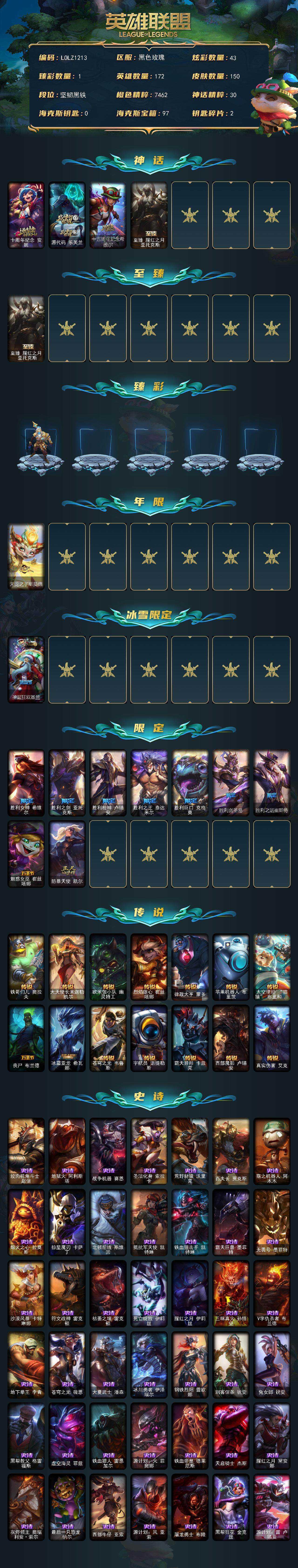 【lolz1213】172英雄/150皮肤/4神话/11限定/1臻彩/43炫彩/14传说/44史诗/未定级/十周年纪念安妮/源代码乐芙兰/十五周年纪念希维尔/至臻腥红之月亚托克斯/冠军之志瑞兹凯旋圣装/天龙之子斯莫德/圣诞狂欢基兰/胜利女神希维尔/胜利之剑亚托克斯/胜利呛神卢锡安/胜利之王泰达米尔/胜利巨口克格莫/胜利剑圣易/胜利之运崔斯特/魅惑女巫崔丝塔娜/防暴天使凯尔/铁哥们儿奥拉夫/大天使长米迦勒凯尔/欧米伽小队幽灵特工/烈焰雄心崔丝塔娜/律政大亨蒙多/苹果机器人布里茨/太空律动猫猫布里和里茨/丧尸布兰德/冰霜亚龙希瓦娜/苍穹之光韦鲁斯/宇航员诺提勒斯/霸天异形卡兹克/西部魔影卢锡安/真实伤害艾克/绞肉机角斗士赵信/地狱火阿利斯塔/战争机器赛恩/圣洁化身索拉卡/荒野豺狼沃里克/百夫长贾克斯/殇之机器人阿木木/熔火之心拉莫斯/掠星魔刃卡萨丁/北领前线斯维因/抵抗军天使凯特琳/铁血狙击手凯特琳/霸天巨兽墨菲特/无畏号墨菲特/沙漠风暴卡特琳娜/符文战神雷克顿/枯萎之壤雷克顿/死亡绽放伊莉丝/腥红之月伊莉丝/三昧真火孙悟空/v字仇杀者布兰德/地下拳王李青/苍穹之光薇恩/大夏武士潘森/冰川勇者伊泽瑞尔/钢铁烈阳蕾欧娜/刺客信条锐雯/兔女郎锐雯/黑帮教父格雷福斯/虚空海灵菲兹/铁血猎人雷恩加尔/源计划火菲奥娜/铁血帝皇德莱厄斯/天启骑士杰斯/腥红之月黛安娜/灰烬领主奥瑞利安索尔/最后一只恐龙纳尔/西部牛仔亚索/源计划风亚索/屠龙勇士布隆/黑帮狂花金克丝/源计划雷卢锡安/冲击之刃劫/星际之门阿兹尔/战地之王加里奥/探戈灵魂崔斯特/未来战士崔斯特/赵云子龙/弗拉基米尔伯爵/玉剑传说无极/腥红之月易/金牛座阿利斯塔/荒野镖客阿利斯塔/哞利斯塔/部落精神瑞兹/原野伐木工赛恩/腥红之月希维尔/军情五处提莫/约德尔海贼团崔丝塔娜/特工狂花厄运小姐/梦魇泰达米尔/腥红之月泰达米尔/宗师级钓鱼训练师贾克斯/武神贾克斯/腥红之月基兰/腥红之月伊芙琳/五杀摇滚主唱卡尔萨斯/尼斯巨兽科加斯/战栗之毒蒙多/先驱行者卡萨丁/紫水晶意志塔里克/白魔法师维迦/垃圾场特朗德尔/铁锈斑斑布里茨/银白呛骑布里茨/腥红之月卡特琳娜/荒野之咬雷克顿/猛龙雷克顿/鳄霸雷克顿/黑色玫瑰假面舞会伊莉丝/热带丛林兰博/废土男爵兰博/上古魔蛇卡西奥佩娅/沙暴巨蝎斯卡纳/创世之神内瑟斯/诺克萨斯波比/品酒大师古拉加斯/美酒节特使古拉加斯/狂热球迷古拉加斯/英仙座珀尔修斯潘森/冒险精神伊泽瑞尔/光执事伊泽瑞尔/龙骑士莫德凯撒/五杀摇滚贝斯手约里克/蜂刺阿卡丽/银色闪电凯南/空手道凯南/海上霸主盖伦/烧烤女神蕾欧娜/暗影王子玛尔扎哈/主治医师慎/太空律动闪耀灯球拉克丝/符文生物泽拉斯/战地法师泽拉斯/高丽风情阿狸/警长沃利贝尔/坚韧不屈沃利贝尔/造物主维克托/野兽女王瑟庄妮/玉剑传说无双/少校吉格斯/糖果女巫璐璐/方块王后辛德拉/鬼影森森婕拉/战地机甲扎克/夺命前锋卢锡安/任性学霸艾克/腥红之月亚托克斯/战斗校长悠米/腥红之月卡莉丝塔/腥红之月派克