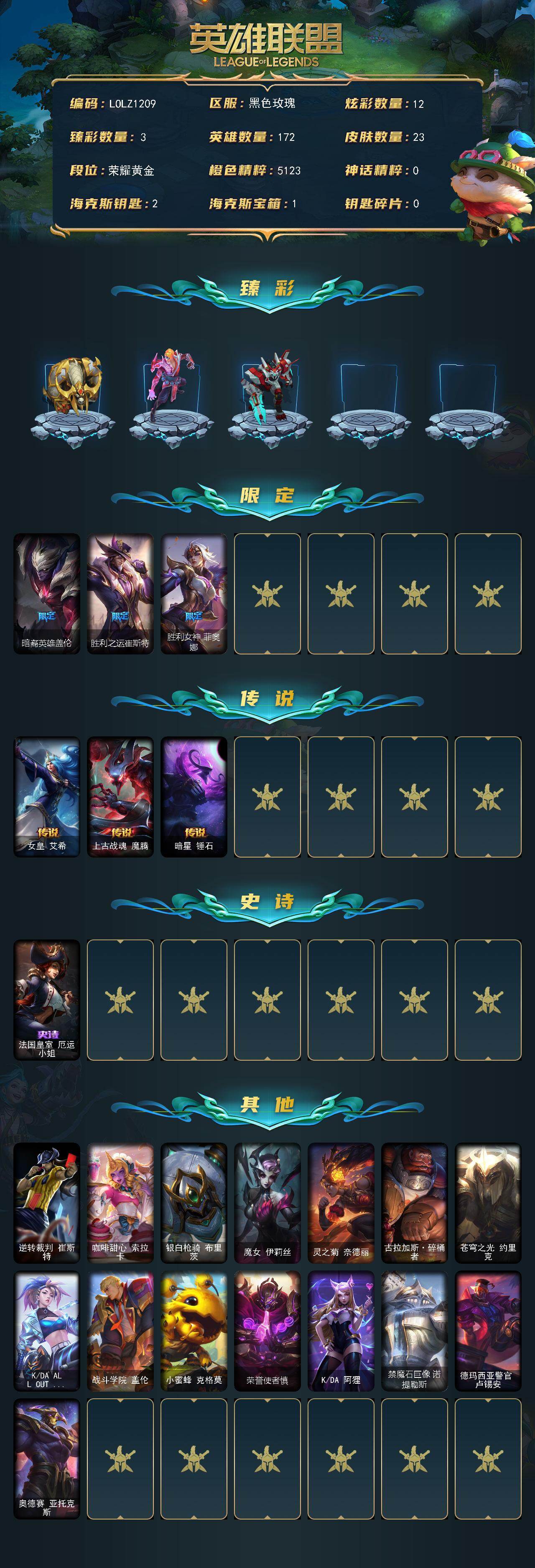 【lolz1209】172英雄/23皮肤/4限定/3臻彩/12炫彩/3传说/1史诗/黄金账号等级:227/征服者阿利斯塔炫金/神龙尊者圣龙李青登龙/霸天战士雷恩加尔星啸天火/暗裔英雄盖伦/胜利之运崔斯特/胜利女神菲奥娜/女皇艾希/上古战魂魔腾/暗星锤石/法国皇室厄运小姐/逆转裁判崔斯特/咖啡甜心索拉卡/银白呛骑布里茨/魔女伊莉丝/灵之菊奈德丽/古拉加斯碎桶者/苍穹之光约里克/kdaallout阿卡丽/战斗学院盖伦/小蜜蜂克格莫/荣誉使者慎/kda阿狸/禁魔石巨像诺提勒斯/德玛西亚警官卢锡安/奥德赛亚托克斯