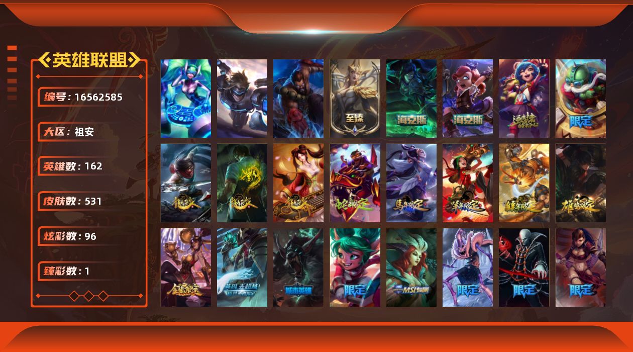 [16562585]【特价出售/店主推荐】 未定级段位-162英雄-531皮肤-96炫彩-3终极-5神话-99限定-45传说-144史诗 【神话皮肤】:十周年纪念安妮,神凰行者瑞羽圣凰艾尼维亚,海克斯科技安妮,摄魂使者薇恩,至臻魔女乐芙兰 【热门头像】:卡特琳娜的匕首头像 【至臻皮肤】:至臻魔女乐芙兰 【臻彩皮肤】:神龙烈焰金克丝珍珠龙息 【年限皮肤】:龙的传人李青,银龙裁决泰隆,古琴余韵娑娜,定海神珍孙悟空,碧玉之牙卡西奥佩娅,神龙之翼库奇,广寒仙子嫦娥,神龙烈焰金克丝,美猴王孙悟空,虎痴之拳蔚,烈焰美人薇恩 【海克斯皮肤】:海克斯科技安妮,摄魂使者薇恩 【情人节限定】:甜心宝贝安妮 【冰雪限定】:幸福女神乐芙兰,冰雪风暴希维尔,圣诞开心鬼提莫,圣诞精灵崔丝塔娜,圣诞狂欢努努和威朗普,圣诞糖果棒厄运小姐,圣诞狂欢基兰,阿木木“主人不要我了”,胡桃夹子萨科,平安夜女神娑娜,英勇玩具兵普朗克,邪恶圣诞老人维迦,夺命美人卡特琳娜,喜庆之树茂凯,冬季仙境奥莉安娜,雪默丁格,雪装奈德丽,圣诞玩偶波比,圣诞老人古拉加斯,圣诞驯鹿克格莫,魄罗骑士瑟庄妮,雪球也能爆炸吉格斯,冰雪节辛吉德,冰雪节玛尔扎哈,冰雪女神辛德拉,冰雪兽纳尔 【终极皮肤】:dj娑娜,灵魂守卫乌迪尔,未来战士伊泽瑞尔 【限定皮肤】:冰原狙击凯特琳,卧虎藏龙贾克斯,诺斯费拉图弗拉基米尔,地底世界崔斯特,冠军典狱长锤石,冠军之血希瓦娜,冠军之矛卡莉丝塔,fnatic迦娜,fnatic卡尔萨斯,暗杀星奥莉安娜,暗杀星蒙多,暗杀星努努和威朗普,暗杀星慎,sktt1贾克斯,sktt1劫,sktt1婕拉,ssw辛吉德,ssw图奇,ssw泰隆,ssw雷恩加尔,ig乐芙兰,f墨菲特,安妮梦游仙境,胜利女神希维尔,胜利之树茂凯,胜利呛神格雷福斯,胜利女神奥莉安娜,胜利之剑亚托克斯,胜利呛神卢锡安,胜利机器人布里茨,胜利女神瑟庄妮,胜利凤凰艾尼维亚,胜利之王泰达米尔,胜利巨口克格莫,海贼瑞兹,南瓜头费德提克,灵魂收割者索拉卡,鬼影重重魔腾,鬼影森森茂凯,无头骑士赫卡里姆,魅惑女巫奈德丽,糖果使徒费德提克,泳池派对格雷福斯,泳池派对雷克顿,机械迷城加里奥,蓝色忧郁崔斯特,蒙多蒙多,女猎手希维尔,外星装甲库奇,暗影沃里克,波比的巧克力工坊,永恒之森乐芙兰,勇者阿狸,都铎王朝图奇,钢铁之翼艾尼维亚,红桃杰克崔斯特,防暴士兵辛吉德,防暴天使凯尔,惊悚