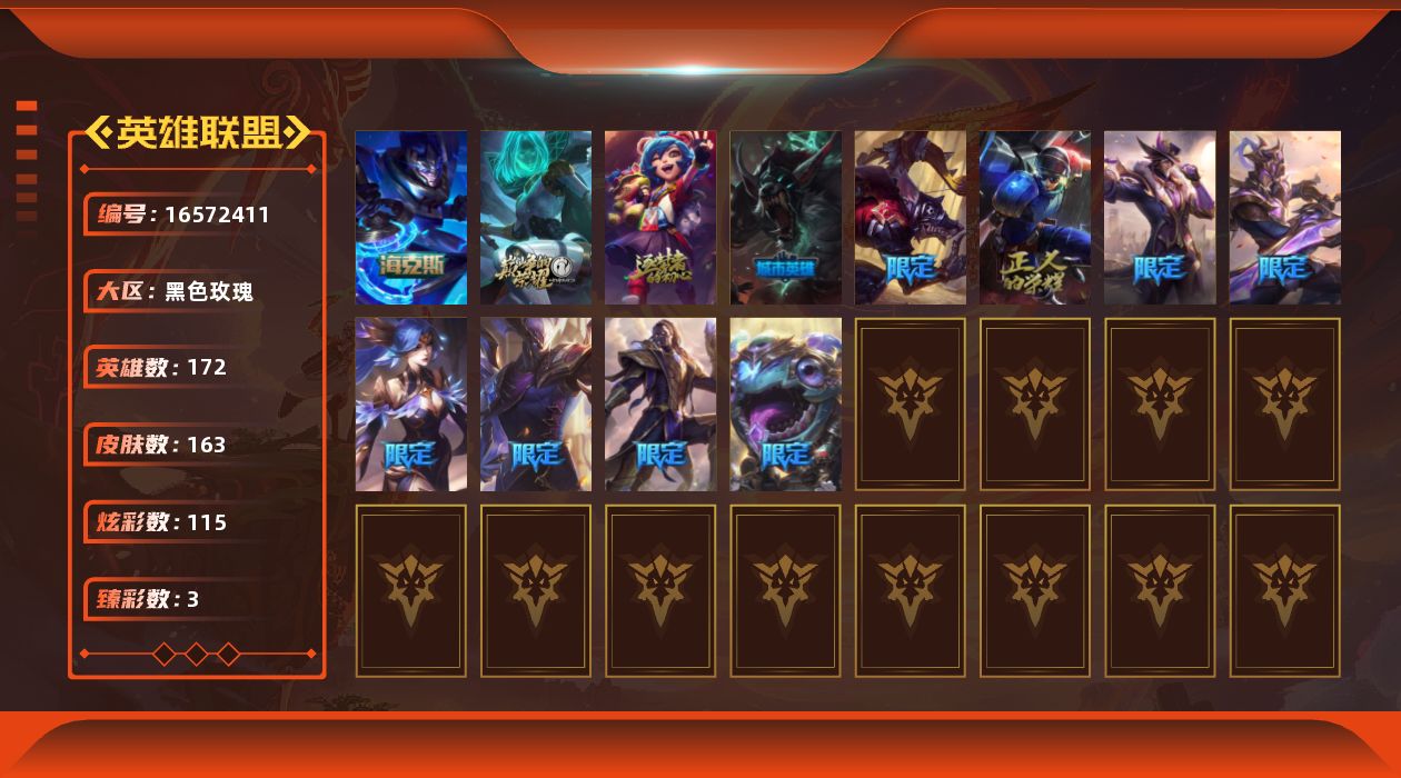 [16572411]未定级段位-172英雄-163皮肤-115炫彩-0终极-4神话-14限定-16传说-55史诗 【神话皮肤】:十周年纪念安妮,源代码乐芙兰,神凰行者瑞羽圣凰艾尼维亚,海克斯科技嘉文四世 【臻彩皮肤】:闭月之颜貂蝉炫金莲华,魔女阿卡丽虚荣,幽梦玫瑰伊莉丝浪漫花蕾 【海克斯皮肤】:海克斯科技嘉文四世 【冰雪限定】:冰雪节辛吉德 【限定皮肤】:暗裔英雄盖伦,胜利之剑亚托克斯,胜利呛神卢锡安,胜利巨口克格莫,胜利女神娑娜,胜利剑圣易,胜利之运崔斯特,胜利女神菲奥娜,暗影沃里克,勇者阿狸,都铎王朝图奇,防暴天使凯尔 【传说皮肤】:血石领主弗拉基米尔,驯龙炮手崔丝塔娜,女皇艾希,黯晶凤凰艾尼维亚,最终boss维迦,陆地王者4wd布里茨,上古战魂魔腾,源计划泯灭雷克顿,神拳李青,神龙尊者圣龙李青,宇航员诺提勒斯,泳池派对吉格斯,灌篮高手德莱厄斯,黑夜使者亚索,神龙尊者昼日真龙亚索,魔女娜美 【史诗皮肤】:冰霜烈焰安妮,屠龙勇士赵信,摄魂男爵弗拉基米尔,重生之沙费德提克,钢铁之心希维尔,源代码索拉卡,火箭达人崔丝塔娜,狼外婆沃里克,黑帮狂花厄运小姐,少林武僧贾克斯,炼金狂士辛吉德,飞越疯人院萨科,武动巅峰萨科,夜刃艾瑞莉娅,穿着正装的恶魔维迦,北领前线斯维因,抵抗军天使凯特琳,黑曜石守护者墨菲特,暗夜猫女卡特琳娜,源计划雄心卡特琳娜,符文战神雷克顿,凯旋英雄嘉文四世,至高之拳李青,地下拳王李青,屠龙勇士薇恩,法老王朝内瑟斯,军神战甲波比,刺客信条凯南,铁甲雄心盖伦,源计划山蕾欧娜,刺客信条锐雯,兔女郎锐雯,深海怪鱼克格莫,奥术光辉拉克丝,星际迷航拉克丝,黑帮教父格雷福斯,暗星韦鲁斯,奥术大师吉格斯,驯龙女巫璐璐,铁血帝皇德莱厄斯,生化骑士德莱厄斯,血羽凤凰奎因,野火之藤婕拉,邪恶魔人扎克,西部牛仔亚索,源计划风亚索,苍穹之光维克兹,银河魔装机神千珏,职业杀手卢锡安,冲击之刃劫,霓虹杀拳蔚,霸天剑魔亚托克斯,河水之灵娜美,星际之门阿兹尔,腥红之月锤石 【王者皮肤】:战地之王加里奥 【勇士皮肤】:拆弹专家黑默丁格 【典藏皮肤】:钢铁终结者赛恩 【其他皮肤1】:幽蓝梦魇加里奥,风执事加里奥,魔女乐芙兰,幻执事乐芙兰,弗拉基米尔伯爵,末世天使凯尔,灵能特工凯尔,黑暗骑士阿利斯塔,沙之守护瑞兹,光明骑士希维尔,蕉泥座人索拉卡,约德尔海贼团崔丝塔娜,极地女神艾希,黑暗女王伊芙琳,北风冻原图奇,