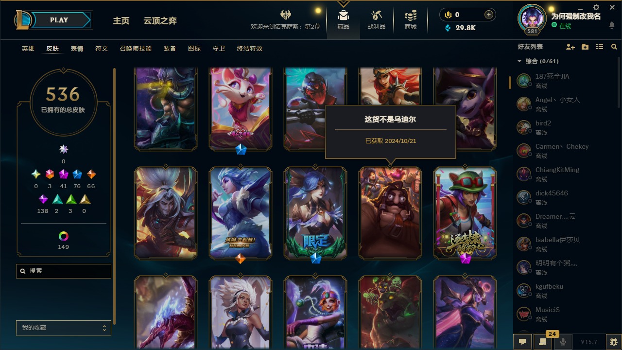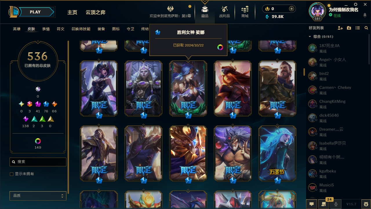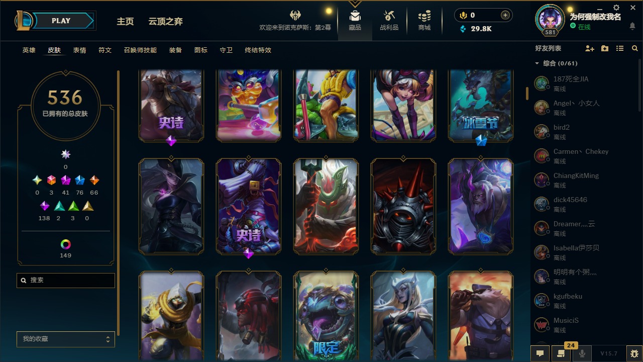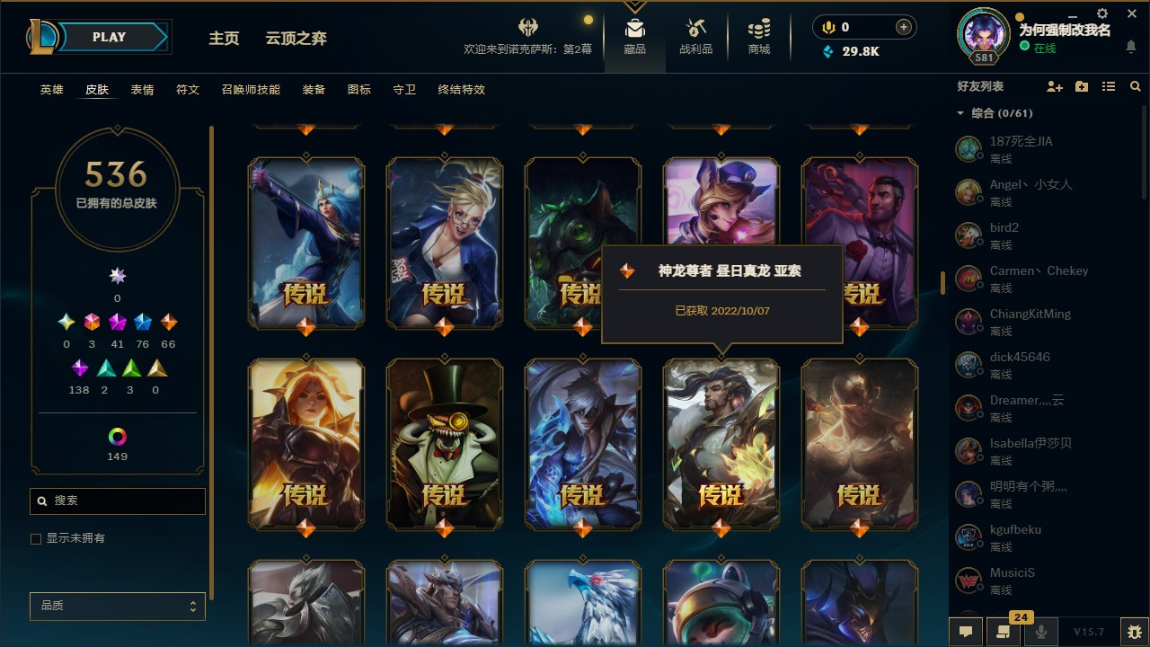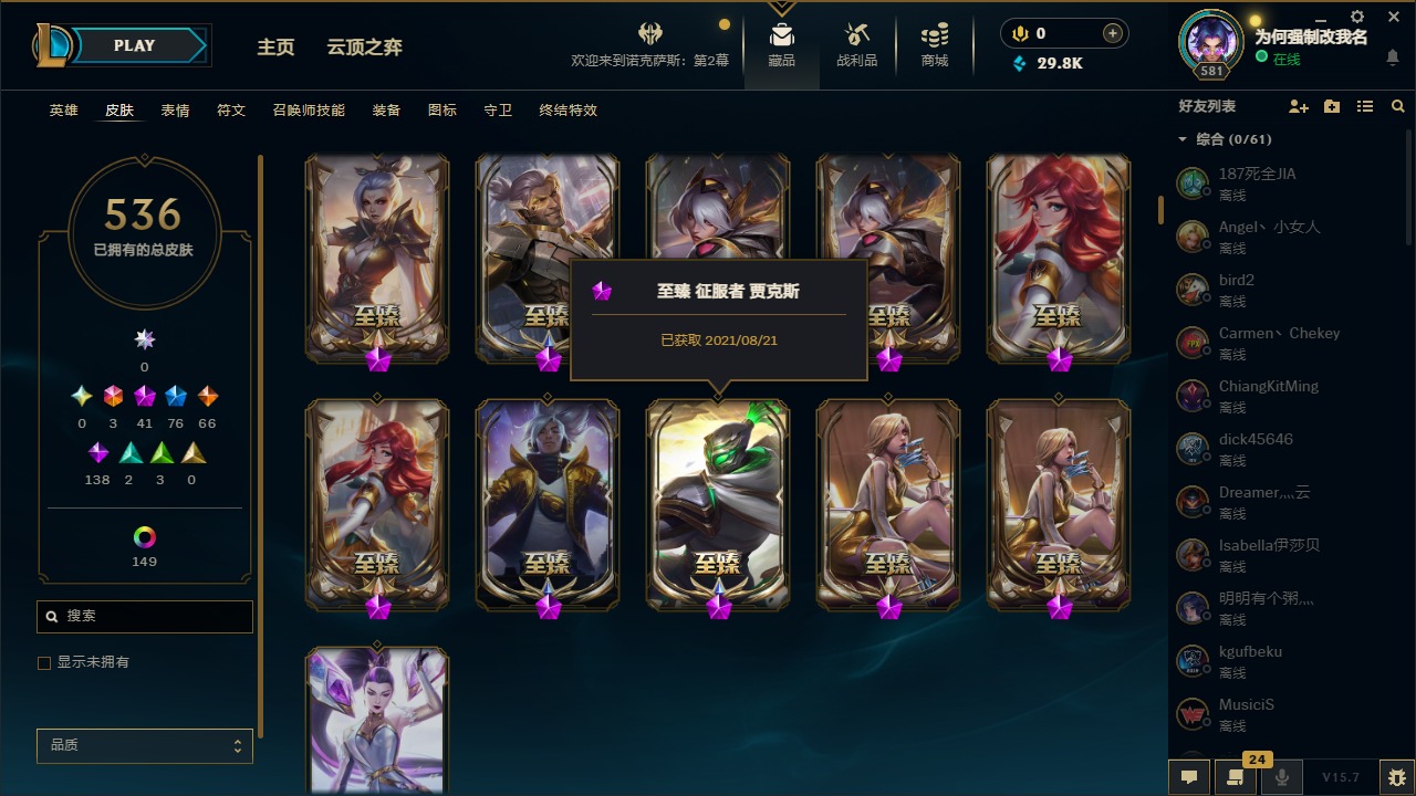 [7458927]3终极 41神话 3臻彩 75限定 66传说 138史诗 536皮肤 162炫彩 170英雄 黄金 皮肤:天龙之子 斯莫德斗魂觉醒 格温灵魂莲华 瑟提至臻 神龙尊者 炎龙瑟提黎明使者 永恩灰烬骑士 派克女帝 芮尔黑夜使者 厄斐琉斯至臻 源计划:逆流 塞拉斯太空律动 “创乐之神” 奥恩永恒之森 奥恩雷霆领主 奥恩甜心之羽 霞绝息圣堂 洛宇航员 巴德冰雪游神 巴德腥红之月 卡莉丝塔糖果之王 艾翁上古战魂 雷克塞抵抗军炎魔 俄洛伊虚空使者 俄洛伊破败解封 锤石暗星 锤石腥红之月 锤石灵能特工 莎弥拉觅心猫猫 悠米skt t1 阿兹尔星际之门 阿兹尔源代码 娜美河水之灵 娜美胜利之剑 亚托克斯腥红之月 亚托克斯霸天剑魔 亚托克斯仲裁圣骑 亚托克斯双城之战 蔚虎痴之拳 蔚铁拳执事 蔚女警官 蔚战场boss 奇亚娜源计划:自由 艾克任性学霸 艾克时之砂 艾克玉剑传说 无劫天煞 劫冠军之隐 劫源计划:阴 劫冲击之刃 劫胜利呛神 卢锡安至臻 未来战士 卢锡安西部魔影 卢锡安觅心游侠 卢锡安源计划:雷 卢锡安真实伤害 赛娜五星大厨 塔姆双城之战 金克丝源计划:疯狂 金克丝星之守护者 金克丝黑帮狂花 金克丝灵魂莲华 千珏暗星尊 烬源计划:升华 烬腥红之月 烬糖果大战 布隆布隆·狮心猛虎 布隆屠龙勇士 布隆荣誉使者 阿克尚ig 卡蜜尔魔女 卡蜜尔源代码 卡蜜尔弗雷尔卓德 塔莉垭苍穹之光 维克兹战地机甲 维克兹神龙尊者 昼日真龙 亚索至臻 真实伤害 亚索奥德赛 亚索黑夜使者 亚索源计划:风 亚索战地机甲 扎克泳池派对 扎克邪恶魔人 扎克宇航员 纳尔银河魔装机神 纳尔狂狮 纳尔萌侦探 喵尔摩斯星之守护者 卡莎至臻 k/da all out 卡莎ig 卡莎弹幕天使 卡莎鬼影森森 婕拉至臻 黑夜使者 凯隐摄魂猎手 凯隐亚特兰蒂斯 辛德拉仲裁圣女 辛德拉觅心之翼 奎因勇敢的心 奎因至臻 女帝 黛安娜黑潮 黛安娜腥红之月 黛安娜无限烈焰 黛安娜广寒仙子 嫦娥暗黑女武神 黛安娜暗星女王 丽桑卓源代码 丽桑卓