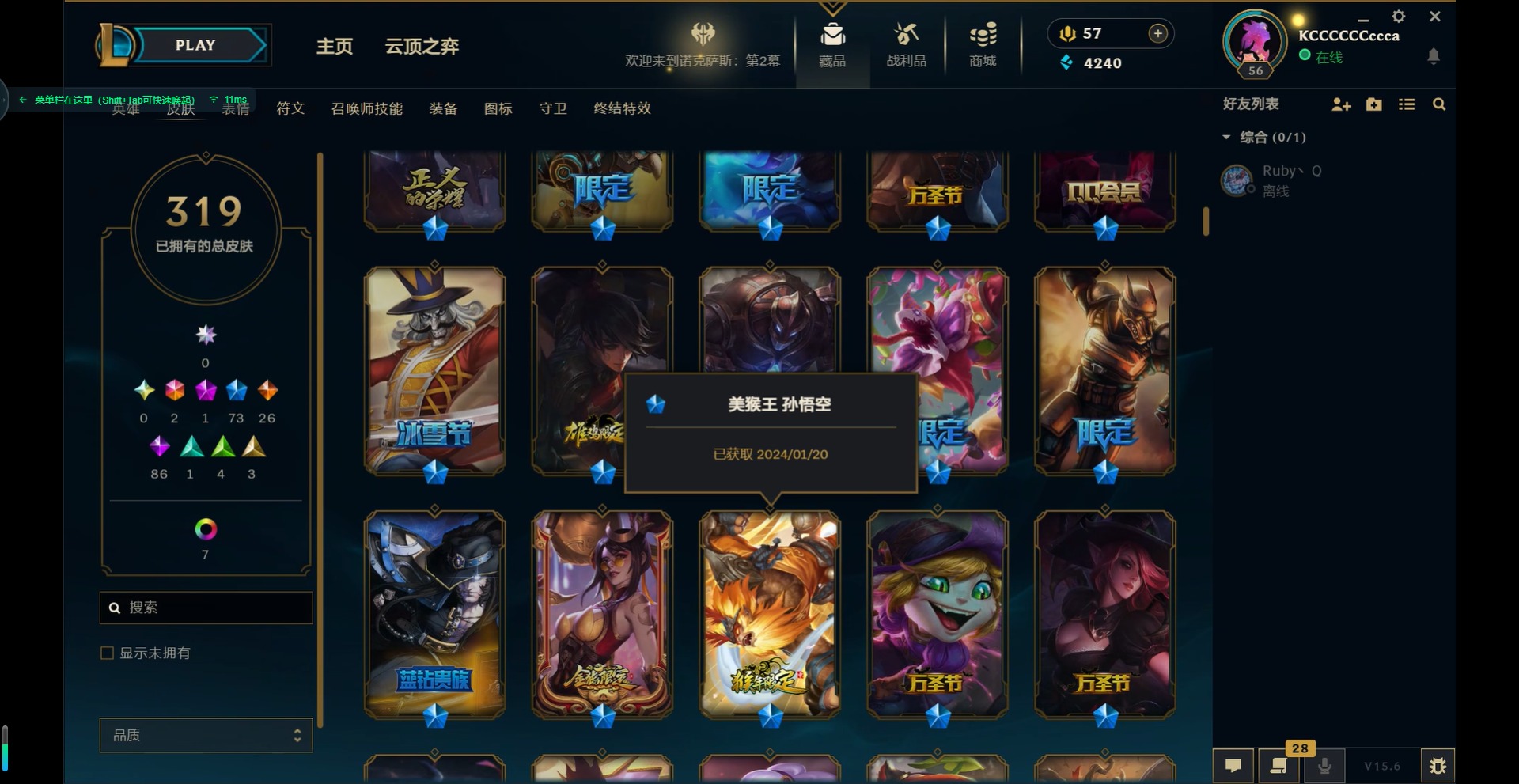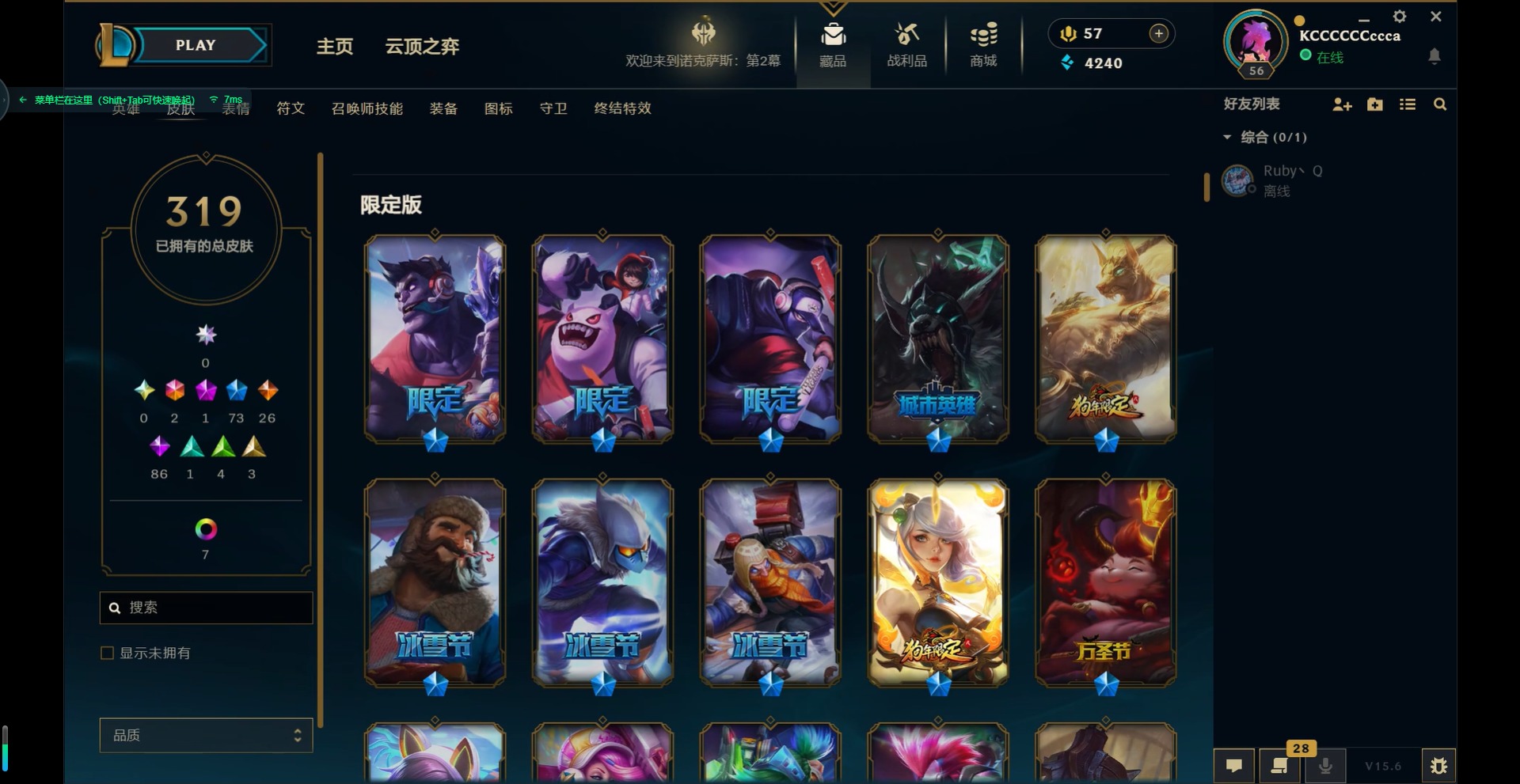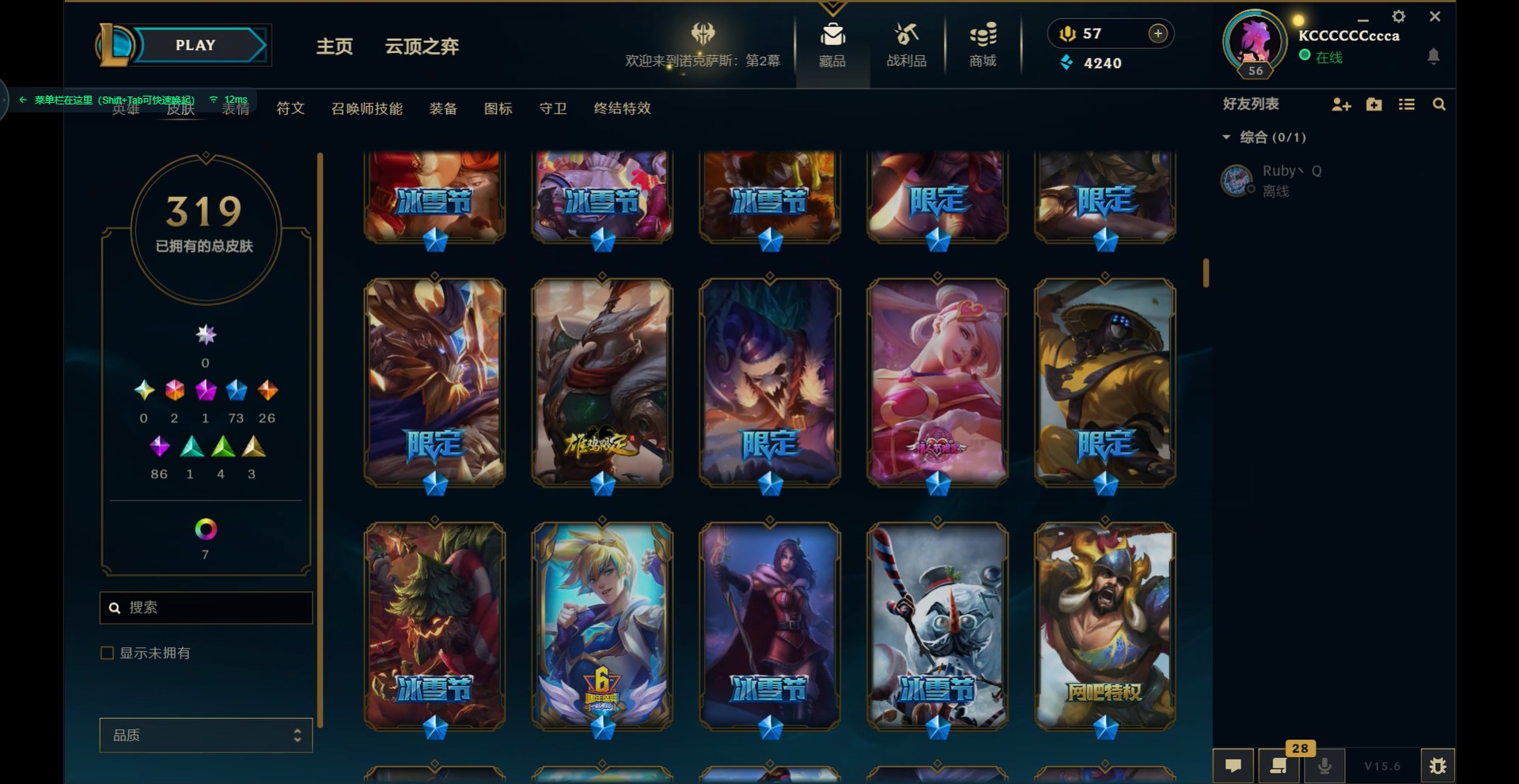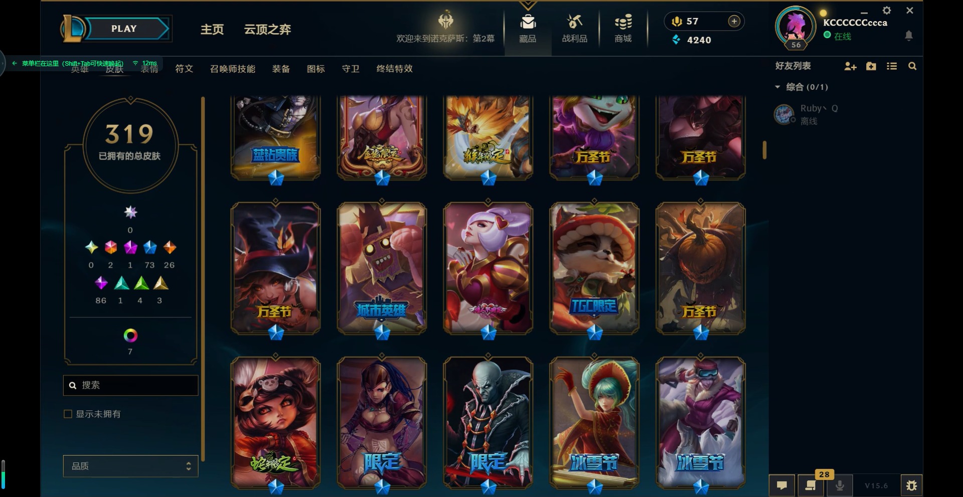 [7484553]2终极 1神话 1臻彩 73限定 26传说 86史诗 319皮肤 14炫彩 155英雄 皮肤:糖果之王 艾翁上古战魂 雷克塞虚空使者 俄洛伊冠军典狱长 锤石司马懿 仲达幽冥领主 阿兹尔锦鲤 娜美虎痴之拳 蔚炼狱魔女 蔚铁拳执事 蔚女警官 蔚任性学霸 艾克源计划:阴 劫源计划:雷 卢锡安海牛大大 塔姆五星大厨 塔姆星之守护者 金克丝丧尸杀手 金克丝神龙烈焰 金克丝腥红之月 烬西部牛仔 烬猛虎 布隆屠龙勇士 布隆苍穹之光 维克兹腥红之月 亚索源计划:风 亚索最后一只恐龙 纳尔鬼影森森 婕拉野火之藤 婕拉亚特兰蒂斯 辛德拉血羽凤凰 奎因暗黑女武神 黛安娜血石妖后 丽桑卓铁血帝皇 德莱厄斯死亡绽放 卡兹克电玩战魂 赫卡里姆血石骑士 赫卡里姆德莱德莱德莱文金牌主播 德莱文灵魂收割者 德莱文星之守护者 璐璐邪恶女巫 璐璐糖果女巫 璐璐少校 吉格斯科学狂人 吉格斯源计划:火 菲奥娜女校长 菲奥娜魄罗骑士 瑟庄妮造物主 维克托光明骑士 诺提勒斯夜魔水晶 韦鲁斯坚韧不屈 沃利贝尔怒熊 沃利贝尔警长 沃利贝尔北地风暴 沃利贝尔苔原猎手 菲兹失落大陆 菲兹胜利呛神 格雷福斯冰雪节 格雷福斯无情重炮 格雷福斯电玩女神 阿狸偶像歌手 阿狸冰霜亚龙 希瓦娜钢之逆鳞 希瓦娜枯萎之壤 泽拉斯战地法师 泽拉斯春晖神女 拉克丝大元素使 拉克丝星之守护者 拉克丝odst地狱伞兵 拉克丝暗杀星 慎腥红之月 鬼武者 慎主治医师 慎炎爆 慎极寒 慎深海怪鱼 克格莫圣诞驯鹿 克格莫帝王斑蝶 克格莫索诺拉沙虫 克格莫毛毛虫 克格莫电玩勇者 锐雯ssw 泰隆