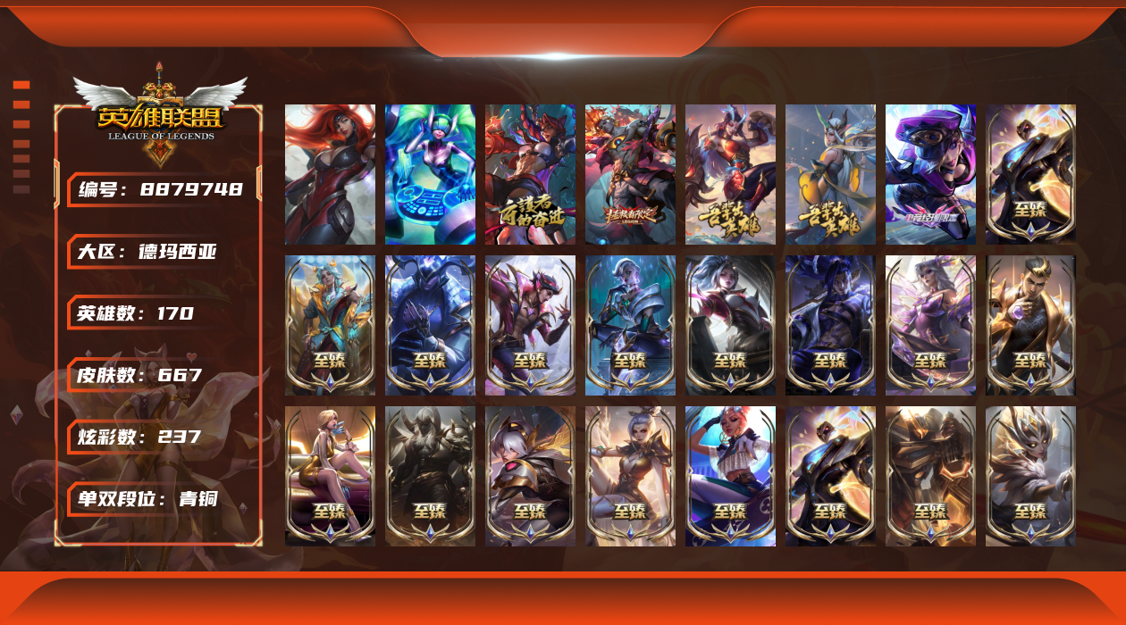 [8879748]【保证金商户】【编号74249】667皮肤 28至臻 8海克斯 3终极46神话80限定68传说135史诗 170英雄 斗魂觉醒莎弥拉 武装战姬厄运小姐 dj娑娜 殿堂传奇乐芙兰 海克斯科技波比 海克斯科技崔丝塔娜 海克斯科技吉格斯 海克斯科技嘉文四世 海克斯科技雷克顿 灰烬骑士派克 灰烬守护者 慎 恐惧新星 德莱厄斯 黎明使者卡尔玛 零之呛骑赫卡里姆 摄魂使者薇恩 十五周年纪念希维尔 水晶圣骑 艾希 水晶圣骑蕾欧娜 至臻北极星钢影卡蜜尔 至臻 北极星使者沃里克 至臻 花仙使者卡特琳娜 至臻 绝息圣堂 厄运小姐 至臻 灵魂莲华拉克丝 至臻灵魂莲华易 至臻 灵能特工伊泽瑞尔 至臻 魔女阿卡丽 至臻 魔女 婕拉 至臻 墨之影武者亚索 至臻 女帝 黛安娜 至臻 青花瓷 丽桑卓 至臻 神凰行者 烈羽焰凰霞 至臻 神龙尊者 比翼之龙 洛 至臻 天龙之子伊泽瑞尔 至臻 王国机神玄武 盖伦 至臻 未来战士 锤石 至臻 星之守护者辛德拉