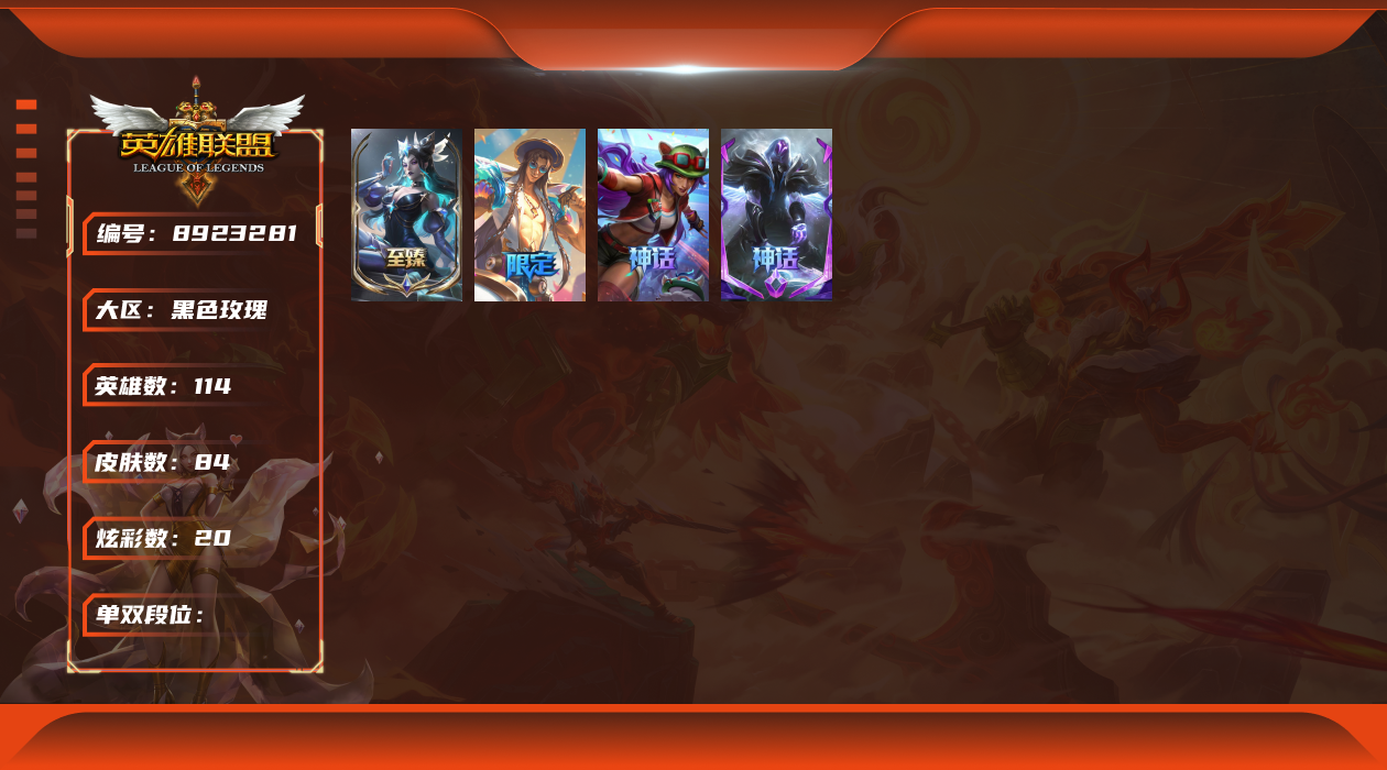 [8923281]a5925/可二次/黑色玫瑰【114英雄/84皮肤/20炫彩】十五周年纪念 希维尔 灰烬骑士 派克 至臻 k/da 卡莎 至臻 星之守护者 辛德拉 海之歌 永恩 冠军之矛 卡莉丝塔 碎心之拳 蔚 意乱情迷 蔚 克烈古拉伯爵 skt t1 艾克 魅惑女巫 崔丝塔娜 大魔王 提莫 斗魂觉醒 佛耶戈 drx 千珏 魅惑女巫 乐芙兰 北极星神 黛安娜 泳池派对 格雷福斯 勇者 阿狸 魅惑女巫 波比 dwg 奈德丽 海之歌 奈德丽 魅惑女巫 卡西奥佩娅 美猴王 孙悟空 泳池派对 奥莉安娜 神龙尊者 夜月幻龙 亚索 天煞 劫 灵魂莲华 锤石 驯龙炮手 崔丝塔娜 电玩女神 娑娜 花仙女王 卡尔玛 西部天使 艾希 绝息圣堂 锐雯 耀星女神 拉克丝 详情看图