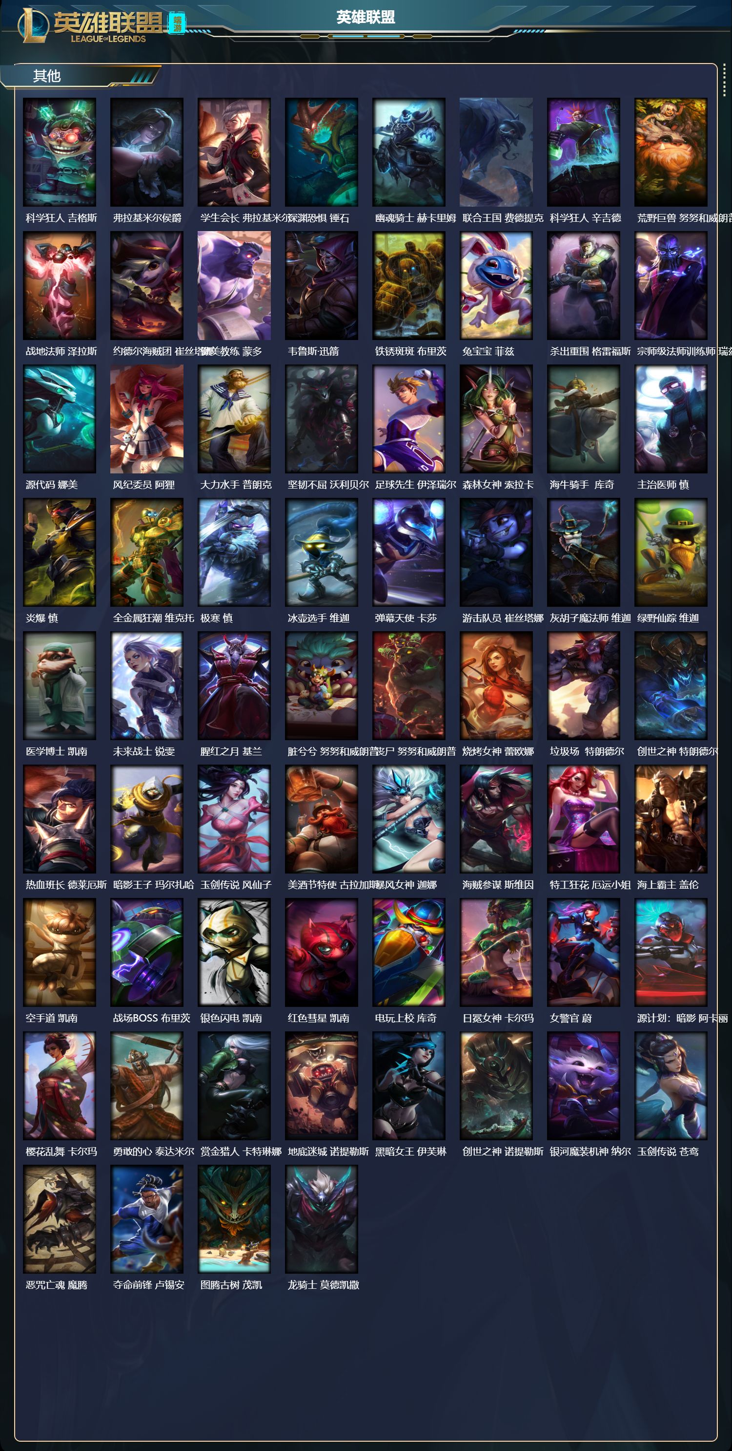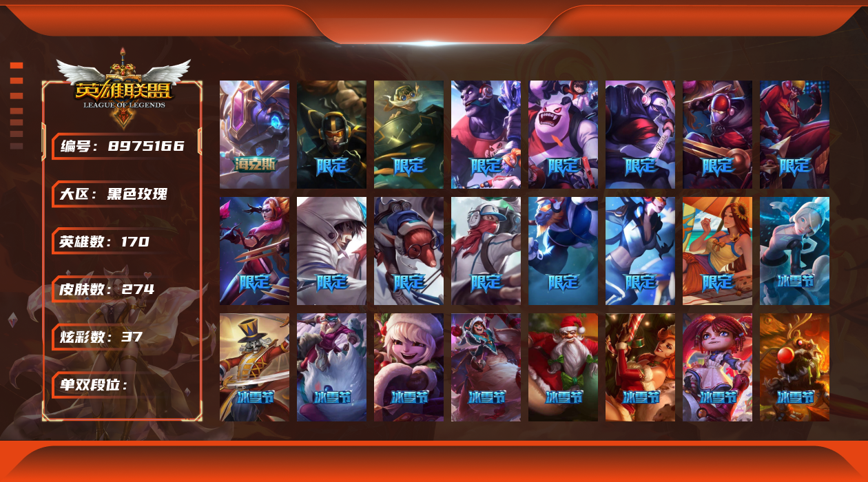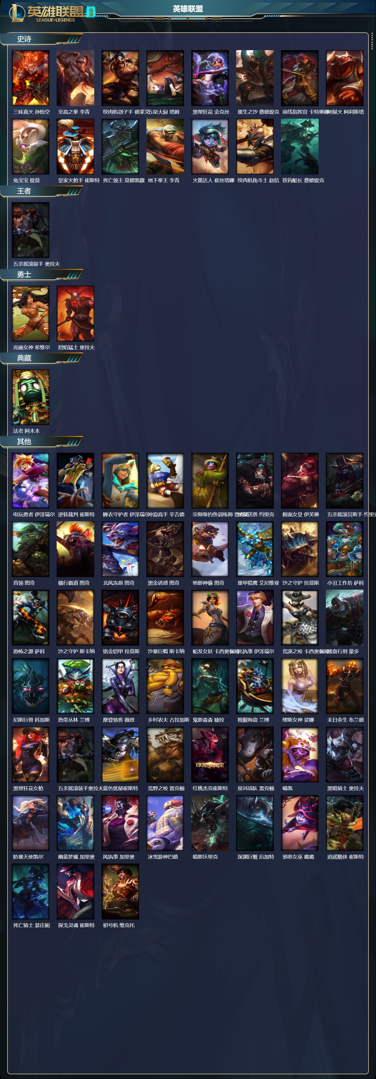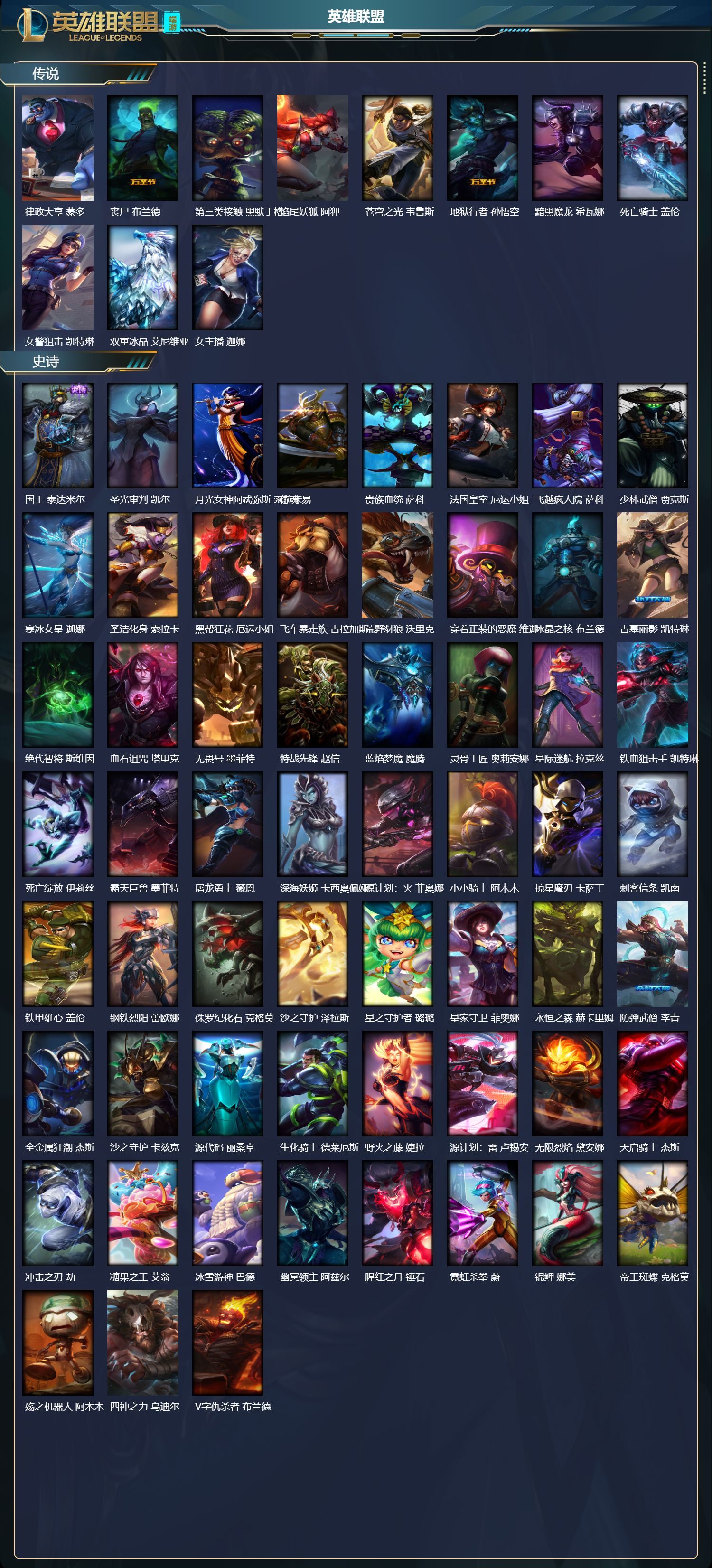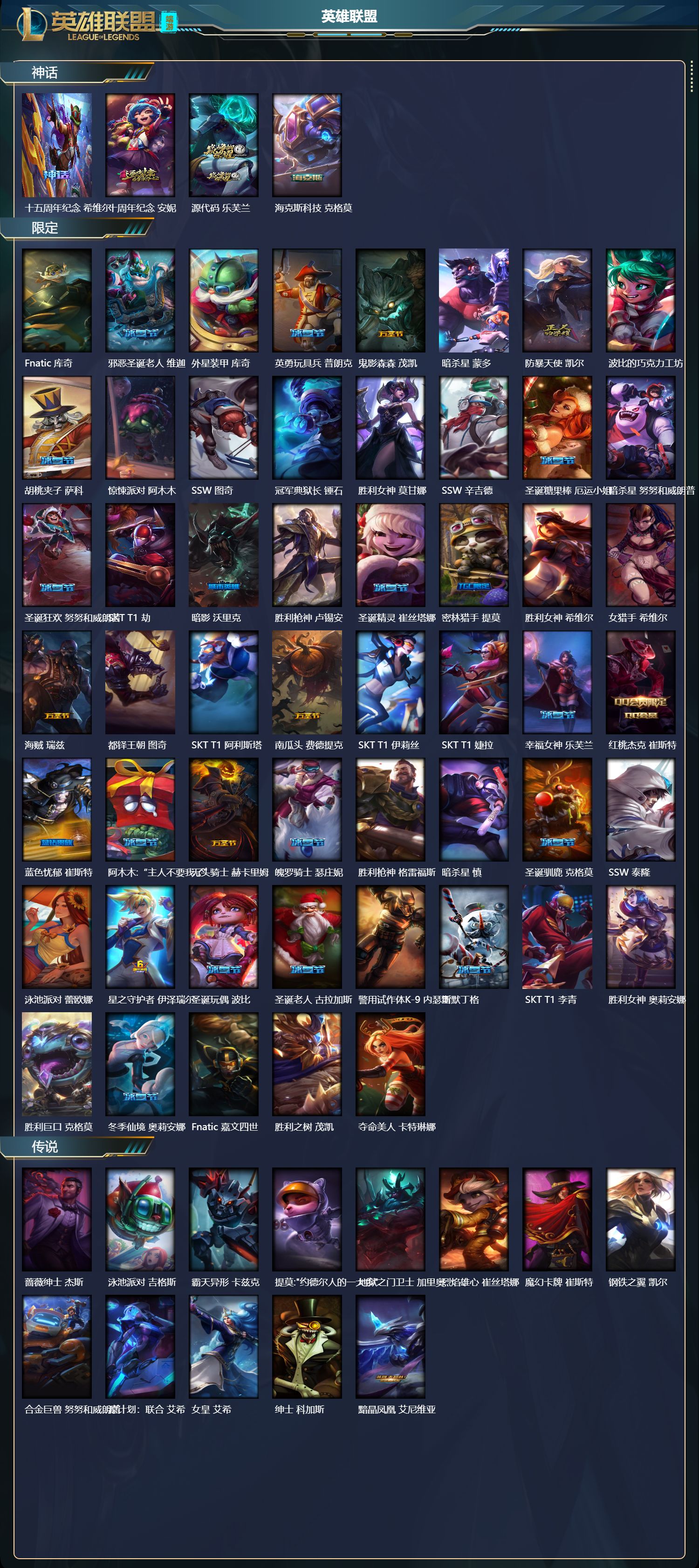[8975166]170英雄-274皮肤-37炫彩-段位:黄金 十五周年纪念 希维尔 十周年纪念 安妮 源代码 乐芙兰 海克斯科技 克格莫 fnatic 库奇 邪恶圣诞老人 维迦 外星装甲 库奇 英勇玩具兵 普朗克 鬼影森森 茂凯 暗杀星 蒙多 防暴天使 凯尔 波比的巧克力工坊 胡桃夹子 萨科 惊悚派对 阿木木 ssw 图奇 冠军典狱长 锤石 胜利女神 莫甘娜 ssw 辛吉德 圣诞糖果棒 厄运小姐 暗杀星 努努和威朗普 圣诞狂欢 努努和威朗普 skt t1 劫 暗影 沃里克 胜利呛神 卢锡安 圣诞精灵 崔丝塔娜 密林猎手 提莫 胜利女神 希维尔 女猎手 希维尔 海贼 瑞兹 都铎王朝 图奇 skt t1 阿利斯塔 南瓜头 费德提克 skt t1 伊莉丝 skt t1 婕拉 幸福女神 乐芙兰 红桃杰克 崔斯特 蓝色忧郁 崔斯特 阿木木:“主人不要我了” 无头骑士 赫卡里姆 魄罗骑士 瑟庄妮 胜利呛神 格雷福斯 暗杀星 慎 圣诞驯鹿 克格莫 ssw 泰隆 泳池派对 蕾欧娜 星之守护者 伊泽瑞尔 圣诞玩偶 波比 圣诞老人 古拉加斯 警用试作体k-9 内瑟斯 雪默丁格 skt t1 李青 胜利女神 奥莉安娜 胜利巨口 克格莫 冬季仙境 奥莉安娜 fnatic 嘉文四世 胜利之树 茂凯 夺命美人 卡特琳娜 蔷薇绅士 杰斯 泳池派对 吉格斯 霸天异形 卡兹克 提莫:"约德尔人的一大步" 地狱之门卫士 加里奥 烈焰雄心 崔丝塔娜 魔幻卡牌 崔斯特 钢铁之翼 凯尔 合金巨兽 努努和威朗普 源计划:联合 艾希 女皇 艾希 绅士 科加斯 黯晶凤凰 艾尼维亚 律政大亨 蒙多 丧尸 布兰德 第三类接触 黑默丁格 焰尾妖狐 阿狸 苍穹之光 韦鲁斯 地狱行者 孙悟空 黯黑魔龙 希瓦娜 死亡骑士 盖伦 女警狙击 凯特琳 双重冰晶 艾尼维亚 女主播 迦娜 国王 泰达米尔 圣光审判 凯尔 月光女神阿忒弥斯 索拉卡 侍魂 易 贵族血统 萨科 法国皇室 厄运小姐 飞越疯人院 萨科 少林武僧 贾克斯 寒冰女皇 迦娜 圣洁化身 索拉卡 黑帮狂花 厄运小姐 飞车暴走族 古拉加斯 荒野豺狼 沃里克 穿着正装的恶魔