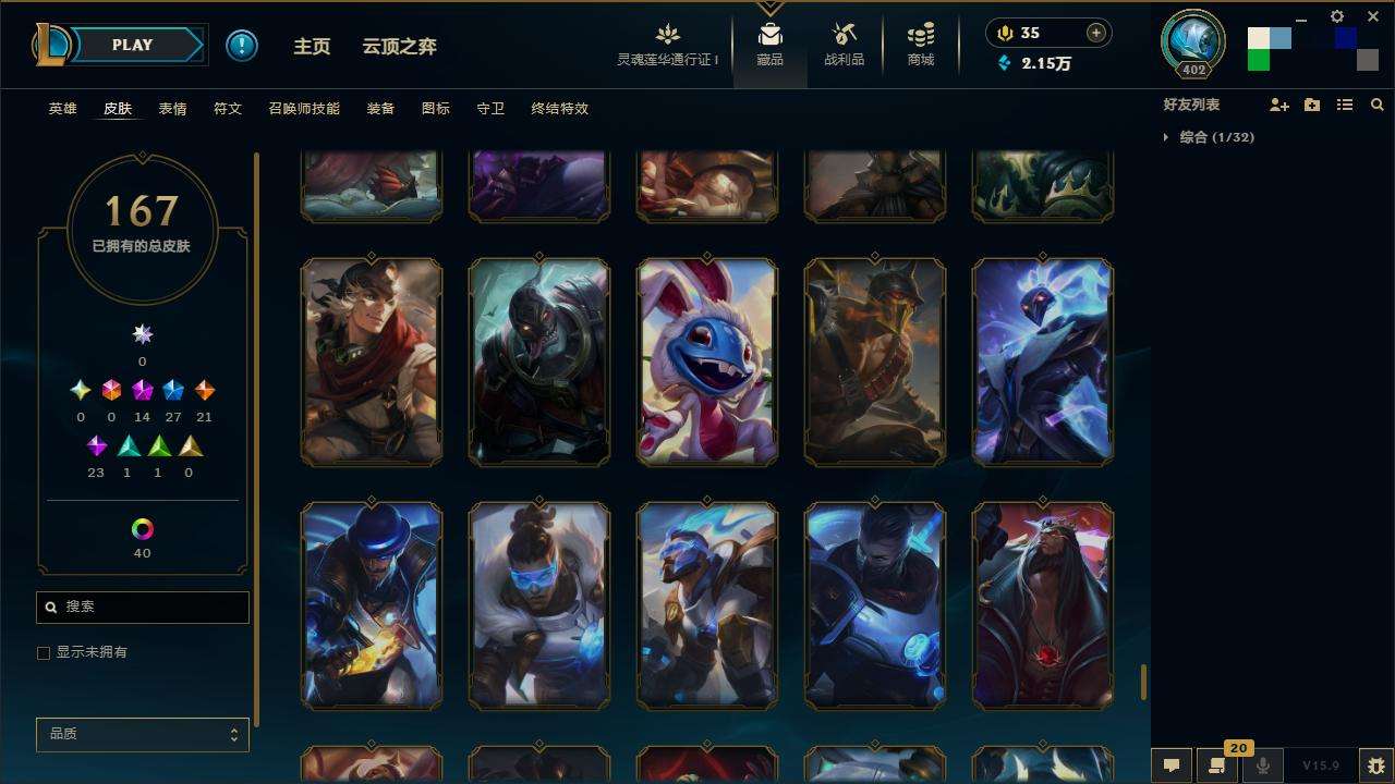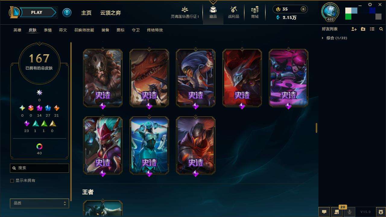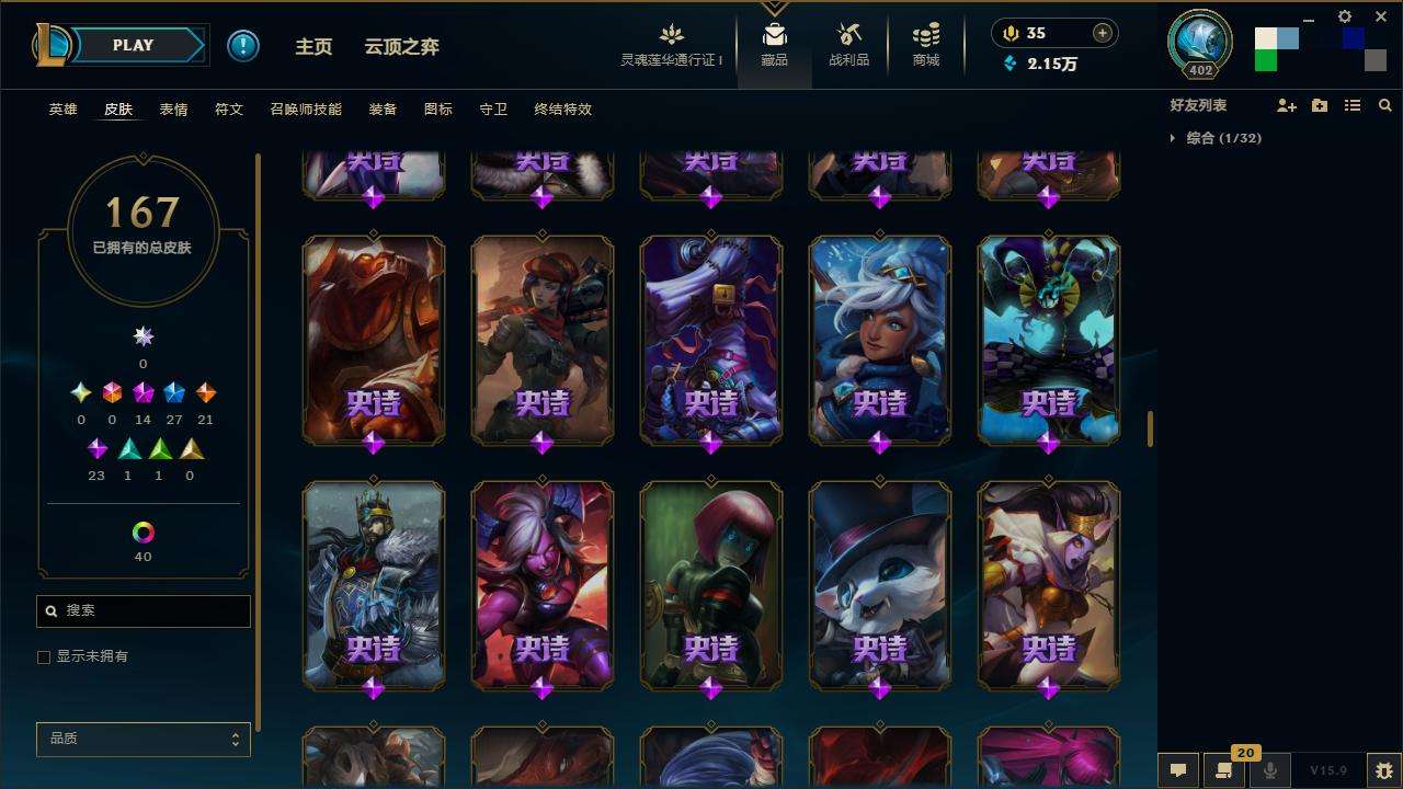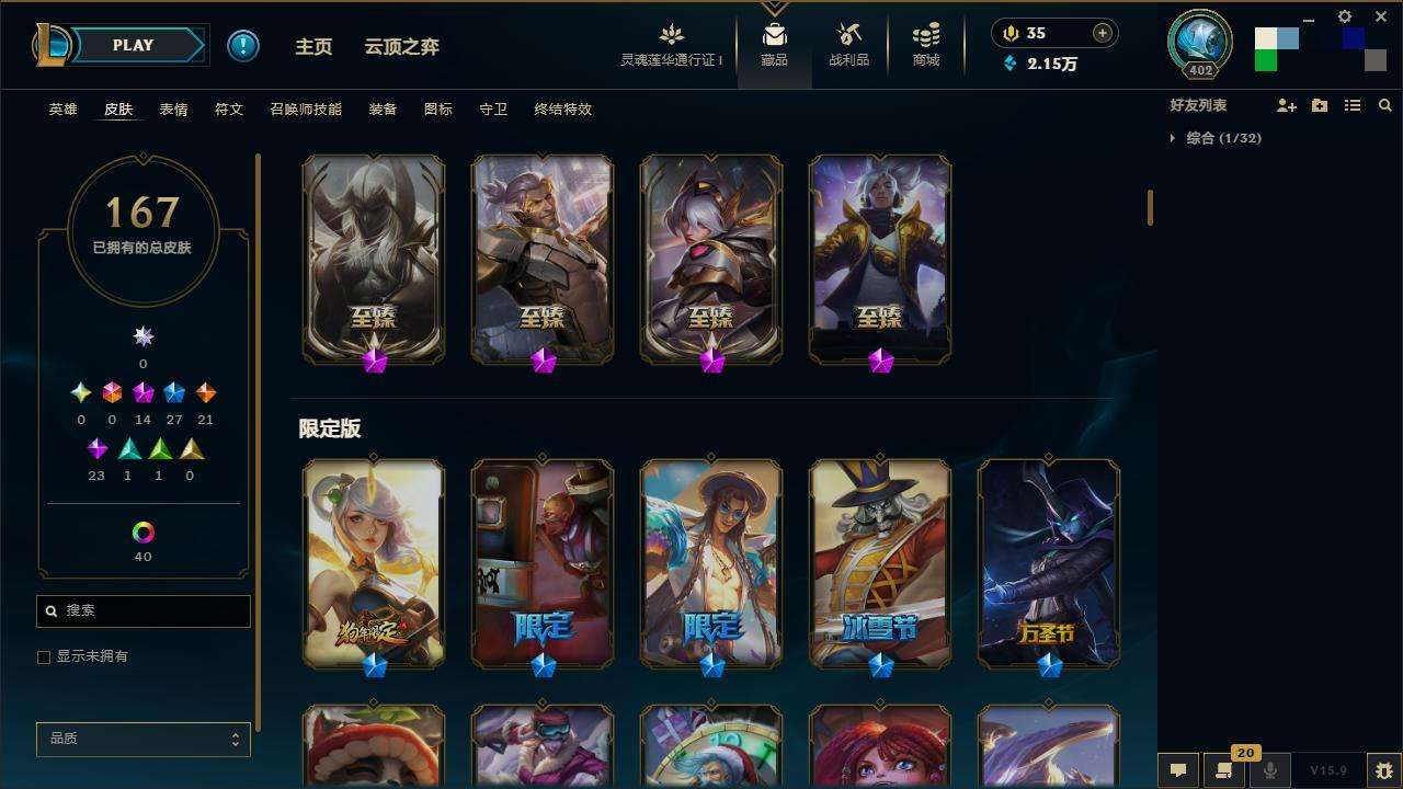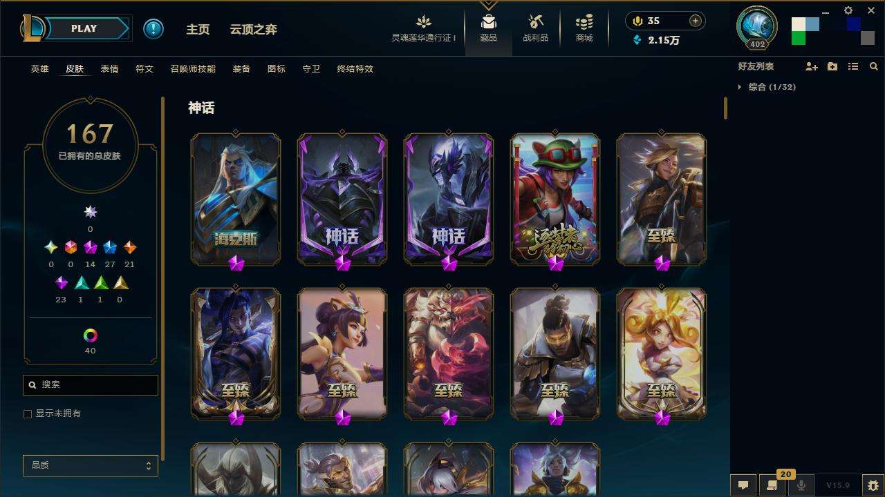 167皮肤-10至臻-4臻彩-1海克斯-14神话-27限定-21传说-143英雄-段位:白银 至臻