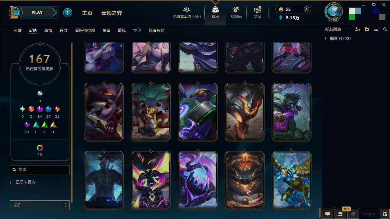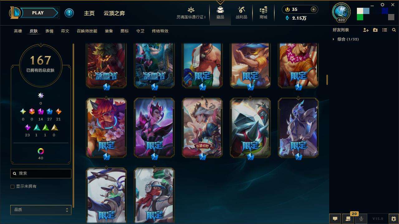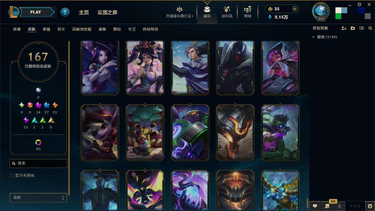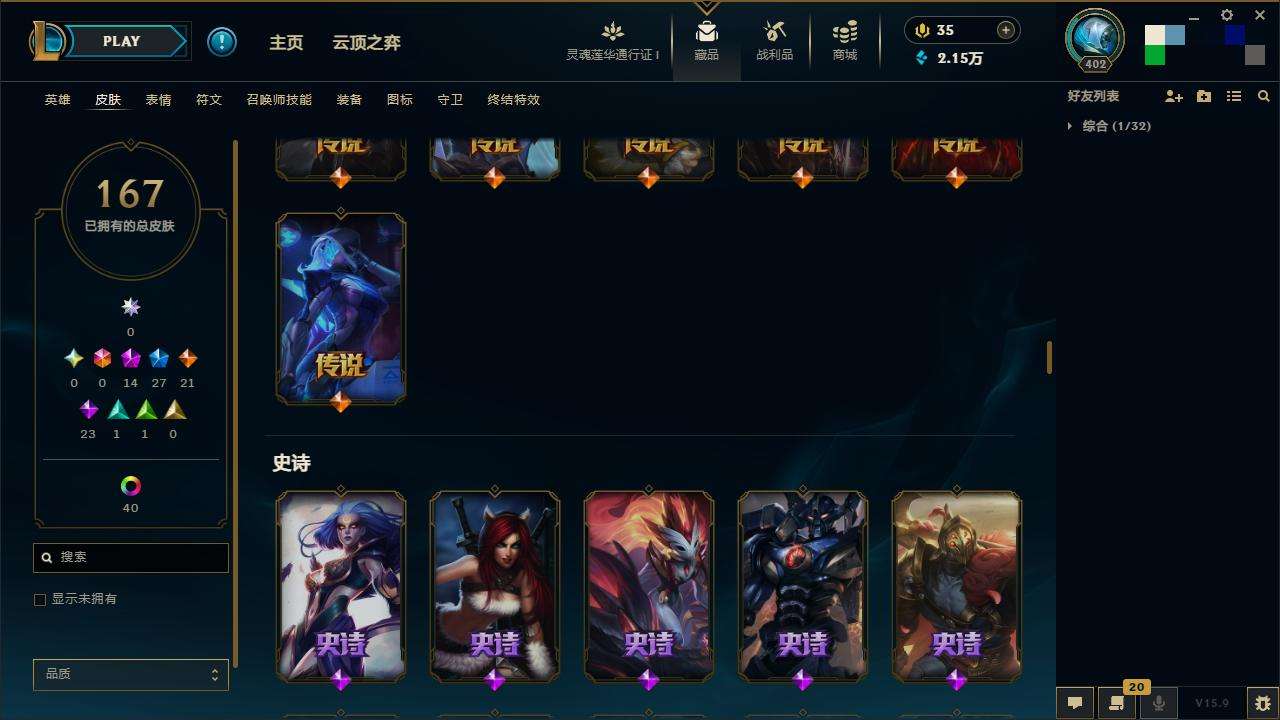 167皮肤-10至臻-4臻彩-1海克斯-14神话-27限定-21传说-143英雄-段位:白银 至臻