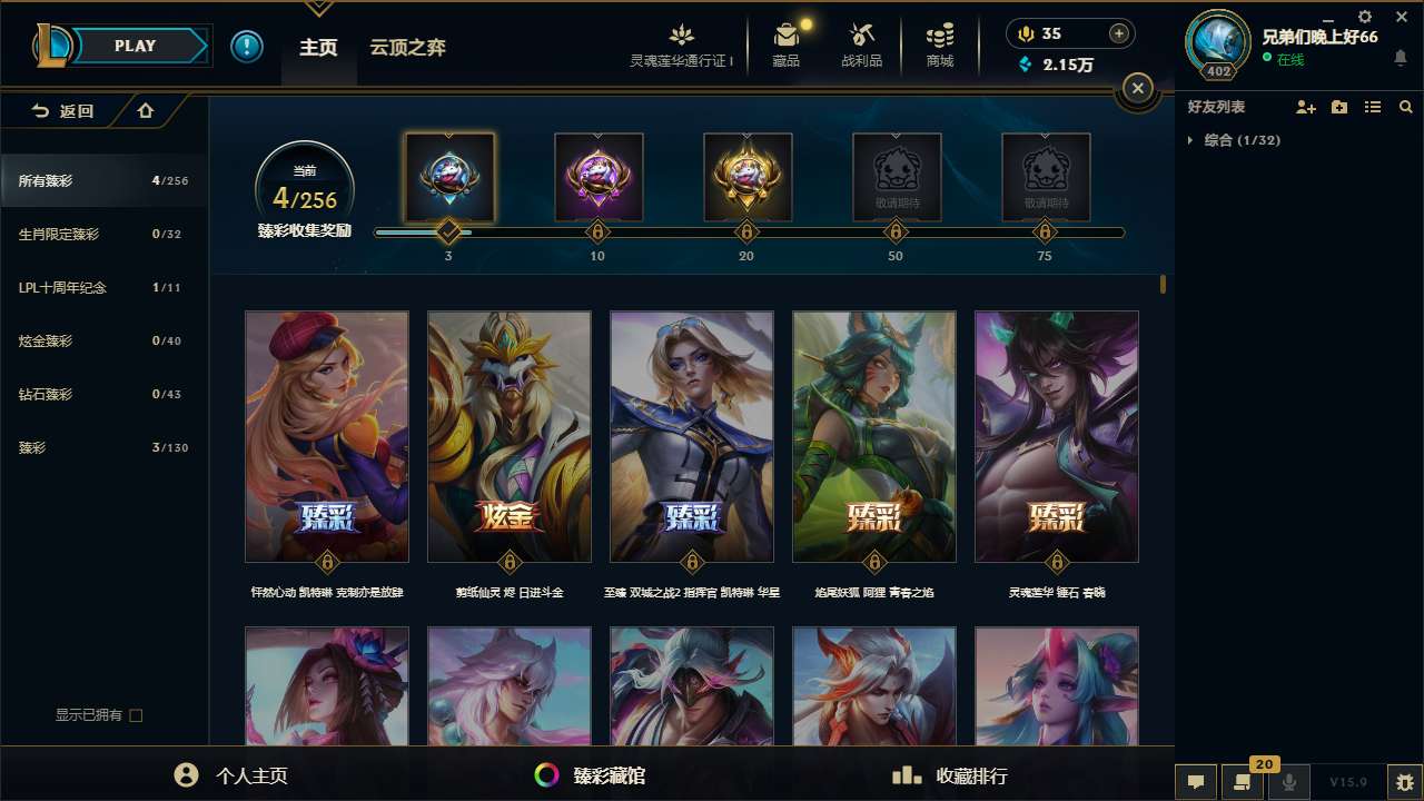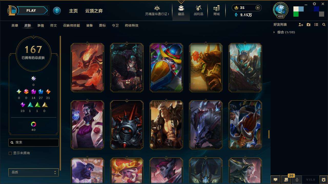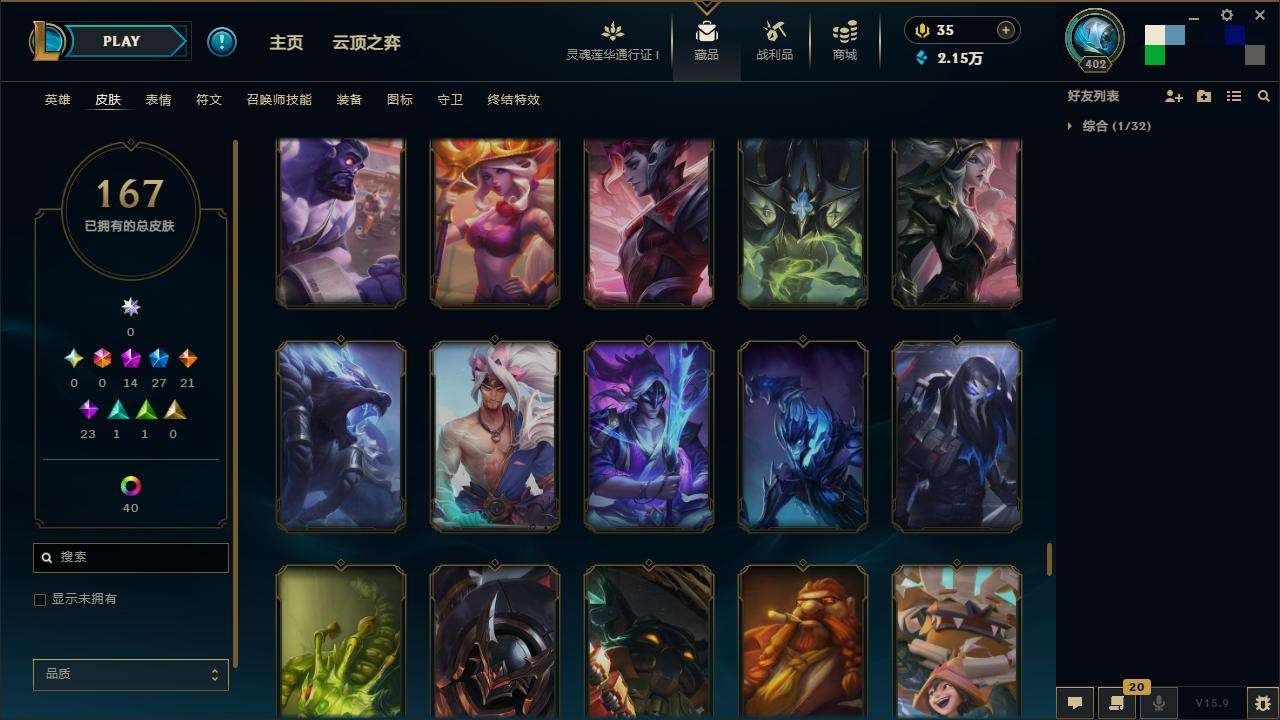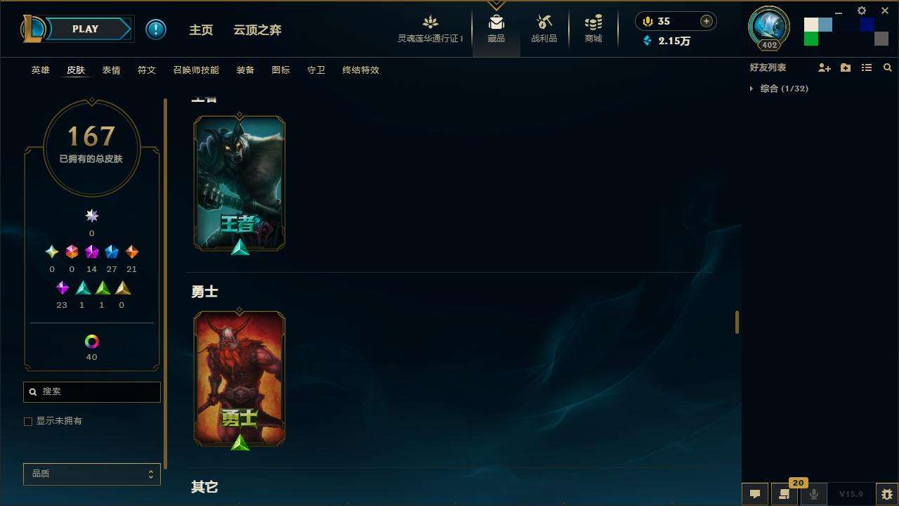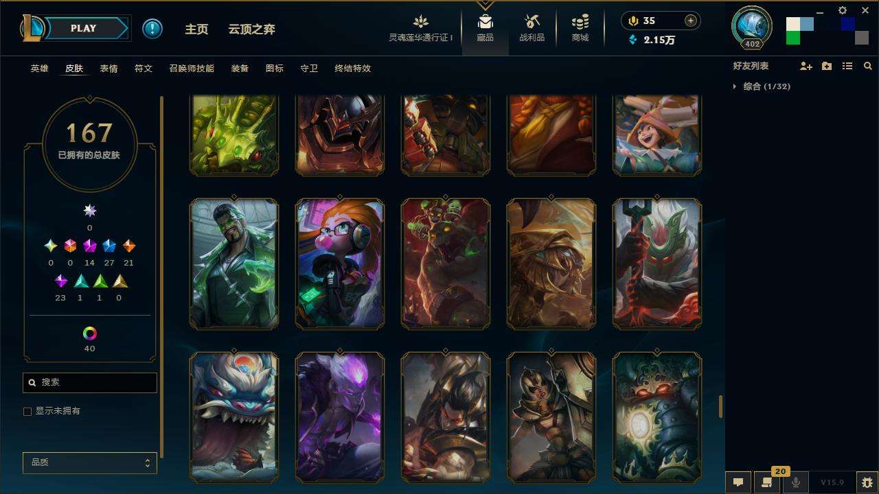 167皮肤-10至臻-4臻彩-1海克斯-14神话-27限定-21传说-143英雄-段位:白银 至臻