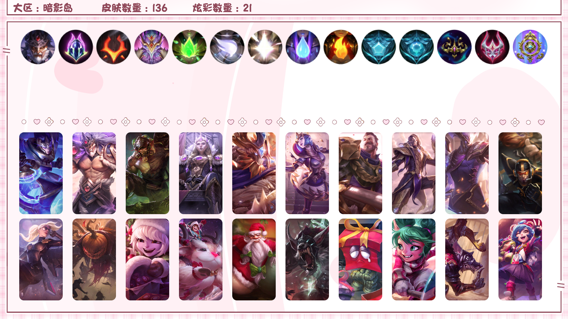 [9480895]【云顶账号】136皮肤 21炫彩 2神话/21限定/19传说/162英雄 账号等级:602 单双排段位:不屈白银