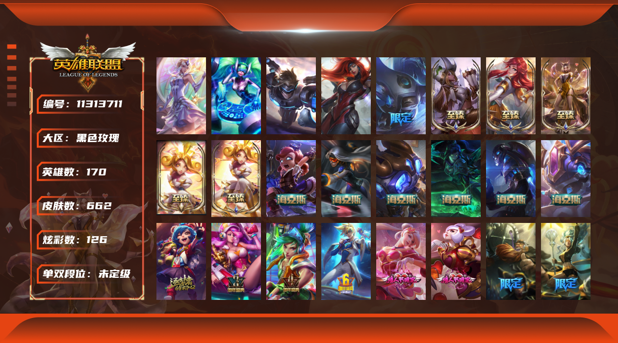 [11313711]【编号12115】【商品标题】:未定级段位-170英雄-662皮肤-126炫彩-4终极-13神话-100限定-69传说-187史诗 【珍稀头像】:至爱的鹿头像 【热门头像】:银河魔装机神安妮头像,春晖神女头像,勇者阿狸头像,战斗学院拉克丝头像,玉剑传说寒潭夭夭头像,玉剑传说苍鸾头像 【至臻皮肤】:至臻魅惑女巫厄运小姐,至臻战斗学院拉克丝,至臻kda阿狸,至臻星之守护者妮蔻 【臻彩皮肤】:春晖神女拉克丝流风回雪,冠军之箭艾希凯旋圣装,征服者韦鲁斯炫金,闭月之颜貂蝉炫金莲华,弹幕天使卡莎炽天使勇敢,弹幕天使卡莎炽天使公正,可爱可爱粉红红布里茨 【年限皮肤】:龙的传人李青,银龙裁决泰隆,紫金罗刹莫甘娜,虎痴之拳蔚,南天之怒沃里克,北辰之威内瑟斯,春晖神女拉克丝 【海克斯皮肤】:海克斯科技安妮,新创战纪希维尔,海克斯科技阿木木,摄魂使者薇恩,海克斯科技玛尔扎哈,海克斯科技克格莫 【情人节限定】:甜心宝贝娑娜,觅心之翼奎因,觅心女王艾希,觅心魔灵奥莉安娜 【冰雪限定】:幸福女神乐芙兰,冰雪风暴希维尔,冬境仙灵索拉卡,圣诞开心鬼提莫,圣诞精灵崔丝塔娜,圣诞狂欢基兰,阿木木“主人不要我了”,胡桃夹子萨科,平安夜女神娑娜,英勇玩具兵普朗克,冬季仙境卡尔玛,邪恶圣诞老人维迦,喜庆之树茂凯,雪默丁格,圣诞玩偶波比,冰雪驯鹿波比,圣诞老人古拉加斯,魄罗骑士瑟庄妮,雪球也能爆炸吉格斯,圣诞老人德莱文,圣诞捣蛋鬼金克丝,冰雪节辛吉德,冰雪兽纳尔 【终极皮肤】:大元素使拉克丝,dj娑娜,未来战士伊泽瑞尔,武装战姬厄运小姐 【神话皮肤】:十周年纪念安妮,源代码乐芙兰,神凰行者瑞羽圣凰艾尼维亚,海克斯科技阿木木,海克斯科技安妮,海克斯科技克格莫,海克斯科技玛尔扎哈,摄魂使者薇恩,新创战纪希维尔,至臻kda阿狸,至臻魅惑女巫厄运小姐,至臻星之守护者妮蔻,至臻战斗学院拉克丝 【限定皮肤】:卧虎藏龙贾克斯,创星之灵璐璐,地底世界崔斯特,冠军典狱长锤石,冠军之血希瓦娜,冠军之箭艾希,fnatic古拉加斯,fnatic迦娜,fnatic嘉文四世,fnatic卡尔萨斯,fnatic库奇,暗杀星奥莉安娜,暗杀星蒙多,暗杀星努努和威朗普,sktt1贾克斯,sktt1婕拉,sktt1薇恩,ssw辛吉德,ssw图奇,ssw雷恩加尔,sktt1雷克顿,sktt1娜美,ig菲奥娜,ig艾瑞莉娅,ig卡蜜尔,ig卡莎,i