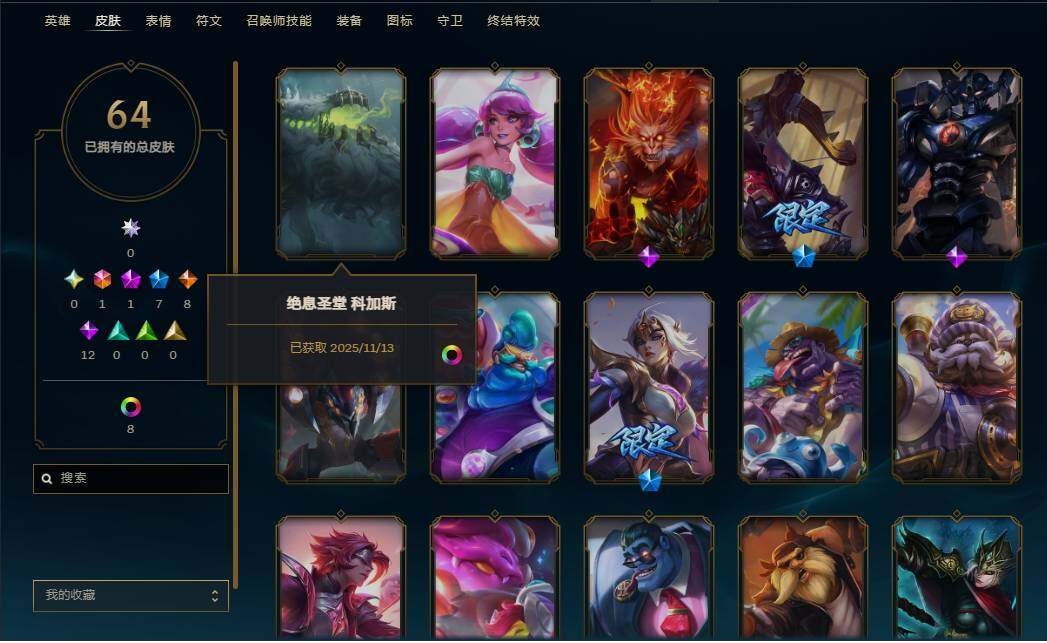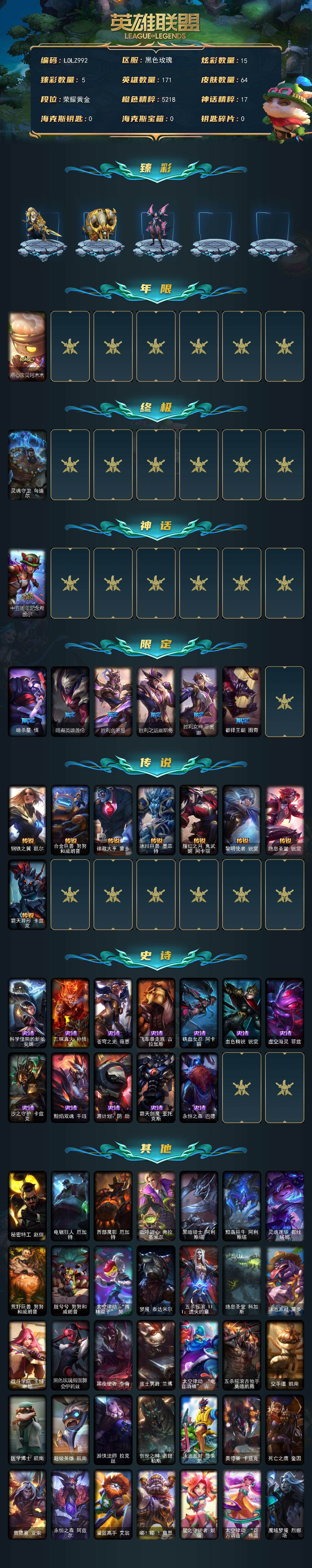 【lolz992】171英雄/64皮肤/1终极/1神话/7限定/5臻彩/15炫彩/8传说/12史诗/黄金/赵云子龙炫金将军/征服者阿利斯塔炫金/弹幕天使卡莎炽天使勇敢/预知之眼亚索不怠/黑夜使者嘉文四世白夜/点心宝贝阿木木/灵魂守卫乌迪尔/十五周年纪念希维尔/暗杀星慎/暗裔英雄盖伦/胜利剑圣易/胜利之运崔斯特/胜利女神菲奥娜/都铎王朝图奇/钢铁之翼凯尔/合金巨兽努努和威朗普/律政大亨蒙多/冰川巨兽墨菲特/腥红之月鬼武姬阿卡丽/黎明使者锐雯/绝息圣堂锐雯/霸天异形卡兹克/科学怪熊的新娘安妮/三昧真火孙悟空/苍穹之光薇恩/飞车暴走族古拉加斯/铁血女忍阿卡丽/血色精锐锐雯/虚空海灵菲兹/沙之守护卡兹克/黯焰双魂千珏/源计划阴劫/霸天剑魔亚托克斯/永恒之森巴德/秘密特工赵信/电锯狂人厄加特/西部魔影厄加特/咖啡甜心弗拉基米尔/黑暗骑士阿利斯塔/黯晶巨牛阿利斯塔/灵魂莲华崔丝塔娜/荒野巨兽努努和威朗普/脏兮兮努努和威朗普/太空律动舞林双子努努和威朗普/梦魇泰达米尔/五杀摇滚iii遗失的章节卡尔萨斯/绝息圣堂科加斯/泳池派对蒙多/战斗学院卡特琳娜/黑色玫瑰假面舞会伊莉丝/黑夜使者李青/废土男爵兰博/太空律动电音酒桶古拉加斯/五杀摇滚吉他手莫德凯撒/空手道凯南/医学博士凯南/超级英雄凯南/游侠法师拉克丝/创世之神诺提勒斯/泳池派对德莱文/奥德赛卡兹克/死亡之鹰奎因/奥德赛亚索/永恒之森阿兹尔/灌篮高手艾翁/嘟嘟奥恩/星之守护者妮蔻/太空律动百万调音格温/魔域梦魇烈娜塔