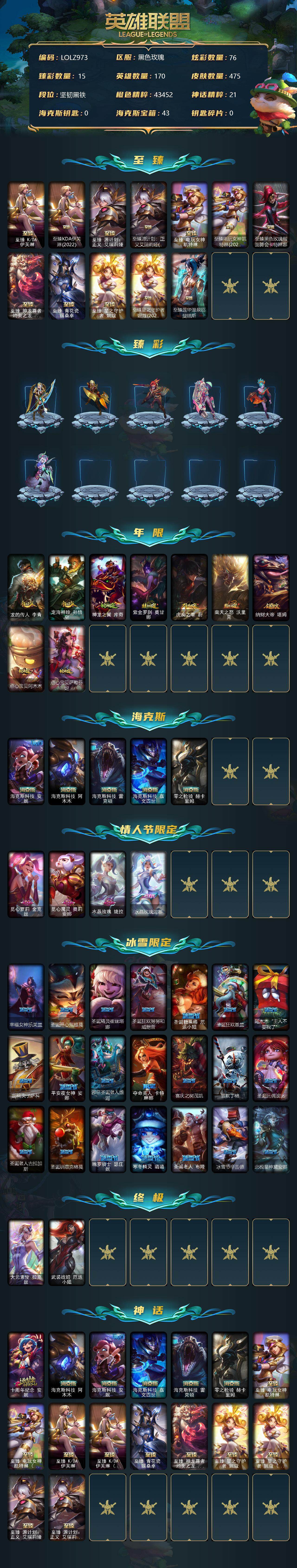 【lolz973】170英雄/475皮肤/2终极/18神话/81限定/15臻彩/76炫彩/50传说/105史诗/未定级/至臻 k/da伊芙琳/至臻 k/da 伊芙琳 2022/至臻 源计划:正义 艾瑞莉娅/至臻 源计划:正义 艾瑞莉娅 2022/至臻 电玩女神 凯特琳/至臻电玩女神凯特琳 2022/至臻 黑色玫瑰假面舞会 卡特琳娜/至臻神龙尊者均衡之龙 沃利贝尔/至臻 青花瓷 丽桑