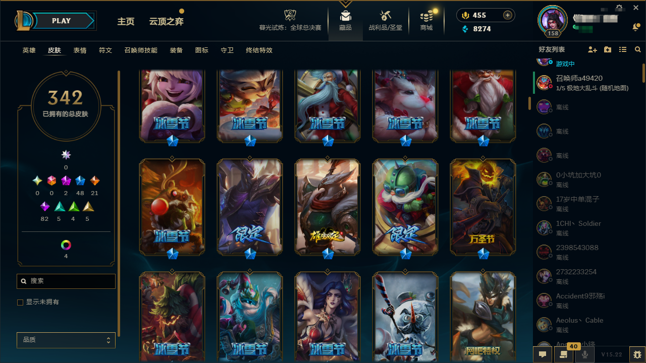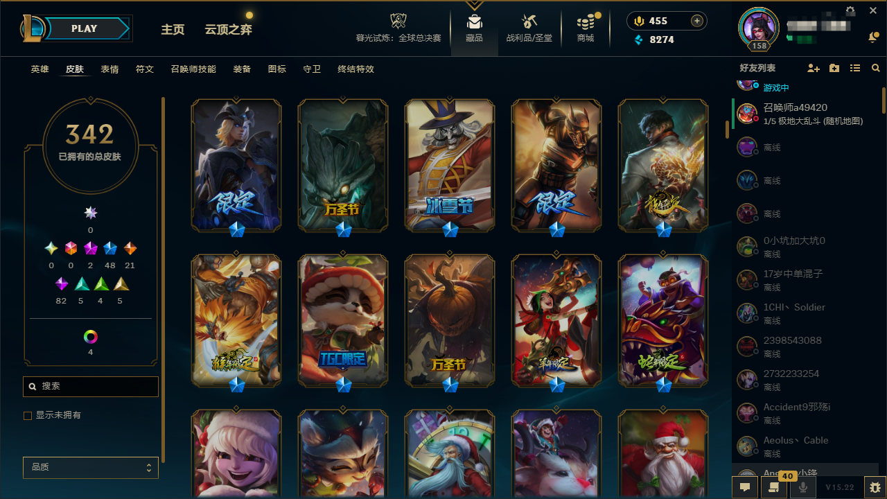 【网通无畏先锋 段位未定级 英雄129 皮肤342 炫彩数量4 神话2 限定48 传说21】 防暴机器人布里茨 防暴士兵炼金 都铎王朝老鼠 冠军之血希瓦娜 警用试作体k-9内瑟斯 波比的巧克力工坊 野兽猎人瑟庄妮 泳池派对菲奥娜 外星装甲库奇 密林猎手提莫 龙年盲僧 龙年琴女 蛇年库奇 羊年金克丝 猴年美猴王孙悟空 鸡年司马懿仲达阿兹尔 10周年安妮 3周年女呛 4周年锐雯 五