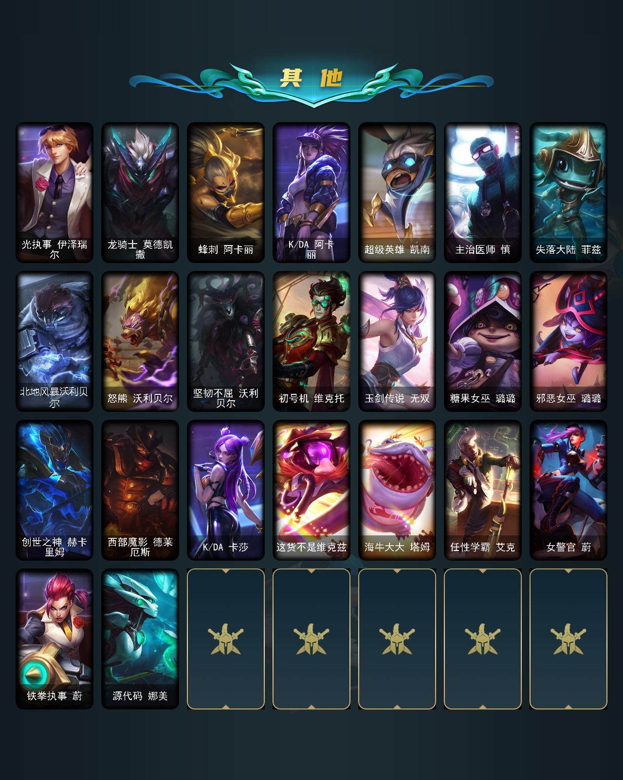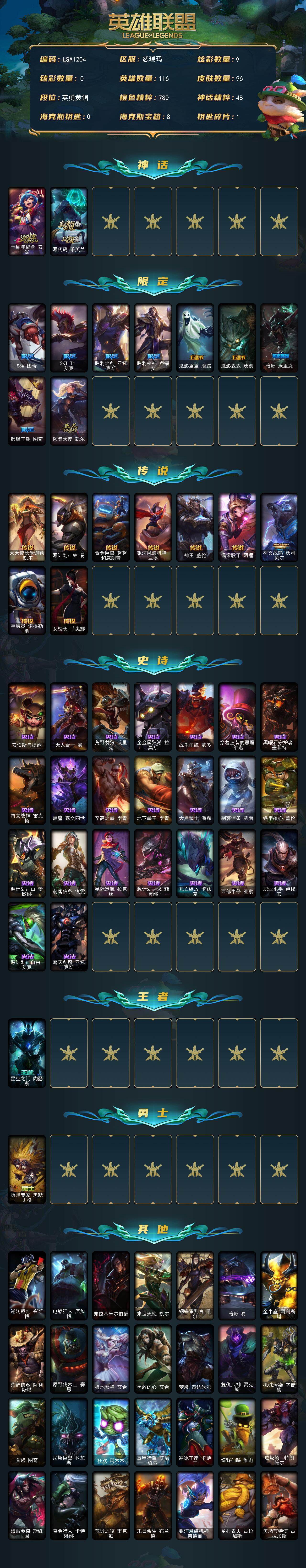【lsa1204】116英雄/96皮肤/2神话/9限定/9炫彩/9传说/23史诗/青铜账号等级:261/十周年纪念安妮/源代码乐芙兰/ssw图奇/sktt1艾克/胜利之剑亚托克斯/胜利呛神卢锡安/鬼影重重魔腾/鬼影森森茂凯/暗影沃里克/都铎王朝图奇/防暴天使凯尔/大天使长米迦勒凯尔/源计划林易/合金巨兽努努和威朗普/银河魔装机神兰博/神王盖伦/偶像歌手阿狸/符文战熊沃利贝尔/宇航员诺提勒斯/女校长菲奥娜/安伯斯与提妮/天人合一易/荒野豺狼沃里克/全金属狂潮拉莫斯/战争血统蒙多/穿着正装的恶魔维迦/黑曜石守护者墨菲特/符文战神雷克顿/暗星嘉文四世/至高之拳李青/地下拳王李青/大夏武士潘森/刺客信条凯南/铁甲雄心盖伦/源计划山蕾欧娜/刺客信条锐雯/星际迷航拉克丝/源计划火菲奥娜/死亡绽放卡兹克/西部牛仔亚索/职业杀手卢锡安/源计划自由艾克/霸天剑魔亚托克斯/星空之门内瑟斯/拆弹专家黑默丁格/逆转裁判崔斯特/电锯狂人厄加特/弗拉基米尔伯爵/末世天使凯尔/钢铁审判官凯尔/暗影易/金牛座阿利斯塔/荒野镖客阿利斯塔/原野伐木工赛恩/极地女神艾希/勇敢的心艾希/梦魇泰达米尔/复仇武神贾克斯/机械污染辛吉德/首领图奇/尼斯巨兽科加斯/狂欢阿木木/重甲猎鹰艾尼维亚/寒冰王座卡萨丁/绿野仙踪维迦/垃圾场特朗德尔/海贼参谋斯维因/赏金猎人卡特琳娜/荒野之咬雷克顿/末日余生布兰德/银河魔装机神奈德丽/乡村农夫古拉加斯/美酒节特使古拉加斯/光执事伊泽瑞尔/龙骑士莫德凯撒/蜂刺阿卡丽/kda阿卡丽/超级英雄凯南/主治医师慎/失落大陆菲兹/北地风暴沃利贝尔/怒熊沃利贝尔/坚韧不屈沃利贝尔/初号机维克托/玉剑传说无双/糖果女巫璐璐/邪恶女巫璐璐/创世之神赫卡里姆/西部魔影德莱厄斯/kda卡莎/这货不是维克兹/海牛大大塔姆/任性学霸艾克/女警官蔚/铁拳执事蔚/源代码娜美
