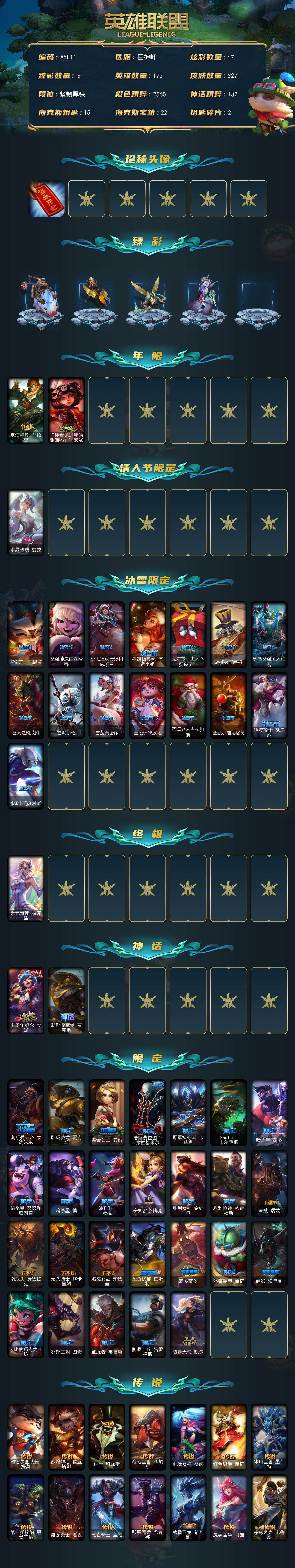 【店主推荐捡漏号!可直接换绑】黑铁段位-172英雄-327皮肤-17炫彩-1终极-2神话-44限定-16传说-72史诗 【珍稀头像】:红包头像 【臻彩皮肤】:天龙之子卡莎飞龙乘云,无畏骑士瑟庄妮赤子初心,征服者韦鲁斯炫金,冠军掠夺者卡兹克凯旋圣装,魔女阿卡丽虚荣,净雪之月莫甘娜冬虹 【年限皮肤】:定海神珍孙悟空,你看见过我的熊猫吗安妮 【情人节限定】:水晶玫瑰婕拉 【冰雪限定】:圣诞开心鬼提莫,圣诞精灵崔丝塔娜,圣诞狂欢努努和威朗普,圣诞糖果棒厄运小姐,阿木木“主人不要我了”,胡桃夹子萨科,邪恶圣诞老人维迦,喜庆之树茂凯,雪默丁格,雪装奈德丽,圣诞玩偶波比,圣诞老人古拉加斯,圣诞驯鹿克格莫,魄罗骑士瑟庄妮,冰雪节玛尔扎哈 【终极皮肤】:大元素使拉克丝 【神话皮肤】:十周年纪念安妮,新卧虎藏龙贾克斯 【限定皮肤】:奥斯曼大帝泰达米尔,卧虎藏龙贾克斯,舞会公主安妮,诺斯费拉图弗拉基米尔,冠军掠夺者卡兹克,fnatic卡尔萨斯,暗杀星蒙多,暗杀星努努和威朗普,暗杀星慎,sktt1婕拉,安妮梦游仙境,胜利女神希维尔,胜利呛神格雷福斯,海贼瑞兹,南瓜头费德提克,无头骑士赫卡里姆,魅惑女巫奈德丽,蓝色忧郁崔斯特,蒙多蒙多,外星装甲库奇,暗影沃里克,波比的巧克力工坊,都铎王朝图奇,征服者韦鲁斯,防暴士兵格雷福斯,防暴天使凯尔 【传说皮肤】:约德尔国队长提莫,烈焰雄心崔丝塔娜,绅士科加斯,战地巨兽科加斯,电玩女神娑娜,红色男爵库奇,冰川巨兽墨菲特,第三类接触黑默丁格,屠龙勇士潘森,死亡骑士盖伦,黯黑魔龙希瓦娜,冰霜亚龙希瓦娜,灵魂莲华阿狸,苍穹之光韦鲁斯,泳池派对吉格斯,霸天异形卡兹克 【史诗皮肤】:安伯斯与提妮,科学怪熊的新娘安妮,铁钩船长费德提克,铁血剑豪易,地狱火阿利斯塔,战争机器赛恩,战场公主希维尔,圣洁化身索拉卡,火箭达人崔丝塔娜,火牙狼人沃里克,荒野豺狼沃里克,黑帮狂花厄运小姐,国王泰达米尔,百夫长贾克斯,少林武僧贾克斯,刀锋女王莫甘娜,炼金狂士辛吉德,死神卡尔萨斯,小小骑士阿木木,熔火之心拉莫斯,飞越疯人院萨科,夜行义贼艾瑞莉娅,海克斯科技迦娜,血石诅咒塔里克,穿着正装的恶魔维迦,抵抗军天使凯特琳,黑曜石守护者墨菲特,霸天巨兽墨菲特,海贼魅影卡特琳娜,蓝焰梦魔魔腾,枯萎之壤雷克顿,灵骨工匠奥莉安娜,v字仇杀者布兰德,至高之拳李青,深海妖姬卡西奥佩娅,战地机甲斯卡纳,生化博士黑默丁格,法老王朝内瑟斯,四神之力乌迪尔,军神战甲波比,血色之锤波比,飞车暴走族古拉加斯,大夏武士潘森,冰川勇者伊泽瑞尔,银色之牙阿卡丽,刺客信条凯南,钢铁烈阳蕾欧娜,至高君王玛尔扎哈,帝王斑蝶克格莫,深海怪鱼克格莫,腥红之月鬼武者慎,星际迷航拉克丝,钢之逆鳞希瓦娜,骸骨之爪希瓦娜,海牛猎手菲兹,暗星韦鲁斯,皇家守卫菲奥娜,源计划火菲奥娜,永恒之森赫卡里姆,血羽凤凰奎因,仲裁圣女辛德拉,邪恶魔人扎克,弗雷尔卓德塔莉垭,源计划雷卢锡安,冲击之刃劫,爵士克烈,源计划自由艾克,炼狱魔女蔚,幽冥领主阿兹尔,上古战魂雷克塞,永恒之森巴德,冰雪游神巴德 【王者皮肤】:五杀摇滚鼓手奥拉夫,星空之门内瑟斯,霹雳游侠弗拉基米尔,死亡骑士内瑟斯,战地之王加里奥 【勇士皮肤】:拆弹专家黑默丁格,创意工坊黑默丁格,亮丽女神希维尔 【典藏皮肤】:法老阿木木,钢铁终结者赛恩,魔导绅士维迦,深潜蛙人古拉加斯,嗜血狂暴沃里克,宗师级锻造训练师 【其他皮肤1】:屠龙勇士奥拉夫,五杀摇滚iii遗失的章节奥拉夫,幽蓝梦魇加里奥,风执事加里奥,探戈灵魂崔斯特,皇家守卫赵信,深渊巨蟹厄加特,电锯狂人厄加特,潮流女王乐芙兰,社会名流乐芙兰,联合王国费德提克,荒野幽灵费德提克,末世天使凯尔,斗牛士阿利斯塔,荒野镖客阿利斯塔,部落精神瑞兹,宗师级法师训练师瑞兹,武仙座海格力斯赛恩,原野伐木工赛恩,腥红之月希维尔,森林女神索拉卡,灵魂莲华提莫,游击队员崔丝塔娜,约德尔海贼团崔丝塔娜,冻原猎手沃里克,黑暗骑士沃里克,荒野巨兽努努和威朗普,攻城巨兽努努和威朗普,太空律动舞林双子努努和威朗普,青花瓷厄运小姐,丛林侠盗艾希,勇敢的心艾希,魔女艾希,勇敢的心泰达米尔,宗师级钓鱼训练师贾克斯,杀戮天使昔拉莫甘娜,地狱厨房莫甘娜,嘻哈精神基兰,遗迹守护者基兰,时间机器基兰,机械污染辛吉德,黑暗女王伊芙琳,探戈灵魂伊芙琳,首领图奇,北风冻原图奇,黑金诱惑图奇,横行霸道图奇,幽灵幻影卡尔萨斯,自由女神卡尔萨斯,五杀摇滚主唱卡尔萨斯,梦魇科加斯,尼斯巨兽科加斯,情绪摇滚阿木木,王子不是我阿木木,青花瓷阿木木,铬金铠甲拉莫斯,忍龟拉莫斯,重甲猎鹰艾尼维亚,翼龙艾尼维亚,小丑工作坊萨科,健美教练蒙多,嗜血行刑蒙多,五杀摇滚iii遗失的章节娑娜,星之守护者娑娜,深海一号卡萨丁,虚空前世卡萨丁,先驱行者卡萨丁,凌云之翼艾瑞莉娅,源计划正义艾瑞莉娅,暴风女神迦娜,幽灵船长普朗克,老兵普朗克,大力水手普朗克,昔日霸主普朗克,急速前进库奇,日冕女神卡尔玛,樱花乱舞卡尔玛,传统服饰卡尔玛,光明骑士卡尔玛,紫水晶意志塔里克,灰胡子魔法师维迦,里尔击球手特朗德尔,垃圾场特朗德尔,海贼参谋斯维因,荒野治安官凯特琳,铁锈斑斑布里茨,钢铁之门布里茨,戴一个表布里茨,巅峰之星布里茨,珊瑚礁墨菲特,赏金猎人卡特琳娜,劫掠梦魇魔腾,烈焰古树茂凯,图腾古树茂凯,星河