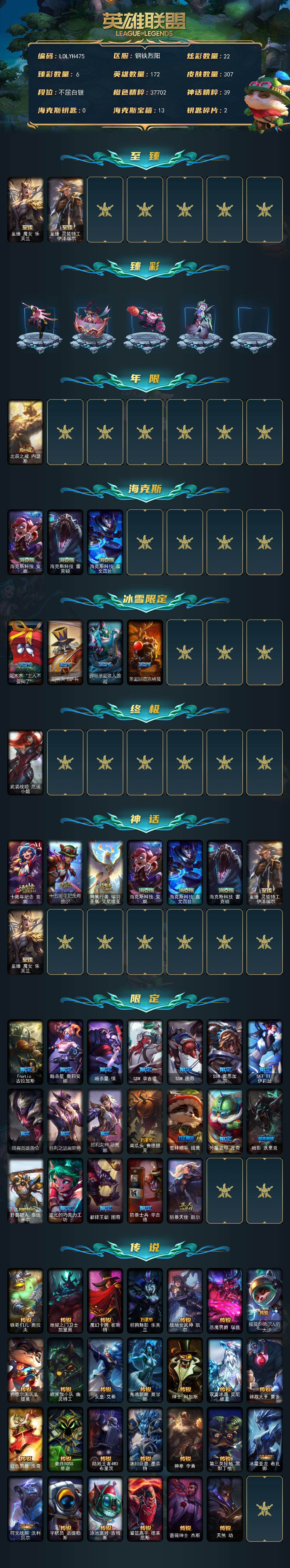 【lolyh475】172英雄/307皮肤/1终极/8神话/24限定/6臻彩/22炫彩/27传说/78史诗/白银账号等级:303/至臻魔女乐芙兰/至臻灵能特工伊泽瑞尔/玉剑传说无影竞星/玉剑传说琴仙子丁香/可爱可爱粉红红布里茨/魔女阿卡丽虚荣/魔女阿狸饕餮/净雪之月莫甘娜冬虹/北辰之威内瑟斯/海克斯科技安妮/海克斯科技雷克顿/海克斯科技嘉文四世/阿木木“主人不要我了”/胡桃夹子萨科/邪恶圣诞老人维迦/圣诞驯鹿克格莫/武装战姬厄运小姐/十周年纪念安妮/十五周年纪念希维尔/神凰行者瑞羽圣凰艾尼维亚/fnatic古拉加斯/暗杀星奥莉安娜/暗杀星慎/ssw辛吉德/ssw图奇/ssw雷恩加尔/sktt1伊莉丝/暗裔英雄盖伦/胜利之运崔斯特/胜利女神菲奥娜/南瓜头费德提克/密林猎手提莫/外星装甲库奇/暗影沃里克/野兽猎人泰达米尔/波比的巧克力工坊/都铎王朝图奇/防暴士兵辛吉德/防暴天使凯尔/铁哥们儿奥拉夫/地狱之门卫士加里奥/魔幻卡牌崔斯特/邪鸦魅影乐芙兰/战场女武神凯尔/恶魔男爵瑞兹/提莫约德尔人的一大步/约德尔国队长提莫/欧米伽小队幽灵特工/女皇艾希/鬼魂新娘莫甘娜/绅士科加斯/双重冰晶艾尼维亚/律政大亨蒙多/红色男爵库奇/最终boss维迦/陆地王者4wd布里茨/冰川巨兽墨菲特/神拳李青/第三类接触黑默丁格/冰霜亚龙希瓦娜/符文战熊沃利贝尔/宇航员诺提勒斯/泳池派对吉格斯/灌篮高手德莱厄斯/蔷薇绅士杰斯/天煞劫/皇家火呛手崔斯特/重生之沙费德提克/圣光审判凯尔/地狱火阿利斯塔/钢铁之心希维尔/圣洁化身索拉卡/兔宝宝提莫/熊猫提莫/荒野豺狼沃里克/法国皇室厄运小姐/黑帮狂花厄运小姐/刀锋女王莫甘娜/黑色荆棘莫甘娜/死神卡尔萨斯/小小骑士阿木木/全金属狂潮拉莫斯/贵族血统萨科/战争血统蒙多/五杀摇滚键盘手娑娜/夜行义贼艾瑞莉娅/寒冰女皇迦娜/恐惧新星普朗克/穿着正装的恶魔维迦/抵抗军天使凯特琳/铁血狙击手凯特琳/霸天巨兽墨菲特/海贼魅影卡特琳娜/暗夜猫女卡特琳娜/前线指挥官卡特琳娜/蓝焰梦魔魔腾/龙骑统帅嘉文四世/灵骨工匠奥莉安娜/三昧真火孙悟空/斗战胜佛孙悟空/防弹武僧李青/苍穹之光薇恩/法老王朝内瑟斯/铁血猎手奈德丽/四神之力乌迪尔/血色之锤波比/飞车暴走族古拉加斯/大夏武士潘森/冰川勇者伊泽瑞尔/死亡领主莫德凯撒/实习护士阿卡丽/铁血女忍阿卡丽/刺客信条凯南/铁甲雄心盖伦/钢铁烈阳蕾欧娜/刺客信条锐雯/血色精锐锐雯/兔女郎锐雯/帝王斑蝶克格莫/侏罗纪化石克格莫/腥红之月鬼武者慎/odst地狱伞兵拉克丝/星际迷航拉克丝/沙之守护泽拉斯/钢之逆鳞希瓦娜/骸骨之爪希瓦娜/银河魔装机神希瓦娜/黑帮教父格雷福斯/海牛猎手菲兹/铁血猎人雷恩加尔/皇家守卫菲奥娜/暗星卡兹克/铁血帝皇德莱厄斯/生化骑士德莱厄斯/源代码丽桑卓/暗黑女武神黛安娜/野火之藤婕拉/最后一只恐龙纳尔/源计划风亚索/源计划雷卢锡安/时之砂艾克/仲裁圣骑亚托克斯/上古战魂雷克塞/永恒之森巴德/五杀摇滚鼓手奥拉夫/霹雳游侠弗拉基米尔/西部牛仔崔斯特/拆弹专家黑默丁格/冰河时代奥拉夫/创意工坊黑默丁格/烈焰猛士奥拉夫/小红帽安妮/银河魔装机神安妮/幽蓝梦魇加里奥/风执事加里奥/逆转裁判崔斯特/未来战士崔斯特/秘密特工赵信/电锯狂人厄加特/潮流女王乐芙兰/弗拉基米尔伯爵/联合王国费德提克/荒野幽灵费德提克/暗影易/星战易/金牛座阿利斯塔/斗牛士阿利斯塔/荒野镖客阿利斯塔/黑暗骑士阿利斯塔/哞利斯塔/部落精神瑞兹/宗师级法师训练师瑞兹/武仙座海格力斯赛恩/光明骑士希维尔/森林女神索拉卡/蕉泥座人索拉卡/游击队员崔丝塔娜/约德尔海贼团崔丝塔娜/欧米伽小队魔鬼伞兵/我羽饰骑士崔丝塔娜/黑暗骑士沃里克/源计划末日沃里克/古神沃里克/脏兮兮努努和威朗普/西部牛仔厄运小姐/荒野女警厄运小姐/极地女神艾希/勇敢的心艾希/勇敢的心泰达米尔/黑夜使者泰达米尔/冰球队员贾克斯/宗师级钓鱼训练师贾克斯/复仇武神贾克斯/嘻哈精神基兰/遗迹守护者基兰/时间机器基兰/冲浪高手辛吉德/黑暗女王伊芙琳/假面女皇伊芙琳/探戈灵魂伊芙琳/首领图奇/北风冻原图奇/绝影神偷图奇/梦魇科加斯/尼斯巨兽科加斯/狂欢阿木木/情绪摇滚阿木木/青花瓷阿木木/铬金铠甲拉莫斯/极度深寒拉莫斯/重甲猎鹰艾尼维亚/凤凰星神艾尼维亚/地下都市梦魇萨科/健美教练蒙多/嗜血行刑蒙多/虚空前世卡萨丁/先驱行者卡萨丁/幽灵船长普朗克/电玩上校库奇/日冕女神卡尔玛/光明骑士卡尔玛/紫水晶意志塔里克/灰胡子魔法师维迦/欧米伽小队天雷爆破手/垃圾场特朗德尔/巡逻警官特朗德尔/创世之神特朗德尔/海贼参谋斯维因/双城之战凯特琳/铁锈斑斑布里茨/钢铁之门布里茨/戴一个表布里茨/暮色呛骑布里茨/三叶草墨菲特/珊瑚礁墨菲特/赏金猎人卡特琳娜/红牌退场卡特琳娜/恶咒亡魂魔腾/图腾古树茂凯/星河战队雷克顿/血石战神雷克顿/鳄霸雷克顿/屠龙勇士嘉文四世/战斗学院孙悟空/传统僧侣李青/热带丛林兰博/独眼海盗兰博/荒漠之咬卡西奥佩娅/蛇发女妖卡西奥佩娅/单身贵族内瑟斯/创世之神内瑟斯/太空律动狗头内瑟斯/丛林猎豹奈德丽/法国女仆奈德丽/武力全开乌迪尔/这货不是乌迪尔/诺克萨斯波比/品酒大师古拉加斯/美酒节特使古拉加斯/狂热球迷古拉加斯/英仙座珀尔修斯潘森/足球先生伊泽瑞尔/龙骑士莫德凯撒/kda阿卡丽/空手道凯南/战
