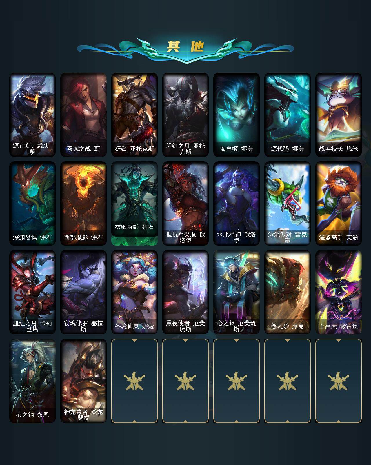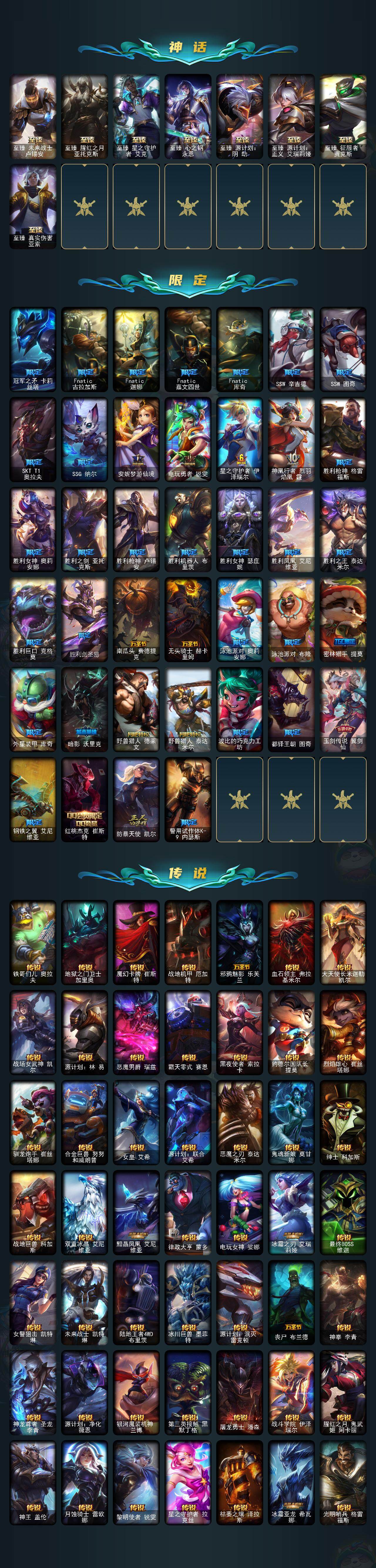 【lolz1029】172英雄/569皮肤/3终极/29神话/57限定/12臻彩/232炫彩/66传说/136史诗/铂金/爱情鸽头像/至臻灵魂莲华易/至臻征服者贾克斯/至臻源计划正义艾瑞莉娅/至臻电玩女神凯特琳/至臻灵能特工伊泽瑞尔/至臻王国机神玄武盖伦/至臻神龙尊者均衡之龙沃利贝尔/至臻kdaallout卡莎/至臻真实伤害亚索/至臻未来战士卢锡安/至臻源计划阴劫/至臻星之守护者艾克/至臻腥红之月亚托克斯/至臻未来战士锤石/至臻心之钢永恩/至臻神龙尊者炎龙瑟提/天龙之子卡莎飞龙乘云/墨之影武者亚索金墨耀影/神龙尊者圣龙李青龙腾云起/西部魔影卢锡安贝利尔之怠/泳池派对菲奥娜清凉苹果冰/源计划联合艾希红莲之弓/黎明使者锐雯黑夜使者/星之守护者金克丝黑洞/源计划火菲奥娜惩戒/魔女阿卡丽虚荣/净雪之月莫甘娜冬虹/心之钢伊泽瑞尔天纵才华/替父从军花木兰/神龙烈焰金克丝/玉净夜叉凯特琳/司马懿仲达/金猪烈焰瑟庄妮/天龙之子斯莫德/海克斯科技雷克顿/海克斯科技嘉文四世/摄魂使者薇恩/海克斯科技瑟庄妮/海克斯科技吉格斯/恐惧新星德莱厄斯/觅心魔灵奥莉安娜/幸福女神乐芙兰/圣诞精灵崔丝塔娜/圣诞糖果棒厄运小姐/胡桃夹子萨科/邪恶圣诞老人维迦/喜庆之树茂凯/圣诞玩偶波比/冰雪驯鹿波比/圣诞驯鹿克格莫/圣诞老人布隆/冰雪节辛吉德/大元素使拉克丝/灵魂守卫乌迪尔/武装战姬厄运小姐/十周年纪念安妮/源代码乐芙兰/暗星科加斯/神凰行者瑞羽圣凰艾尼维亚/灰烬骑士莫德凯撒/灰烬杀手塞拉斯/灰烬骑士派克/冠军之矛卡莉丝塔/fnatic古拉加斯/fnatic迦娜/fnatic嘉文四世/fnatic库奇/ssw辛吉德/ssw图奇/sktt1奥拉夫/ssg纳尔/安妮梦游仙境/电玩勇者锐雯/星之守护者伊泽瑞尔/神凰行者烈羽焰凰霞/胜利呛神格雷福斯/胜利女神奥莉安娜/胜利之剑亚托克斯/胜利呛神卢锡安/胜利机器人布里茨/胜利女神瑟庄妮/胜利凤凰艾尼维亚/胜利之王泰达米尔/胜利巨口克格莫/胜利剑圣易/南瓜头费德提克/无头骑士赫卡里姆/泳池派对奥莉安娜/泳池派对布隆/密林猎手提莫/外星装甲库奇/暗影沃里克/野兽猎人德莱文/野兽猎人泰达米尔/波比的巧克力工坊/都铎王朝图奇/玉剑传说翼剑仙/钢铁之翼艾尼维亚/红桃杰克崔斯特/防暴天使凯尔/警用试作体k9内瑟斯/铁哥们儿奥拉夫/地狱之门卫士加里奥/魔幻卡牌崔斯特/战地机甲厄加特/邪鸦魅影乐芙兰/血石领主弗拉基米尔/大天使长米迦勒凯尔/战场女武神凯尔/源计划林易/恶魔男爵瑞兹/霸天零式赛恩/黑夜使者索拉卡/约德尔国队长提莫/烈焰雄心崔丝塔娜/驯龙炮手崔丝塔娜/合金巨兽努努和威朗普/女皇艾希/源计划联合艾希/恶魔之刃泰达米尔/鬼魂新娘莫甘娜/绅士科加斯/战地巨兽科加斯/双重冰晶艾尼维亚/黯晶凤凰艾尼维亚/律政大亨蒙多/电玩女神娑娜/冰霜之刃艾瑞莉娅/最终boss维迦/女警狙击凯特琳/未来战士凯特琳/陆地王者4wd布里茨/冰川巨兽墨菲特/源计划泯灭雷克顿/丧尸布兰德/神拳李青/神龙尊者圣龙李青/源计划净化薇恩/银河魔装机神兰博/第三类接触黑默丁格/屠龙勇士潘森/战斗学院伊泽瑞尔/腥红之月鬼武姬阿卡丽/神王盖伦/月蚀骑士蕾欧娜/黎明使者锐雯/星之守护者拉克丝/枯萎之壤泽拉斯/冰霜亚龙希瓦娜/光明哨兵格雷福斯/符文战熊沃利贝尔/苍穹之光韦鲁斯/宇航员诺提勒斯/泳池派对吉格斯/金牌主播德莱文/霸天异形卡兹克/灌篮高手德莱厄斯/神王德莱厄斯/黑夜使者亚索/神龙尊者昼日真龙亚索/神龙尊者夜月幻龙亚索/星之守护者金克丝/西部天使赛娜/西部魔影卢锡安/天煞劫/黎明使者永恩/灵魂莲华瑟提/安伯斯与提妮/特战先锋赵信/绞肉机角斗士赵信/翼骑统领赵信/摄魂男爵弗拉基米尔/重生之沙费德提克/圣光审判凯尔/侍魂易/地狱火阿利斯塔/战场公主希维尔/钢铁之心希维尔/圣洁化身索拉卡/兔宝宝提莫/熊猫提莫/火箭达人崔丝塔娜/黑帮狂花厄运小姐/国王泰达米尔/百夫长贾克斯/刀锋女王莫甘娜/炼金狂士辛吉德/死神卡尔萨斯/卡尔萨斯祸害之光/殇之机器人阿木木/熔火之心拉莫斯/贵族血统萨科/飞越疯人院萨科/战争血统蒙多/掠星魔刃卡萨丁/夜刃艾瑞莉娅/海克斯科技迦娜/寒冰女皇迦娜/特种部队普朗克/恐惧新星普朗克/血石诅咒塔里克/穿着正装的恶魔维迦/北领前线斯维因/驯龙大师斯维因/抵抗军天使凯特琳/古墓丽影凯特琳/霸天巨兽墨菲特/无畏号墨菲特/暗夜猫女卡特琳娜/前线指挥官卡特琳娜/沙漠风暴卡特琳娜/蓝焰梦魔魔腾/符文战神雷克顿/龙骑统帅嘉文四世/凯旋英雄嘉文四世/暗星嘉文四世/死亡绽放伊莉丝/腥红之月伊莉丝/灵骨工匠奥莉安娜/三昧真火孙悟空/斗战胜佛孙悟空/v字仇杀者布兰德/冰晶之核布兰德/防弹武僧李青/至高之拳李青/地下拳王李青/屠龙勇士薇恩/战地机甲斯卡纳/军神战甲波比/血色之锤波比/飞车暴走族古拉加斯/钢铁意志潘森/面包之王潘森/死亡领主莫德凯撒/银色之牙阿卡丽/刺客信条凯南/腥红之月凯南/孤高游侠盖伦/钢铁烈阳蕾欧娜/至高君王玛尔扎哈/腥红之月泰隆/血色精锐锐雯/侏罗纪化石克格莫/战国大名慎/odst地狱伞兵拉克丝/钢之逆鳞希瓦娜/银河魔装机神希瓦娜/暗影妖狐阿狸/黑帮教父格雷福斯/银河魔装机神菲兹/铁血猎人雷恩加尔/暗黑武士雷恩加尔/暗星韦鲁斯/皇家守卫菲奥娜/夜鸦菲奥娜/源计划火菲奥娜/驯龙女巫璐璐/星之守护者璐璐/永恒之森赫卡里姆/沙之守护卡