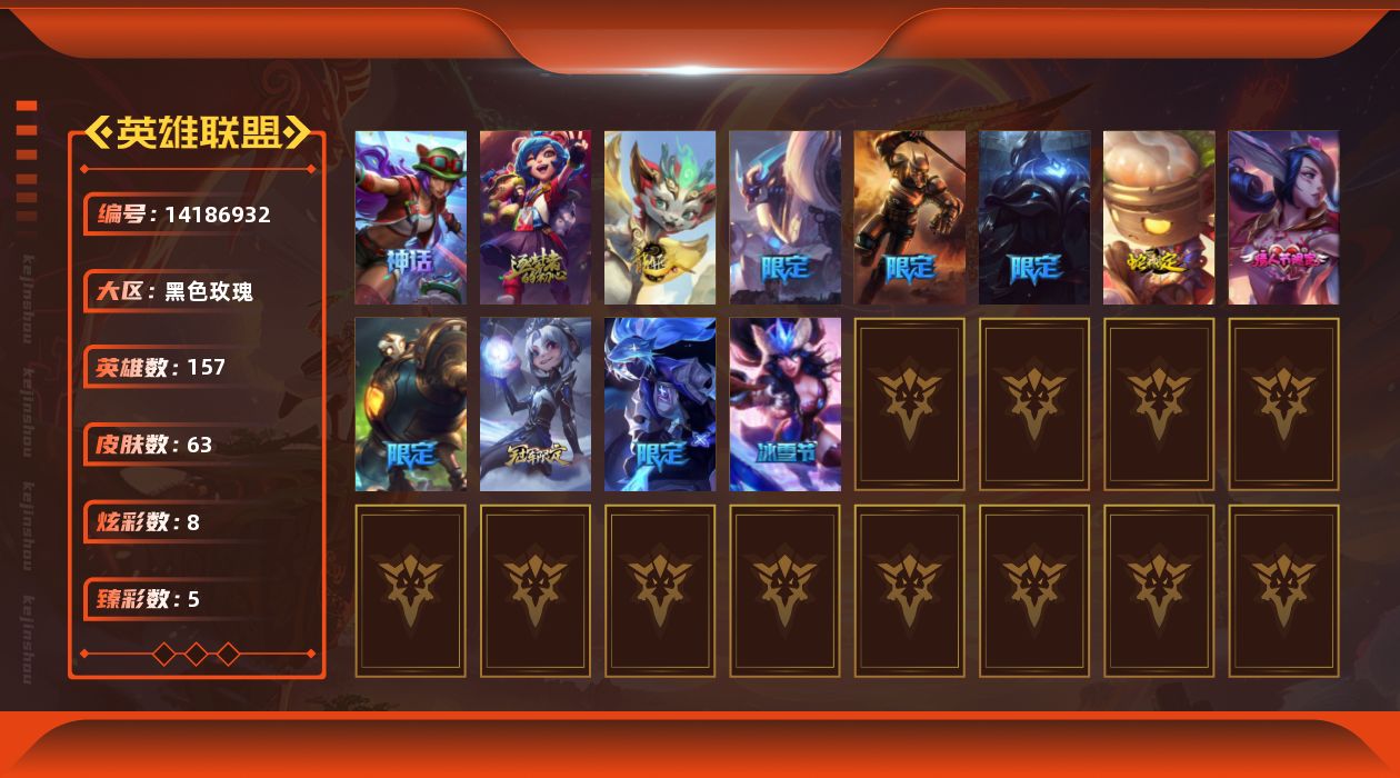 [14186932]【编号39162 可秒换绑】【多数量皮肤质量号!!】 未定级段位-157英雄-63皮肤-8炫彩-0终极-2神话-12限定-7传说-7史诗 【臻彩皮肤】:冠军之志瑞兹凯旋圣装,冠军之隐劫凯旋圣装,破败军团厄运小姐灵岛征伐使,可爱可爱粉红红布里茨,海之歌艾希冰爽浪花 【年限皮肤】:天龙之子斯莫德,点心宝贝阿木木 【情人节限定】:甜心之羽霞 【冰雪限定】:冰雪风暴希维尔 【神话皮肤】:十周年纪念安妮,十五周年纪念希维尔 【限定皮肤】:舞会公主安妮,冠军之隐劫,edg佐伊,drx阿卡丽,暗裔英雄盖伦,胜利机器人布里茨,破空呛骑孙悟空,警用试作体k9内瑟斯 【传说皮肤】:大天使长米迦勒凯尔,合金巨兽努努和威朗普,双重冰晶艾尼维亚,冰川巨兽墨菲特,女帝卡特琳娜,枯萎之壤泽拉斯,黯黑魔龙希瓦娜 【史诗皮肤】:绞肉机角斗士赵信,v字仇杀者布兰德,血色之锤波比,帝王斑蝶克格莫,星际迷航拉克丝,钢之逆鳞希瓦娜,冲击之刃劫 【其他皮肤1】:银河魔装机神安妮,咖啡甜心安妮,黑暗骑士奥拉夫,地狱火加里奥,皇家守卫赵信,西部魔影厄加特,波江星神弗拉基米尔,后场堡垒阿利斯塔,宗师级法师训练师瑞兹,原野伐木工赛恩,星之守护者索拉卡,源计划末日沃里克,星之守护者厄运小姐,科学狂人辛吉德,腥红之月伊芙琳,北风冻原图奇,王子不是我阿木木,荒野治安官凯特琳,古神墨菲特,黑色玫瑰假面舞会伊莉丝,电玩勇者伊泽瑞尔,五杀摇滚吉他手莫德凯撒,战神阿瑞斯盖伦,魔灵玛尔扎哈,荣誉使者玛尔扎哈,电格莫,主治医师慎,韦鲁斯迅箭,全金属狂潮维克托,巅峰之星杰斯,霸天龙神奥瑞利安索尔,泳池派对扎克,战场boss卑尔维斯,真实伤害奇亚娜,魔域梦魇烈娜塔