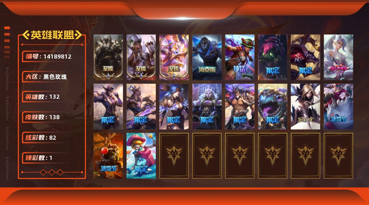 [14189812]未定级段位-132英雄-138皮肤-82炫彩-0终极-5神话-14限定-20传说-35史诗 【至臻皮肤】:至臻魅惑女巫厄运小姐,至臻太空律动节奏幻师璐璐,至臻腥红之月亚托克斯 【臻彩皮肤】:无畏骑士瑟庄妮赤子初心 【海克斯皮肤】:海克斯科技卡萨丁 【情人节限定】:水晶玫瑰婕拉 【冰雪限定】:圣诞驯鹿克格莫,魄罗骑士瑟庄妮 【神话皮肤】:十五周年纪念希维尔,海克斯科技卡萨丁,至臻魅惑女巫厄运小姐,至臻太空律动节奏幻师璐璐,至臻腥红之月亚托克斯 【限定皮肤】:ig卡莎,胜利女神瑟庄妮,胜利之王泰达米尔,胜利巨口克格莫,胜利女神娑娜,胜利剑圣易,胜利之运崔斯特,鬼影重重魔腾,泳池派对奥莉安娜,都铎王朝图奇,惊悚派对阿木木 【传说皮肤】:铁哥们儿奥拉夫,烈焰雄心崔丝塔娜,西部天使艾希,鬼魂新娘莫甘娜,绅士科加斯,女主播迦娜,未来战士凯特琳,苹果机器人布里茨,神拳李青,银河魔装机神兰博,屠龙勇士潘森,战斗学院伊泽瑞尔,耀星女神拉克丝,星之守护者阿狸,苍穹之光韦鲁斯,宇航员诺提勒斯,女校长菲奥娜,金牌主播德莱文,神王德莱厄斯,西部魔影卢锡安 【史诗皮肤】:摄魂男爵弗拉基米尔,战争机器赛恩,战场公主希维尔,火箭达人崔丝塔娜,死神卡尔萨斯,全金属狂潮拉莫斯,五杀摇滚键盘手娑娜,掠星魔刃卡萨丁,寒冰女皇迦娜,特种部队普朗克,暗夜猫女卡特琳娜,死亡绽放伊莉丝,苍穹之光薇恩,深海妖姬卡西奥佩娅,铁血猎手奈德丽,飞车暴走族古拉加斯,铁甲雄心盖伦,钢铁烈阳蕾欧娜,战地机甲克格莫,腥红之月鬼武者慎,星际迷航拉克丝,暗影妖狐阿狸,黑帮教父格雷福斯,白色死神韦鲁斯,暗星卡兹克,天启骑士杰斯,仲裁圣女辛德拉,最后一只恐龙纳尔,邪恶魔人扎克,弗雷尔卓德塔莉垭,猛虎布隆,银河魔装机神千珏,腥红之月锤石,上古战魂雷克塞,暮星之羽霞 【王者皮肤】:霹雳游侠弗拉基米尔,西部牛仔崔斯特 【典藏皮肤】:深潜蛙人古拉加斯 【其他皮肤1】:黑暗骑士奥拉夫,皇家守卫赵信,黑潮弗拉基米尔,腥红之月希维尔,奥德赛希维尔,咖啡甜心希维尔,咖啡甜心索拉卡,西部牛仔厄运小姐,玉剑传说苍鸾,遗迹守护者基兰,抵抗军绿魔辛吉德,黑金诱惑图奇,五杀摇滚主唱卡尔萨斯,梦魇科加斯,地狱火阿木木,沙之守护拉莫斯,玉剑传说风仙子,神龙尊者宁静之龙卡尔玛,灰胡子魔法师维迦,绝息圣堂魔腾,黯晶巨鳄雷克顿,银河魔装机神伊莉丝,黑色玫瑰假面舞会伊莉丝
