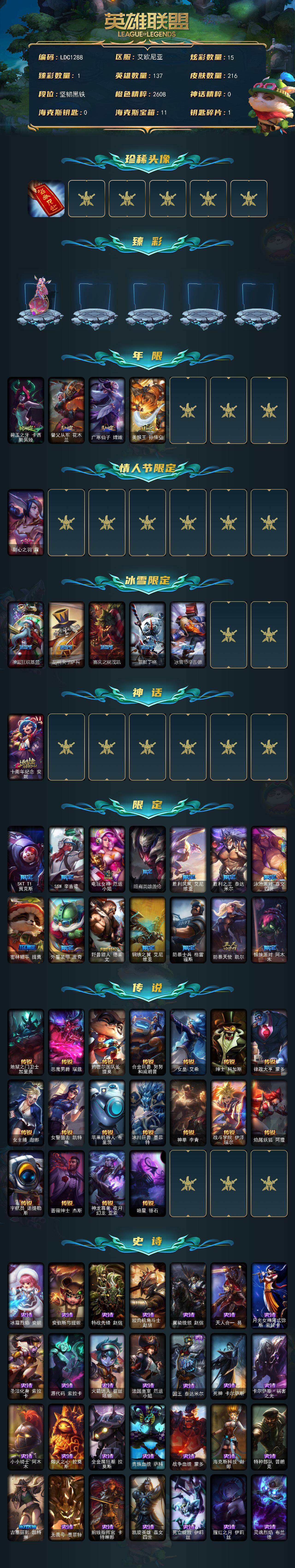 【ldc1288】137英雄/216皮肤/1神话/24限定/1臻彩/15炫彩/18传说/60史诗/未定级账号等级:119/红包头像/星之守护者萨勒芬妮未来之光/碧玉之牙卡西奥佩娅/替父从军花木兰/广寒仙子嫦娥/美猴王孙悟空/甜心之羽霞/圣诞狂欢基兰/胡桃夹子萨科/喜庆之树茂凯/雪默丁格/冰雪节辛吉德/十周年纪念安妮/sktt1贾克斯/ssw辛吉德/电玩女神厄运小姐/暗裔英雄盖伦/胜利凤凰艾尼维亚/胜利之王泰达米尔/泳池派对嘉文四世/密林猎手提莫/外星装甲库奇/野兽猎人德莱文/钢铁之翼艾尼维亚/防暴士兵格雷福斯/防暴天使凯尔/惊悚派对阿木木/地狱之门卫士加里奥/恶魔男爵瑞兹/约德尔国队长提莫/合金巨兽努努和威朗普/女皇艾希/绅士科加斯/律政大亨蒙多/女主播迦娜/女警狙击凯特琳/苹果机器人布里茨/冰川巨兽墨菲特/神拳李青/战斗学院伊泽瑞尔/焰尾妖狐阿狸/宇航员诺提勒斯/蔷薇绅士杰斯/神龙尊者夜月幻龙亚索/暗星锤石/冰霜烈焰安妮/安伯斯与提妮/特战先锋赵信/绞肉机角斗士赵信/翼骑统领赵信/天人合一易/月光女神阿忒弥斯索拉卡/圣洁化身索拉卡/源代码索拉卡/火箭达人崔丝塔娜/法国皇室厄运小姐/国王泰达米尔/死神卡尔萨斯/卡尔萨斯祸害之光/小小骑士阿木木/熔火之心拉莫斯/全金属狂潮拉莫斯/贵族血统萨科/战争血统蒙多/海克斯科技迦娜/特种部队普朗克/古墓丽影凯特琳/无畏号墨菲特/前线指挥官卡特琳娜/凯旋英雄嘉文四世/死亡绽放伊莉丝/腥红之月伊莉丝/灵魂烈焰布兰德/防弹武僧李青/法老王朝内瑟斯/铁血猎手奈德丽/四神之力乌迪尔/星之守护者波比/飞车暴走族古拉加斯/钢铁意志潘森/冰川勇者伊泽瑞尔/刺客信条凯南/铁甲雄心盖伦/至高君王玛尔扎哈/刺客信条锐雯/帝王斑蝶克格莫/战国大名慎/沙之守护泽拉斯/银河魔装机神菲兹/驯龙女巫璐璐/生化骑士德莱厄斯/腥红之月黛安娜/血羽凤凰奎因/仲裁圣女辛德拉/萌侦探喵尔摩斯/邪恶魔人扎克/源计划风亚索/弗雷尔卓德塔莉垭/猛虎布隆/黑帮狂花金克丝/源计划阴劫/霓虹杀拳蔚/仲裁圣骑亚托克斯/锦鲤娜美/糖果之王艾翁/五杀摇滚鼓手奥拉夫/拆弹专家黑默丁格/魔导绅士维迦/银河魔装机神安妮/黑暗骑士奥拉夫/地狱火加里奥/逆转裁判崔斯特/黑暗骑士赵信/深渊巨蟹厄加特/黑潮弗拉基米尔/荒野幽灵费德提克/金牛座阿利斯塔/荒野镖客阿利斯塔/部落精神瑞兹/美国大叔瑞兹/宗师级法师训练师瑞兹/光明骑士希维尔/森林女神索拉卡/星之守护者厄运小姐/极地女神艾希/勇敢的心艾希/梦魇泰达米尔/冰球队员贾克斯/玉剑传说苍鸾/机械污染辛吉德/黑色天灾辛吉德/黑暗女王伊芙琳/假面女皇伊芙琳/黑金诱惑图奇/横行霸道图奇/绝影神偷图奇/梦魇科加斯/尼斯巨兽科加斯/狂欢阿木木/王子不是我阿木木/恐怖之源萨科/战栗之毒蒙多/健美教练蒙多/缪斯女神娑娜/深海一号卡萨丁/光明哨兵艾瑞莉娅/暴风女神迦娜/大力水手普朗克/樱花乱舞卡尔玛/奥德赛卡尔玛/紫水晶意志塔里克/冰壶选手维迦/小怪兽训练师维迦/里尔击球手特朗德尔/荒野治安官凯特琳/战场boss布里茨/珊瑚礁墨菲特/暗星墨菲特/烈焰古树茂凯/荒野之咬雷克顿/屠龙勇士嘉文四世/恶灵布偶奥莉安娜/猎天使魔女薇恩/热带丛林兰博/荒漠之咬卡西奥佩娅/蛇发女妖卡西奥佩娅/上古魔蛇卡西奥佩娅/魔女卡西奥佩娅/丛林猎豹奈德丽/法国女仆奈德丽/银河魔装机神奈德丽/狂热球迷古拉加斯/英仙座珀尔修斯潘森/五杀摇滚吉他手莫德凯撒/地狱送葬约里克/五杀摇滚贝斯手约里克/蜂刺阿卡丽/kdaallout阿卡丽/银色闪电凯南/海上霸主盖伦/烧烤女神蕾欧娜/魔灵玛尔扎哈/毛毛虫克格莫/炎爆慎/战地法师泽拉斯/风纪委员阿狸/kda阿狸/魅惑之月阿狸/无情重炮格雷福斯/失落大陆菲兹/绒毛菲兹/坚韧不屈沃利贝尔/雷喵喵尔/夜魔水晶韦鲁斯/地底迷城诺提勒斯/全金属狂潮维克托/野兽女王瑟庄妮/传统造型瑟庄妮/玉剑传说无双/花仙骑士菲奥娜/少校吉格斯/糖果大战吉格斯/糖果女巫璐璐/泳池派对璐璐/血石骑士赫卡里姆/幽魂骑士赫卡里姆/魔女丽桑卓/kda卡莎/kdaallout卡莎/这货不是维克兹/黯晶之眼维克兹/女警官蔚/狂鲨亚托克斯/腥红之月亚托克斯/源代码娜美/花仙骑士卡莉丝塔/巴德吟游诗人/花仙贤者米利欧