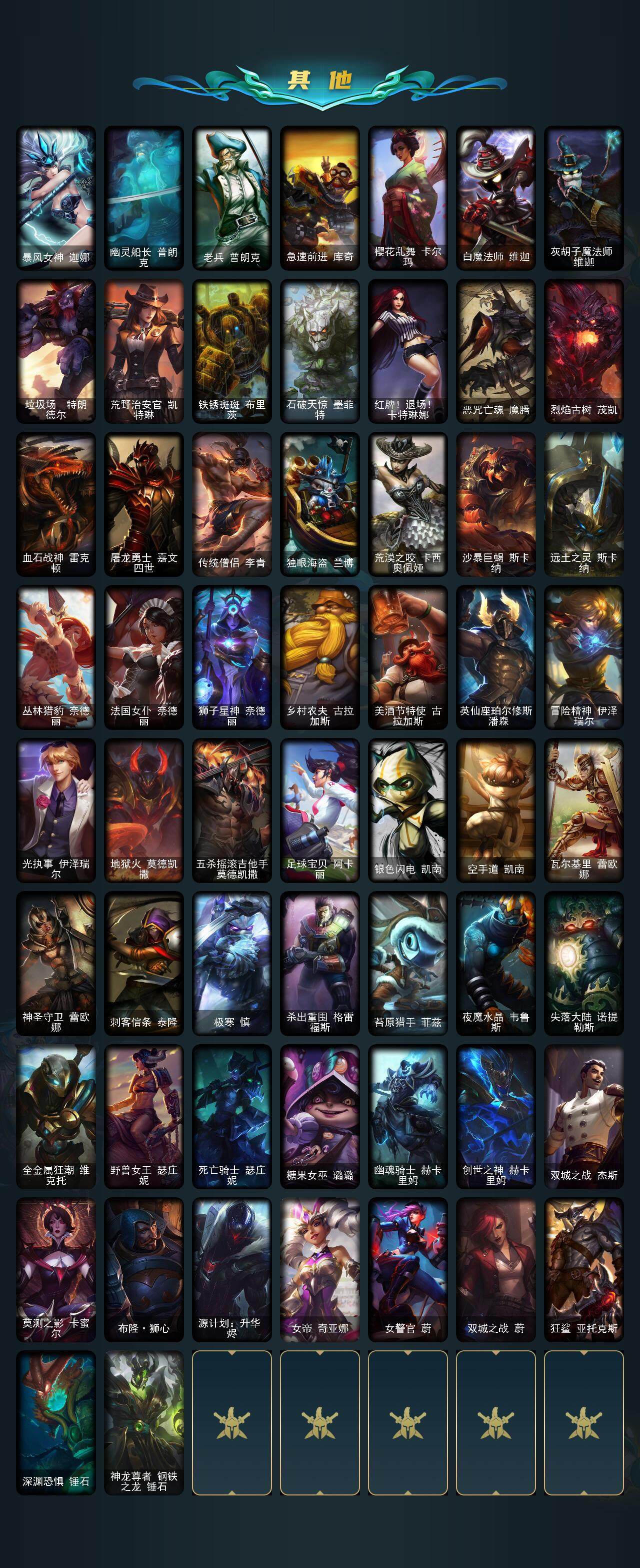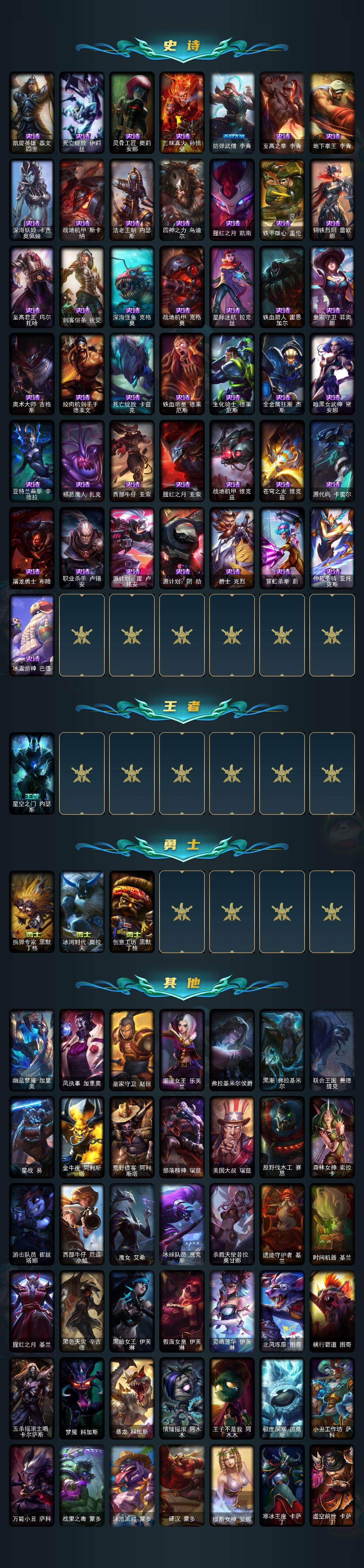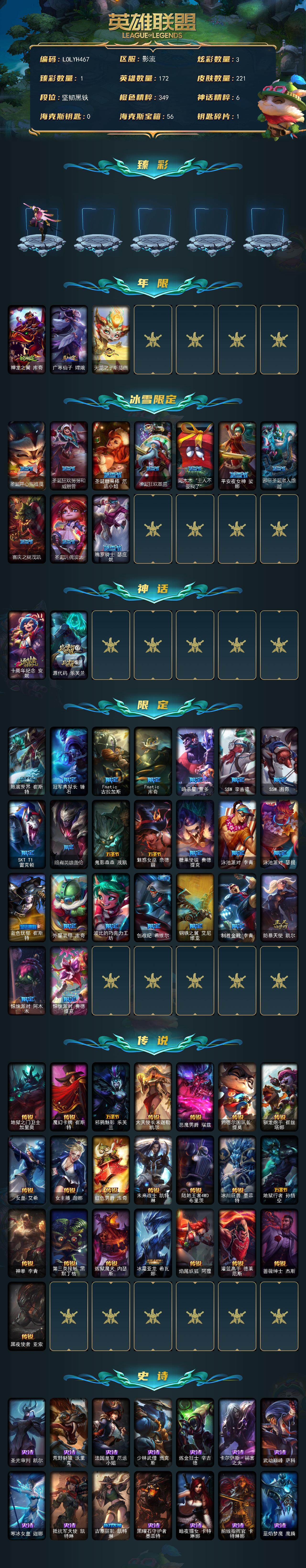 【lolyh467】172英雄/221皮肤/2神话/36限定/1臻彩/3炫彩/22传说/57史诗/未定级/玉剑传说无影竞星/神龙之翼库奇/马年黛安娜/天龙之子斯莫德/圣诞开心鬼提莫/圣诞狂欢努努/圣诞糖果棒女呛/圣诞狂欢基兰/“主人不要我了”阿木木/平安夜女神琴女/邪恶圣诞老人维迦/冰雪节茂凯/圣诞玩偶波比/魄罗骑士瑟庄妮/10周年安妮/源代码乐芙兰/地底世界崔斯特/冠军典狱长锤石/s1fnc
