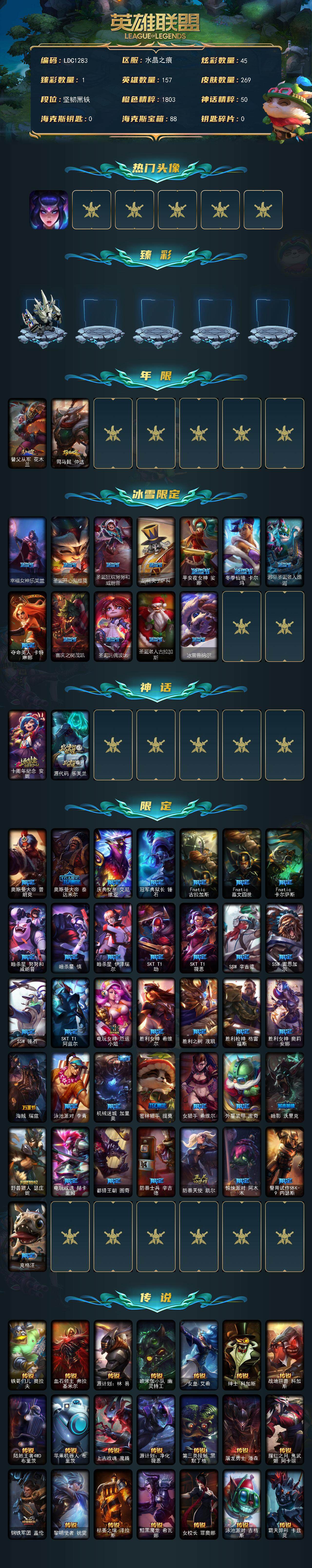 【ldc1283】157英雄/269皮肤/2神话/50限定/1臻彩/45炫彩/23传说/84史诗/未定级账号等级:165/玉剑传说苍鸾头像/霸天巨兽雪崩墨菲特/马年锐雯/鸡年司马懿仲达阿兹尔/幸福女神乐芙兰/圣诞开心鬼提莫/圣诞狂欢努努/胡桃夹子小丑/平安夜女神琴女/冬季仙境卡尔玛/邪恶圣诞老人维迦/夺命美人卡特琳娜/冰雪节茂凯/圣诞玩偶波比/圣诞老人酒桶/冰雪兽纳尔/10周年安妮/源代码乐芙