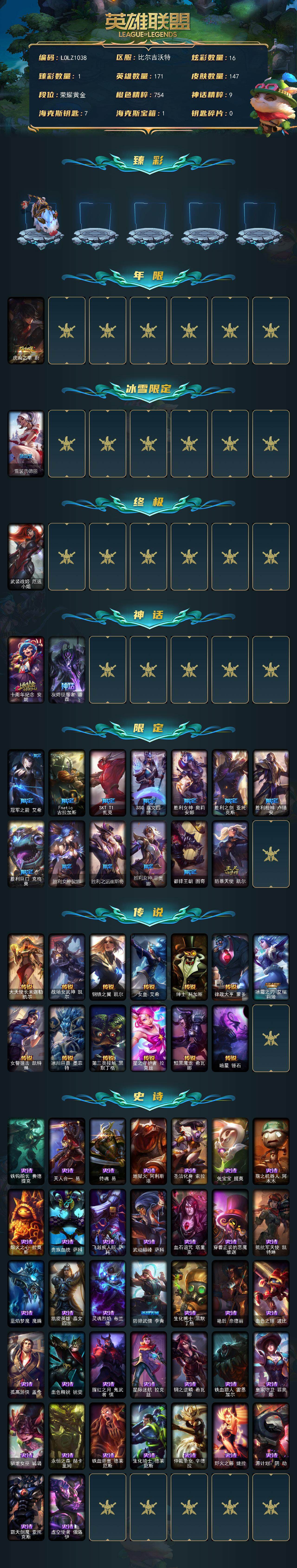 【lolz1038】171英雄/147皮肤/1终极/2神话/15限定/1臻彩/16炫彩/13传说/37史诗/黄金/无畏骑士瑟庄妮赤子初心/鸡年蔚/雪装豹女/武装战姬/10周年安妮/灰烬骑士潘森/冠军之箭艾希/s1fnc酒桶/s6sktt1扎克/s7ssg嘉文四世/胜利女神奥利安娜/胜利之剑剑魔/胜利呛神卢锡安/胜利巨口克格莫/胜利女神娑娜/胜利之运崔斯特/胜利女神菲奥娜/都铎王朝老鼠/防暴天使