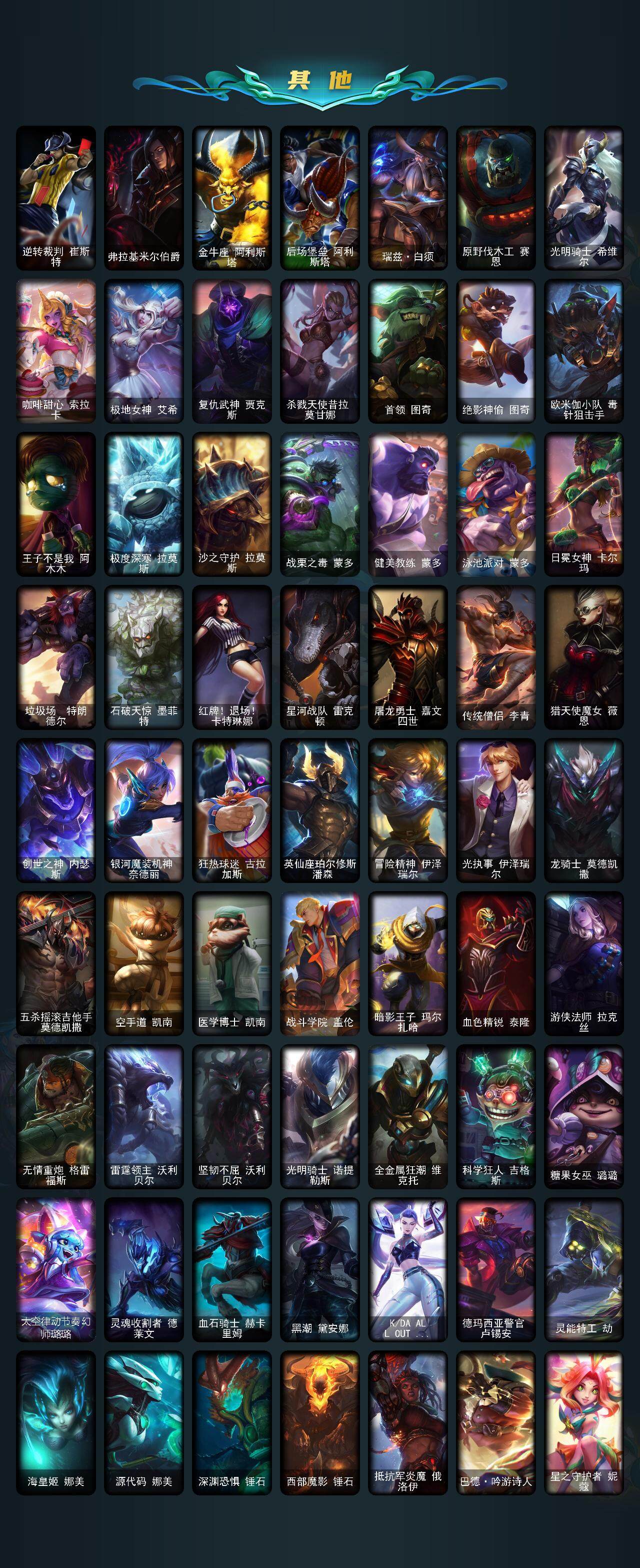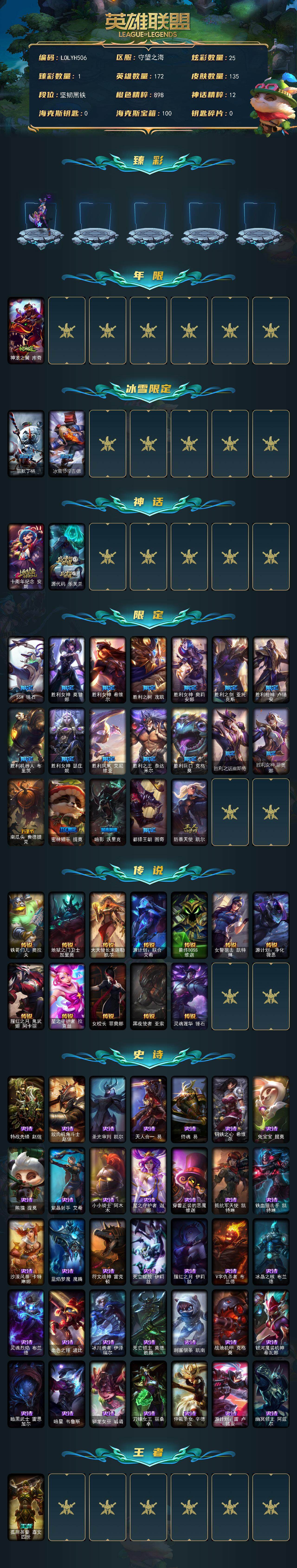 【lolyh506】172英雄/135皮肤/2神话/22限定/1臻彩/25炫彩/12传说/35史诗/未定级/星之守护者金克丝黑洞/神龙之翼库奇/雪默丁格/冰雪节辛吉德/十周年纪念安妮/源代码乐芙兰/ssw锤石/胜利女神莫甘娜/胜利女神希维尔/胜利之树茂凯/胜利女神奥莉安娜/胜利之剑亚托克斯/胜利呛神卢锡安/胜利机器人布里茨/胜利女神瑟庄妮/胜利凤凰艾尼维亚/胜利之王泰达米尔/胜利巨口克格莫/胜利之运崔斯特/胜利女神菲奥娜/南瓜头费德提克/密林猎手提莫/暗影沃里克/都铎王朝图奇/防暴天使凯尔/铁哥们儿奥拉夫/地狱之门卫士加里奥/大天使长米迦勒凯尔/源计划联合艾希/最终boss维迦/女警狙击凯特琳/源计划净化薇恩/腥红之月鬼武姬阿卡丽/星之守护者拉克丝/女校长菲奥娜/黑夜使者亚索/灵魂莲华锤石/特战先锋赵信/绞肉机角斗士赵信/圣光审判凯尔/天人合一易/侍魂易/钢铁之心希维尔/兔宝宝提莫/熊猫提莫/紫晶射手艾希/小小骑士阿木木/星之守护者迦娜/穿着正装的恶魔维迦/抵抗军天使凯特琳/铁血狙击手凯特琳/沙漠风暴卡特琳娜/蓝焰梦魔魔腾/符文战神雷克顿/死亡绽放伊莉丝/腥红之月伊莉丝/v字仇杀者布兰德/冰晶之核布兰德/灵魂烈焰布兰德/血色之锤波比/冰川勇者伊泽瑞尔/死亡领主莫德凯撒/刺客信条凯南/战地机甲克格莫/银河魔装机神希瓦娜/暗黑武士雷恩加尔/暗星韦鲁斯/驯龙女巫璐璐/刀锋女王丽桑卓/仲裁圣女辛德拉/源计划雷卢锡安/幽冥领主阿兹尔/孤胆英豪嘉文四世/逆转裁判崔斯特/弗拉基米尔伯爵/金牛座阿利斯塔/后场堡垒阿利斯塔/瑞兹白须/原野伐木工赛恩/光明骑士希维尔/咖啡甜心索拉卡/极地女神艾希/复仇武神贾克斯/杀戮天使昔拉莫甘娜/首领图奇/绝影神偷图奇/欧米伽小队毒针狙击手/王子不是我阿木木/极度深寒拉莫斯/沙之守护拉莫斯/战栗之毒蒙多/健美教练蒙多/泳池派对蒙多/日冕女神卡尔玛/垃圾场特朗德尔/石破天惊墨菲特/红牌退场卡特琳娜/星河战队雷克顿/屠龙勇士嘉文四世/传统僧侣李青/猎天使魔女薇恩/创世之神内瑟斯/银河魔装机神奈德丽/狂热球迷古拉加斯/英仙座珀尔修斯潘森/冒险精神伊泽瑞尔/光执事伊泽瑞尔/龙骑士莫德凯撒/五杀摇滚吉他手莫德凯撒/空手道凯南/医学博士凯南/战斗学院盖伦/暗影王子玛尔扎哈/血色精锐泰隆/游侠法师拉克丝/无情重炮格雷福斯/雷霆领主沃利贝尔/坚韧不屈沃利贝尔/光明骑士诺提勒斯/全金属狂潮维克托/科学狂人吉格斯/糖果女巫璐璐/太空律动节奏幻师璐璐/灵魂收割者德莱文/血石骑士赫卡里姆/黑潮黛安娜/kdaallout卡莎/德玛西亚警官卢锡安/灵能特工劫/海皇姬娜美/源代码娜美/深渊恐惧锤石/西部魔影锤石/抵抗军炎魔俄洛伊/巴德吟游诗人/星之守护者妮蔻