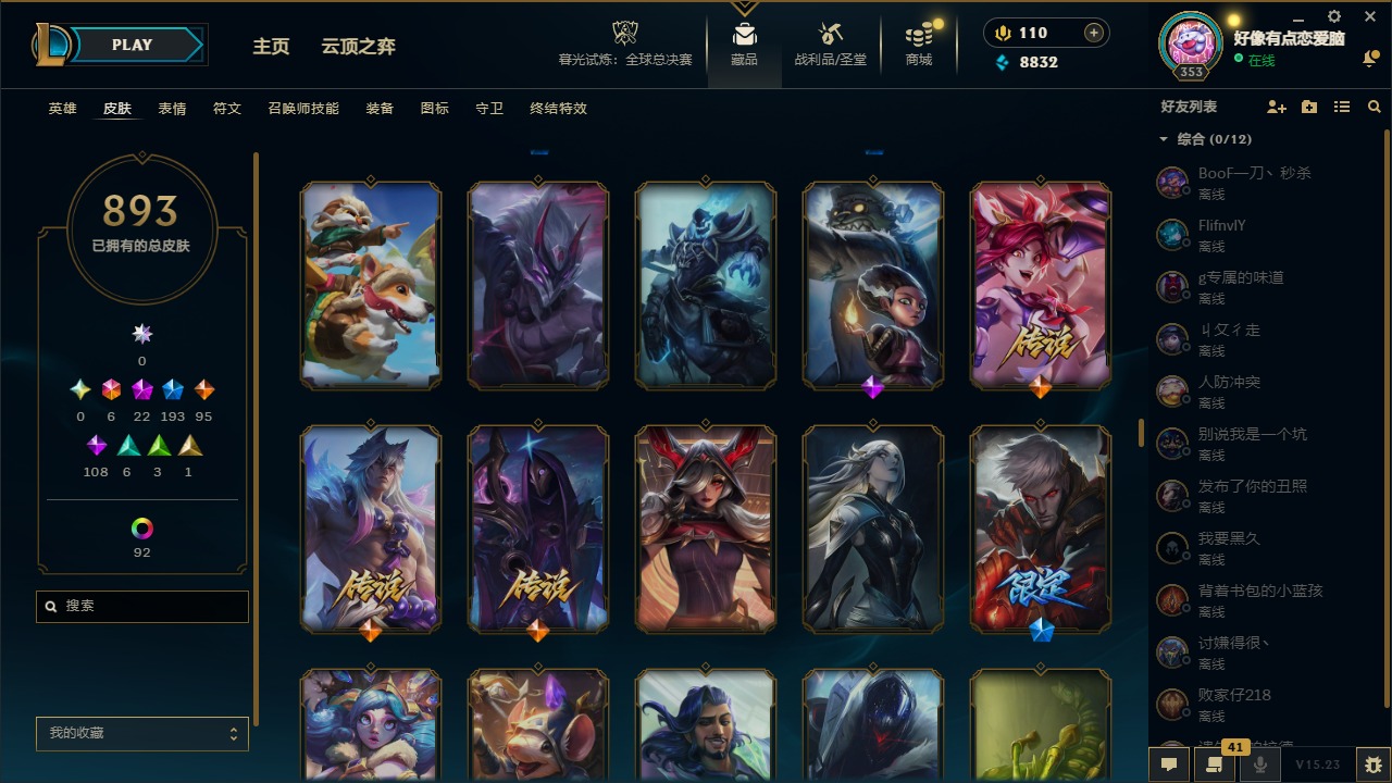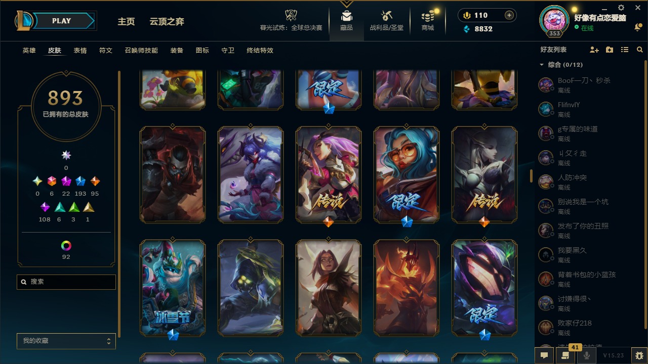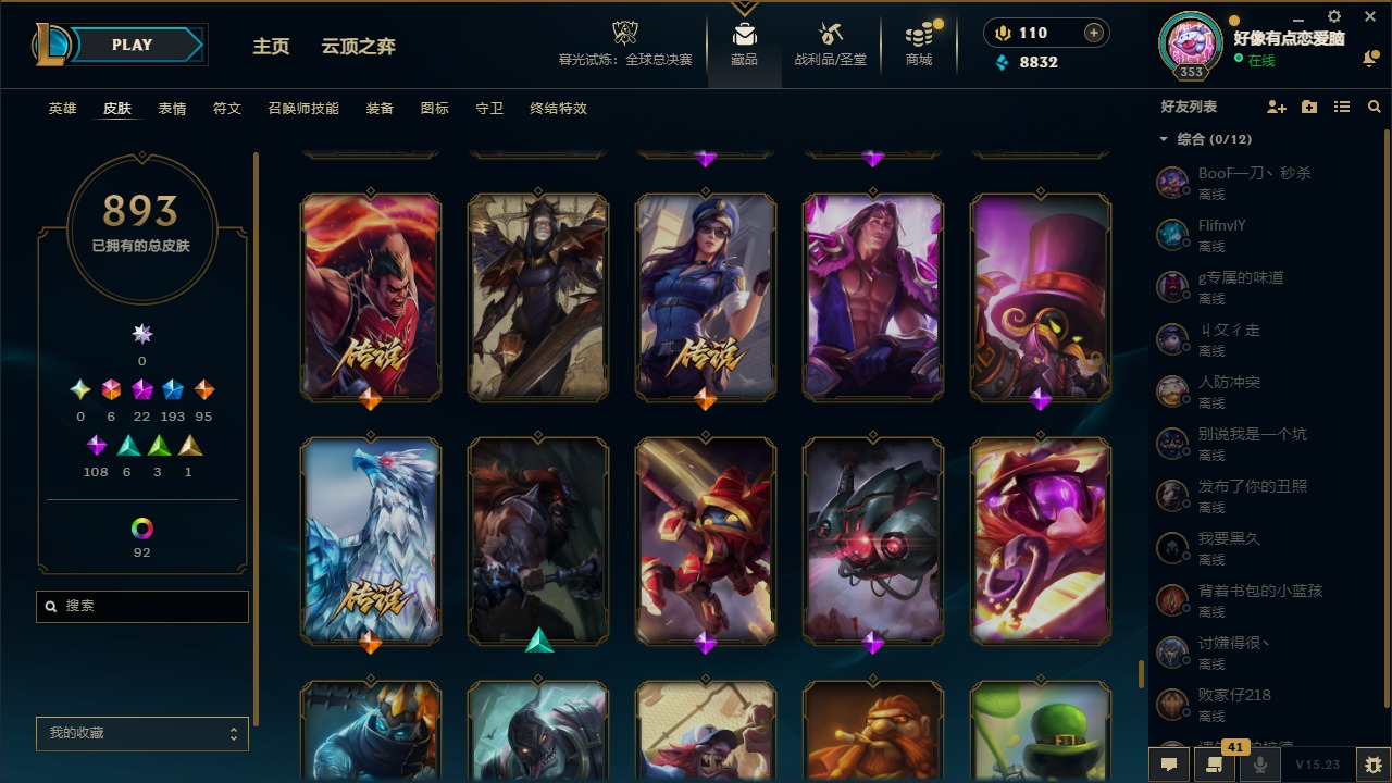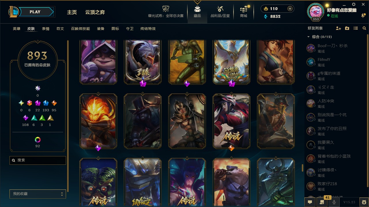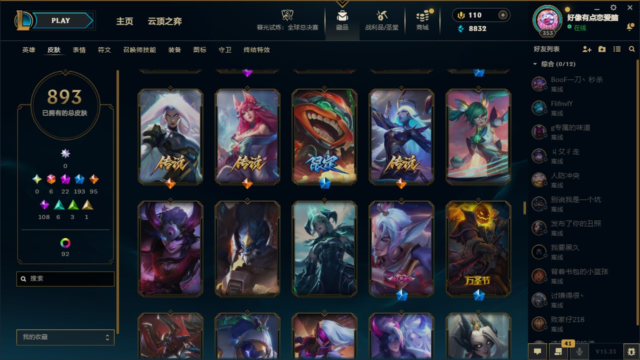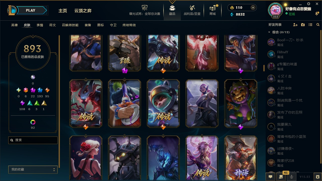 6终极 22神话 193限定 95传说 108史诗 893皮肤 128炫彩 170英雄 可二次 可修改实名 【至臻】:至臻 天龙之子 伊泽瑞尔至臻 心之钢 永恩至臻 墨之影武者 亚索至臻 k/da 卡莎至臻 魅惑女巫 厄运小姐至臻 真实伤害 奇亚娜至臻 真实伤害 赛娜至臻 暗星 墨菲