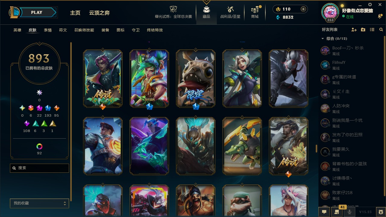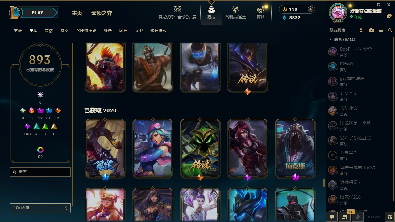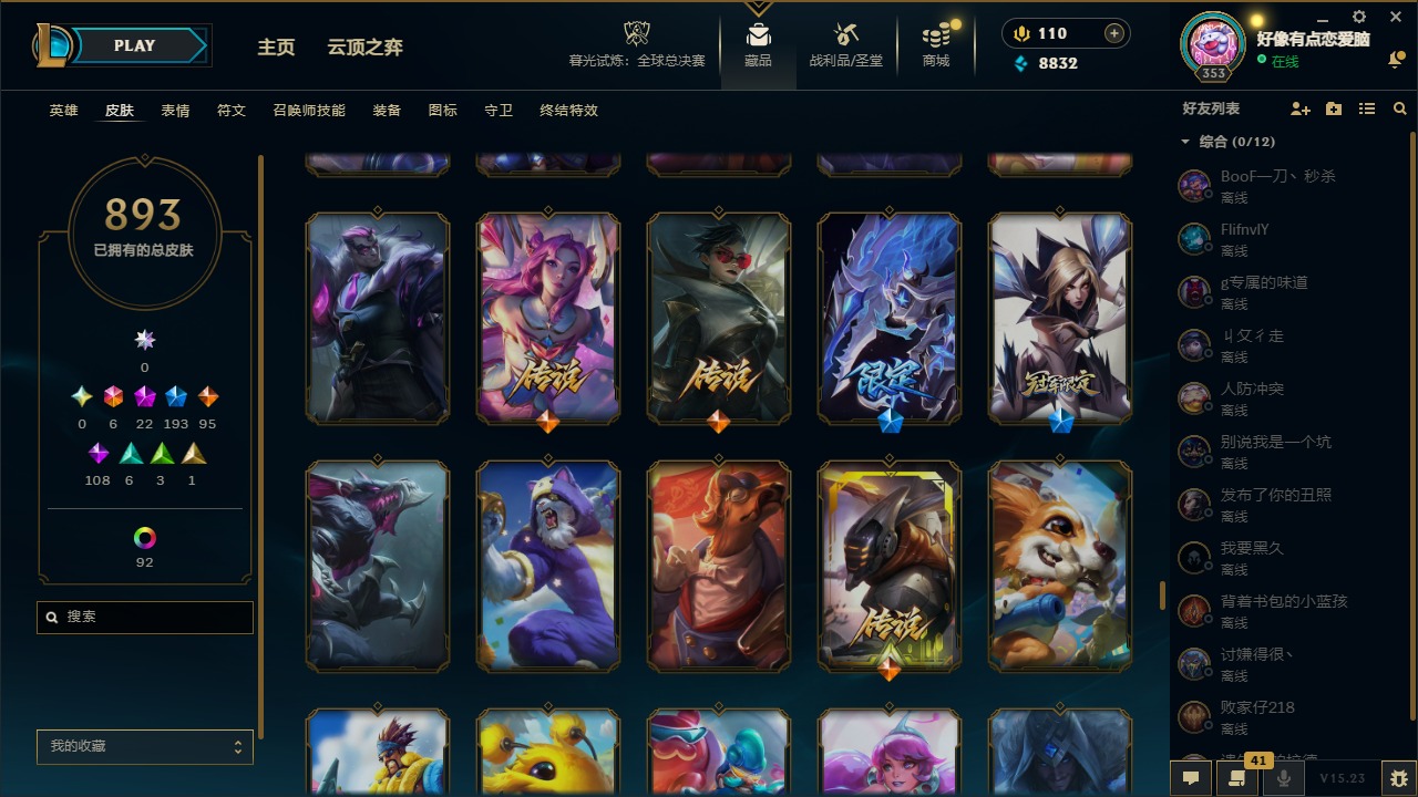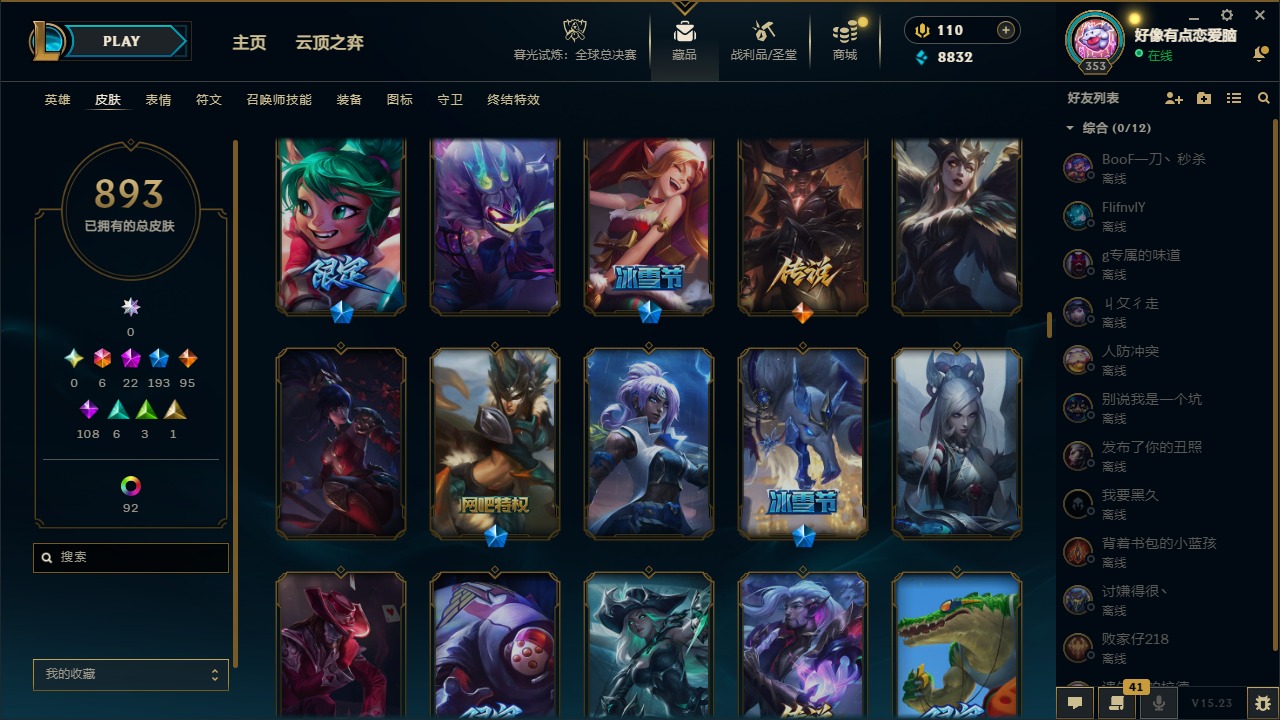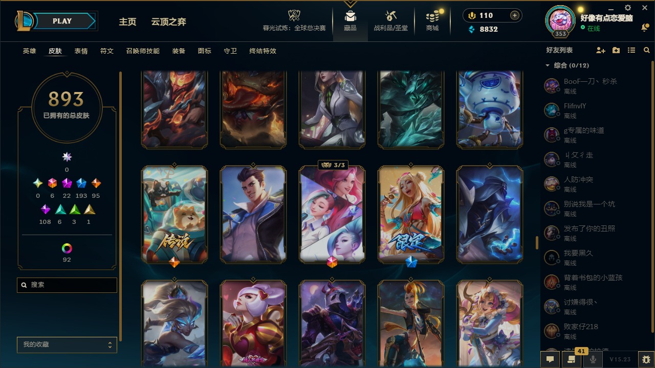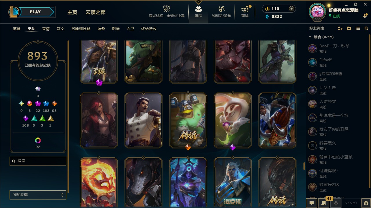 6终极 22神话 193限定 95传说 108史诗 893皮肤 128炫彩 170英雄 可二次 可修改实名 【至臻】:至臻 天龙之子 伊泽瑞尔至臻 心之钢 永恩至臻 墨之影武者 亚索至臻 k/da 卡莎至臻 魅惑女巫 厄运小姐至臻 真实伤害 奇亚娜至臻 真实伤害 赛娜至臻 暗星 墨菲