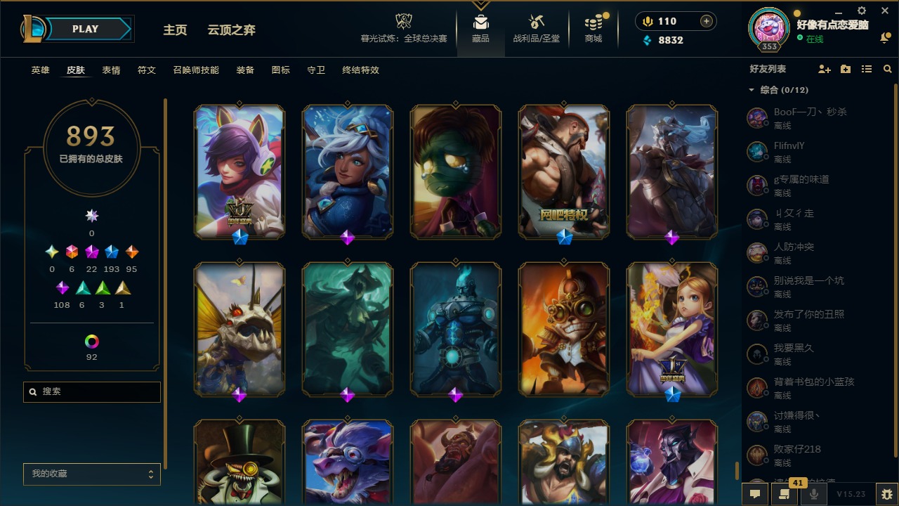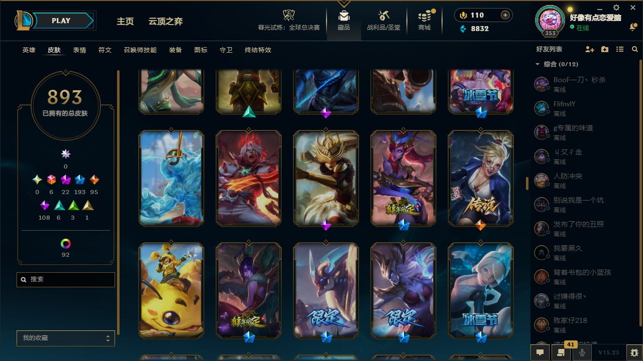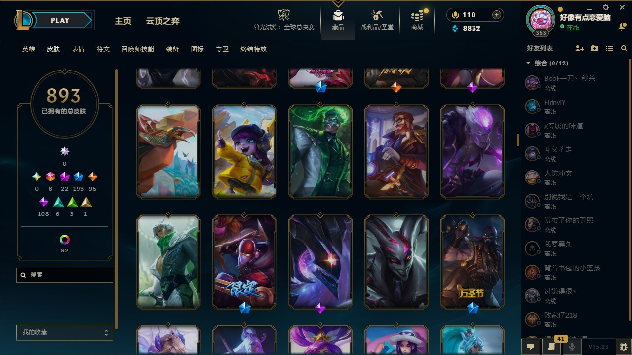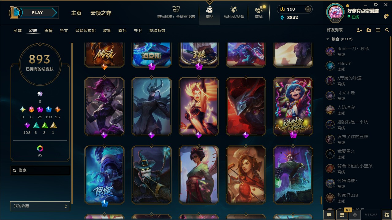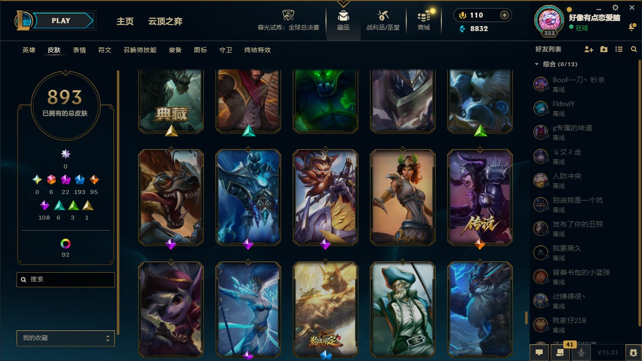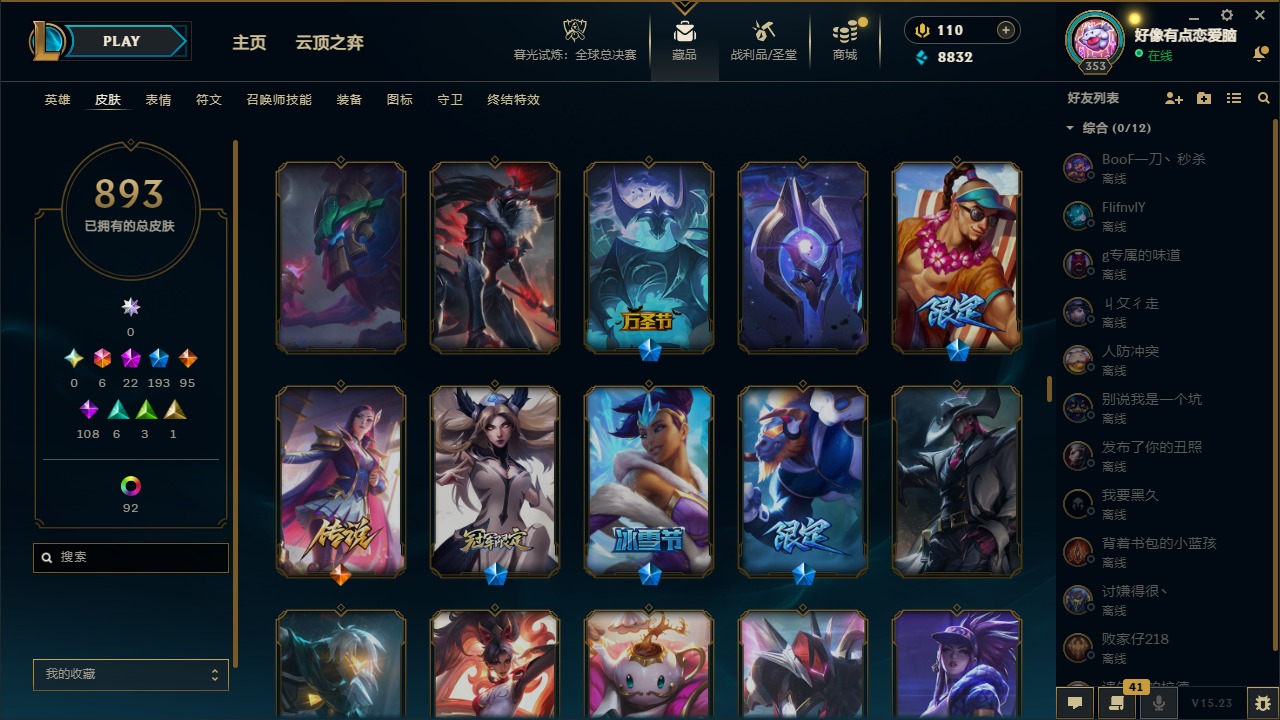 6终极 22神话 193限定 95传说 108史诗 893皮肤 128炫彩 170英雄 可二次 可修改实名 【至臻】:至臻 天龙之子 伊泽瑞尔至臻 心之钢 永恩至臻 墨之影武者 亚索至臻 k/da 卡莎至臻 魅惑女巫 厄运小姐至臻 真实伤害 奇亚娜至臻 真实伤害 赛娜至臻 暗星 墨菲